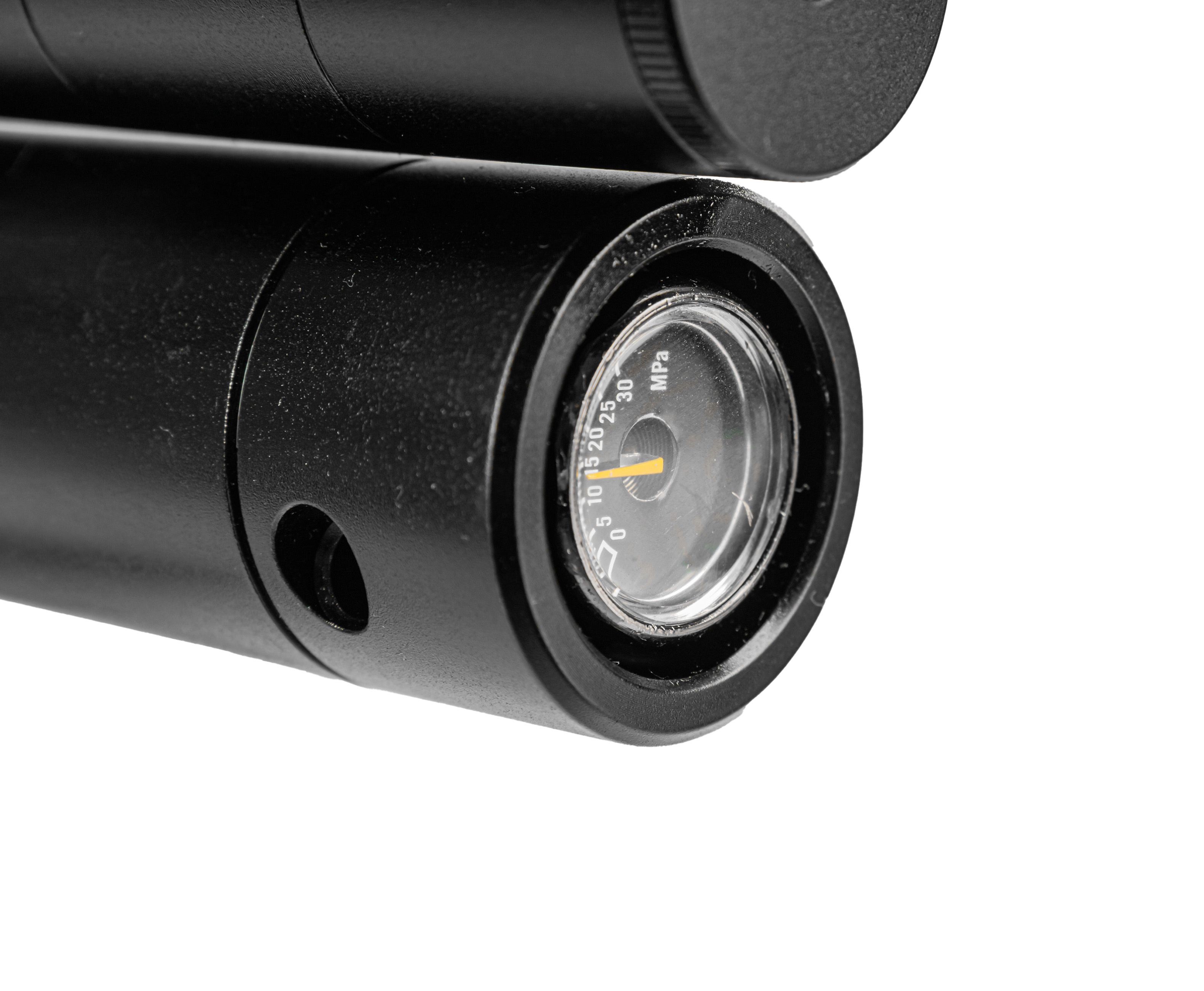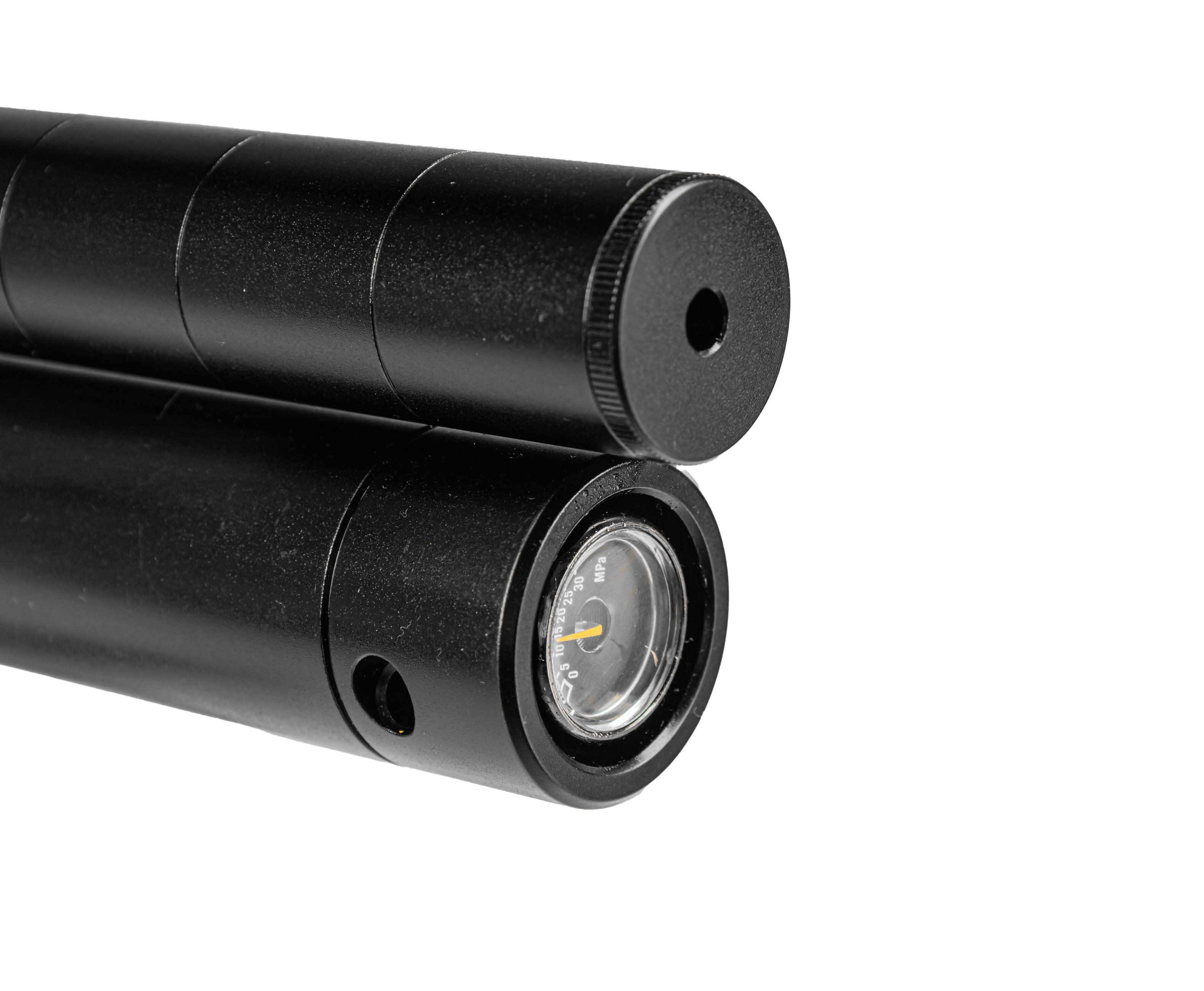 Образец оборудован ресивером традиционной цилиндрической формы емкостью 278 куб. см. Мониторинг текущего уровня заполненности выполняется через встроенный в торец резервуара измерительный прибор в виде манометра - рядом расположен заправочный порт, к которому через штуцер подсоединяют шланг насоса.