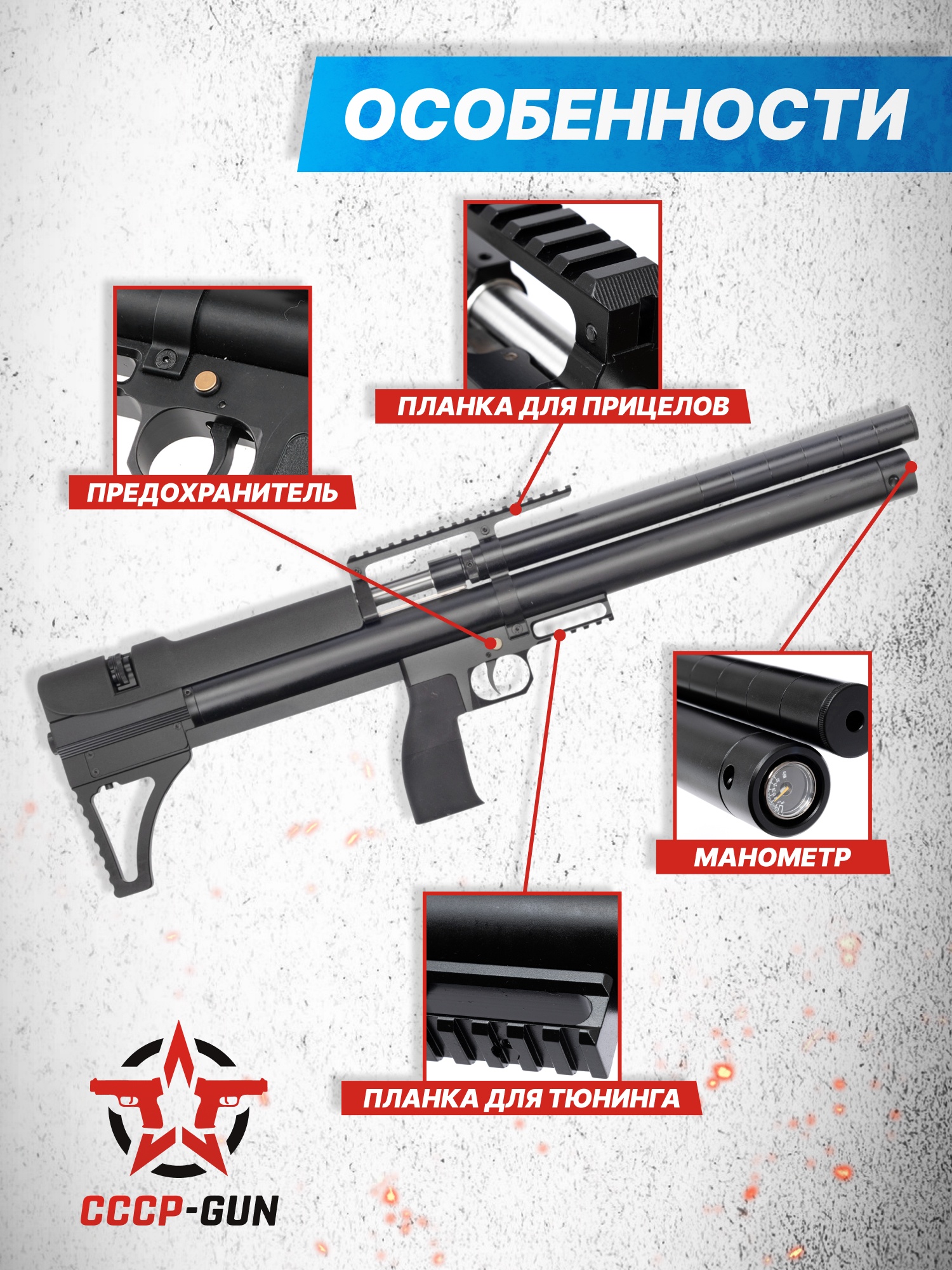 Одной из важнейших особенностей винтовки является встроенный редуктор, обеспечивающий постоянное давление при каждом выстреле. Это помогает сохранять неизменной скорость полета снарядов и увеличивает кучность. Такие параметры необходимы при стрельбе по мишеням на результат.