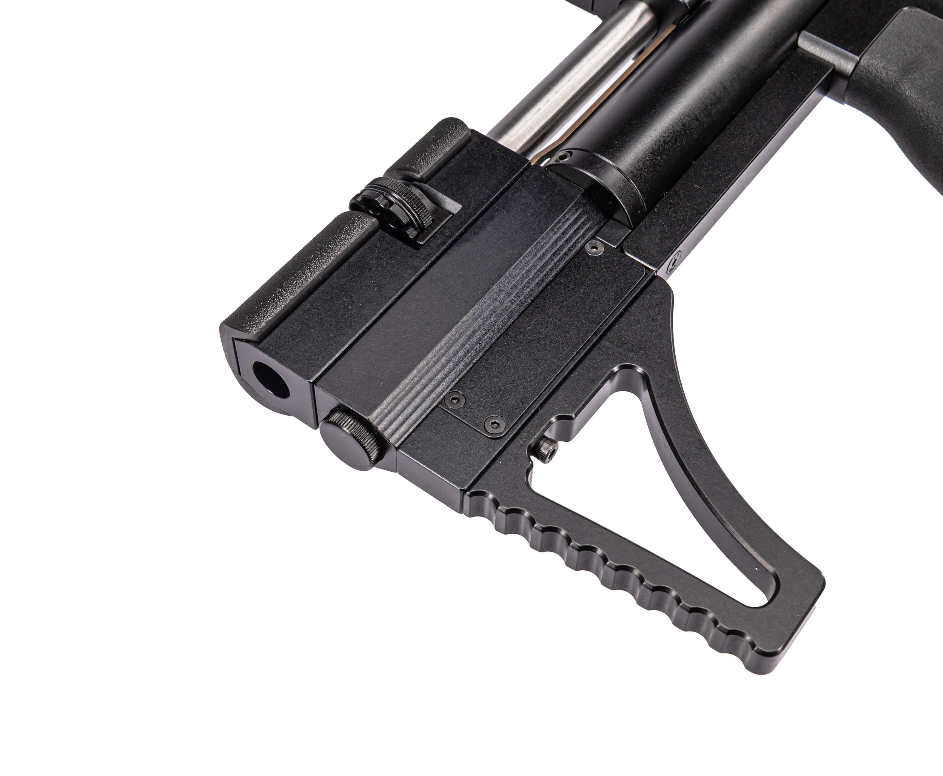 Ложе выполнено из крепкой дюрали - легкого и прочного сплава. Укороченная компоновка делает винтовку комфортной для работы в стесненном пространстве или при транспортировке. Эргономичная пистолетная рукоять дает плотный хват, а общий вес 2.5 кг позволяет использовать изделие в течение продолжительного времени без переутомлений.