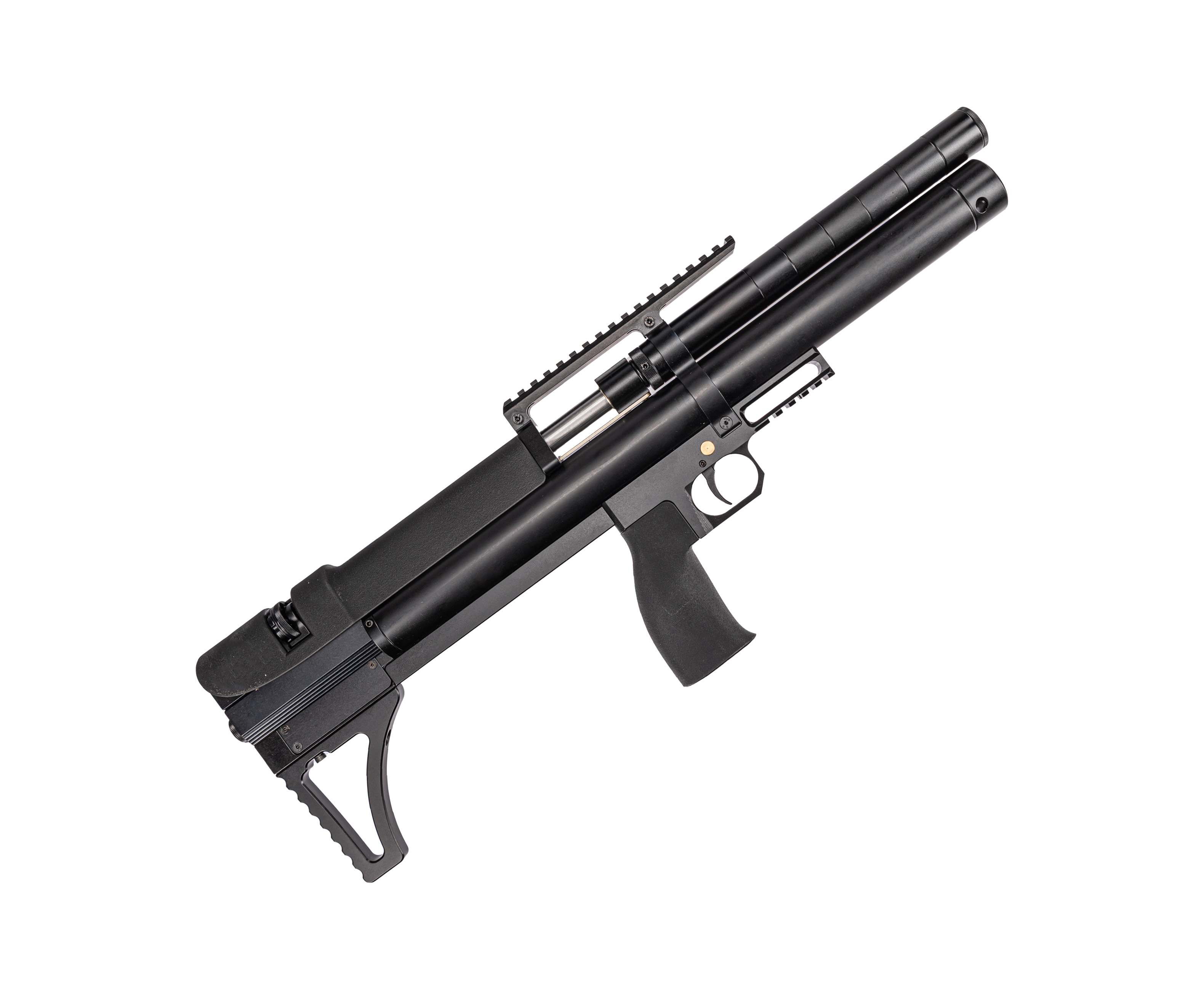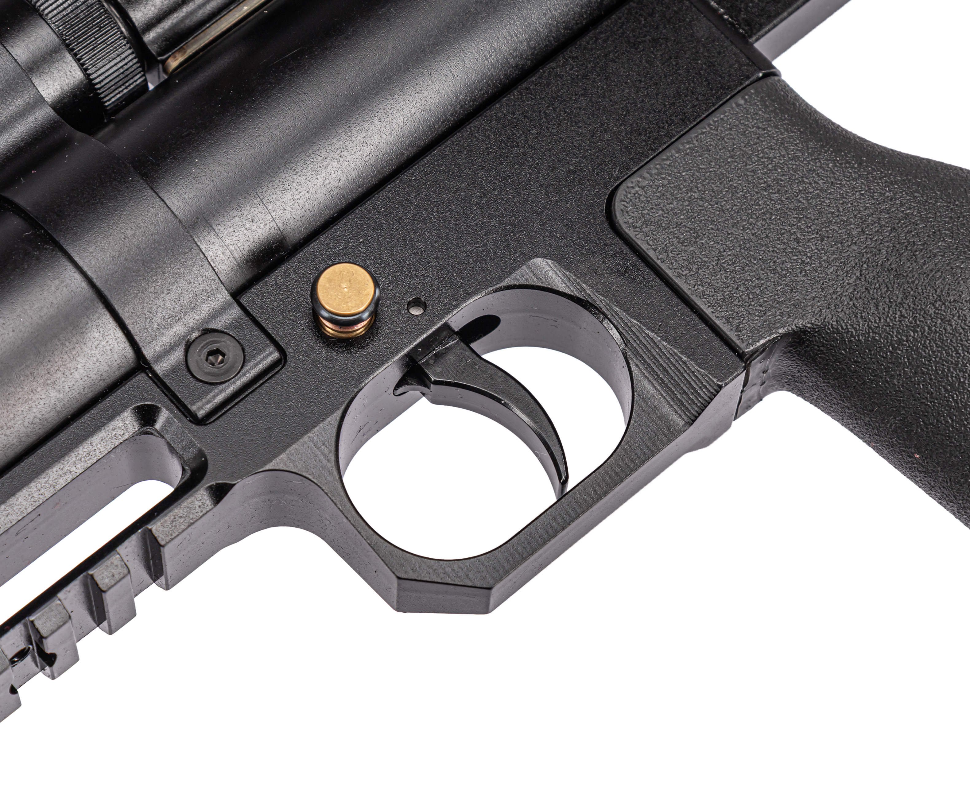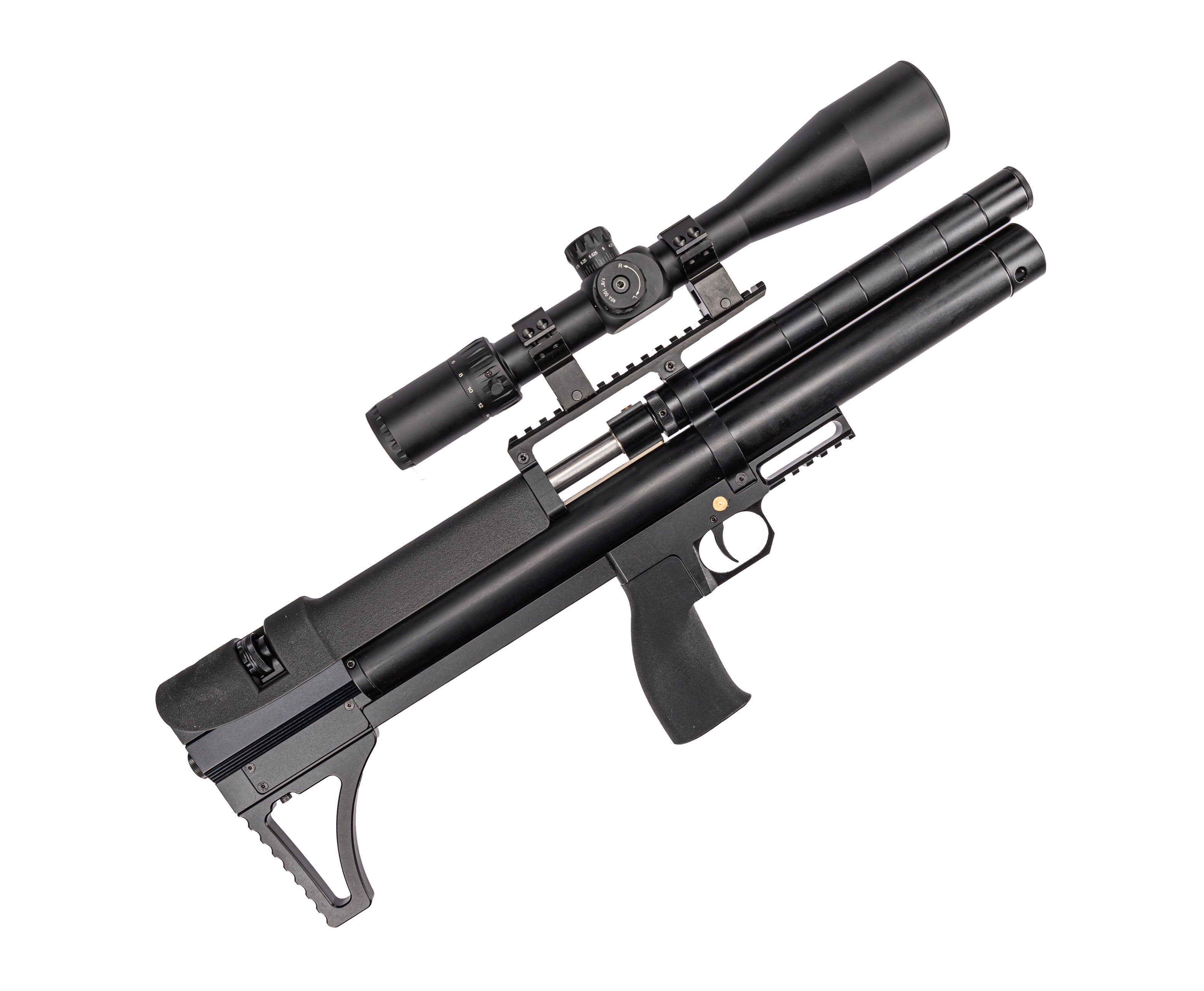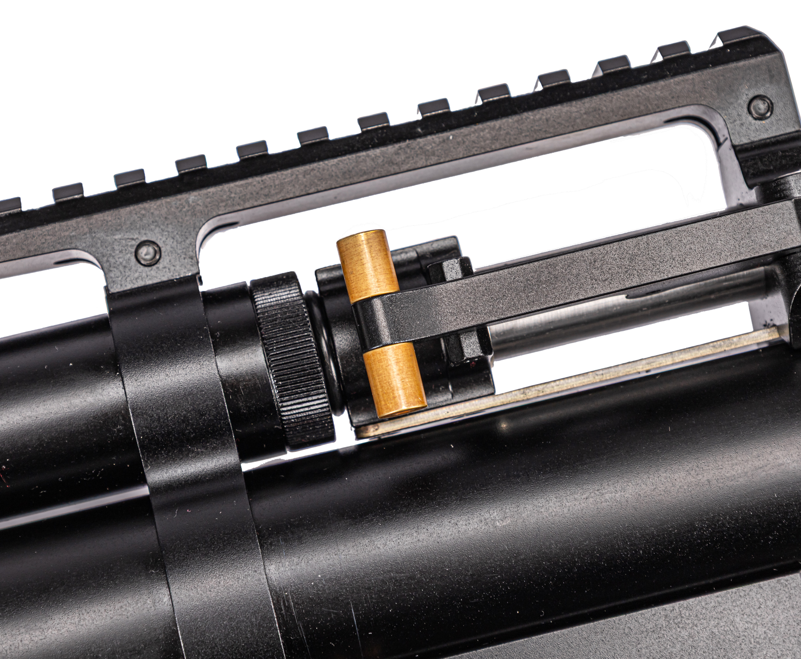 В основе конструкции платформы лежит PCP система с установленным редуктором, который поддерживает стабильное давление от выстрела к выстрелу независимо от остатка воздуха в ресивере. Такой подход делает кучность плотнее.