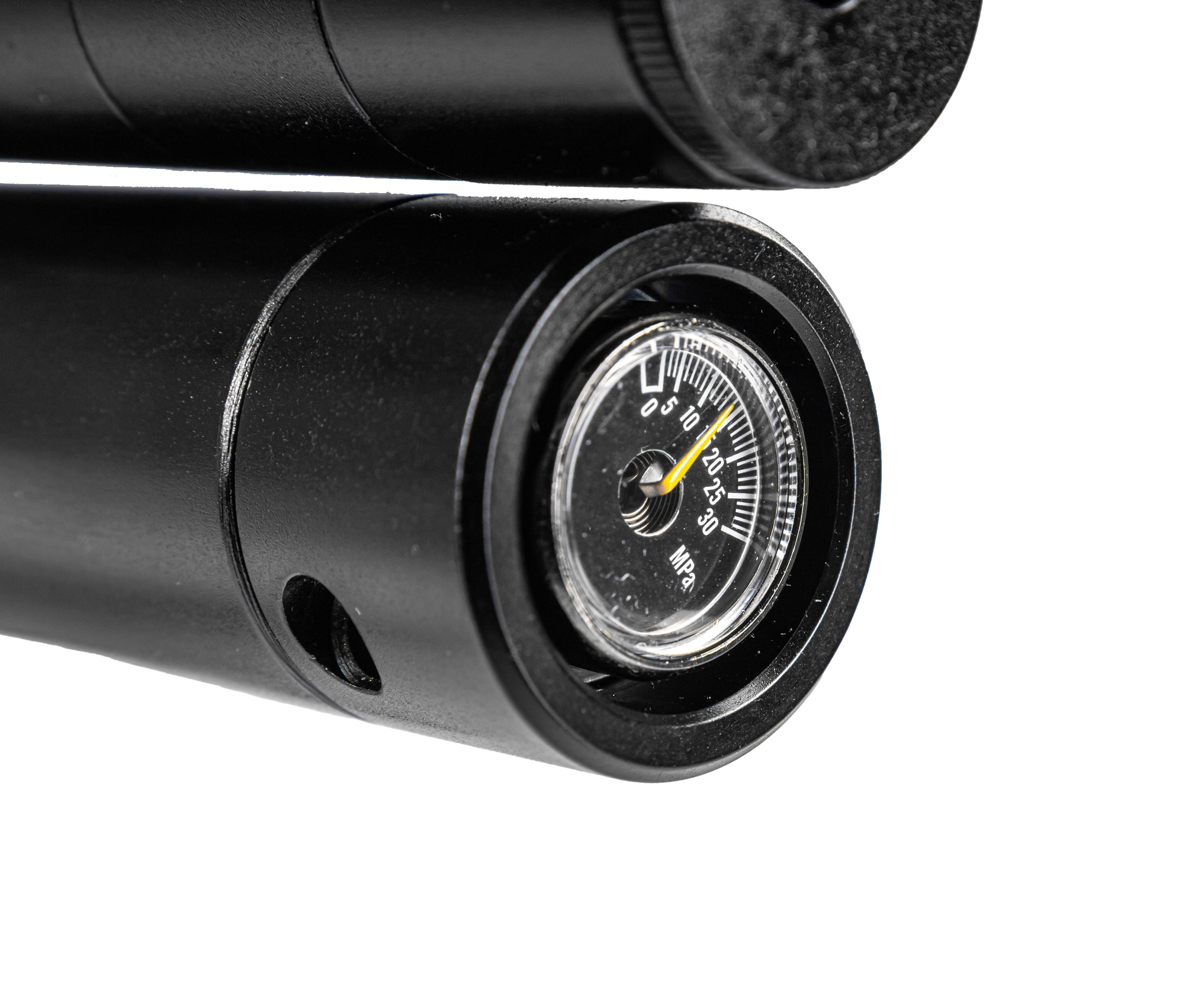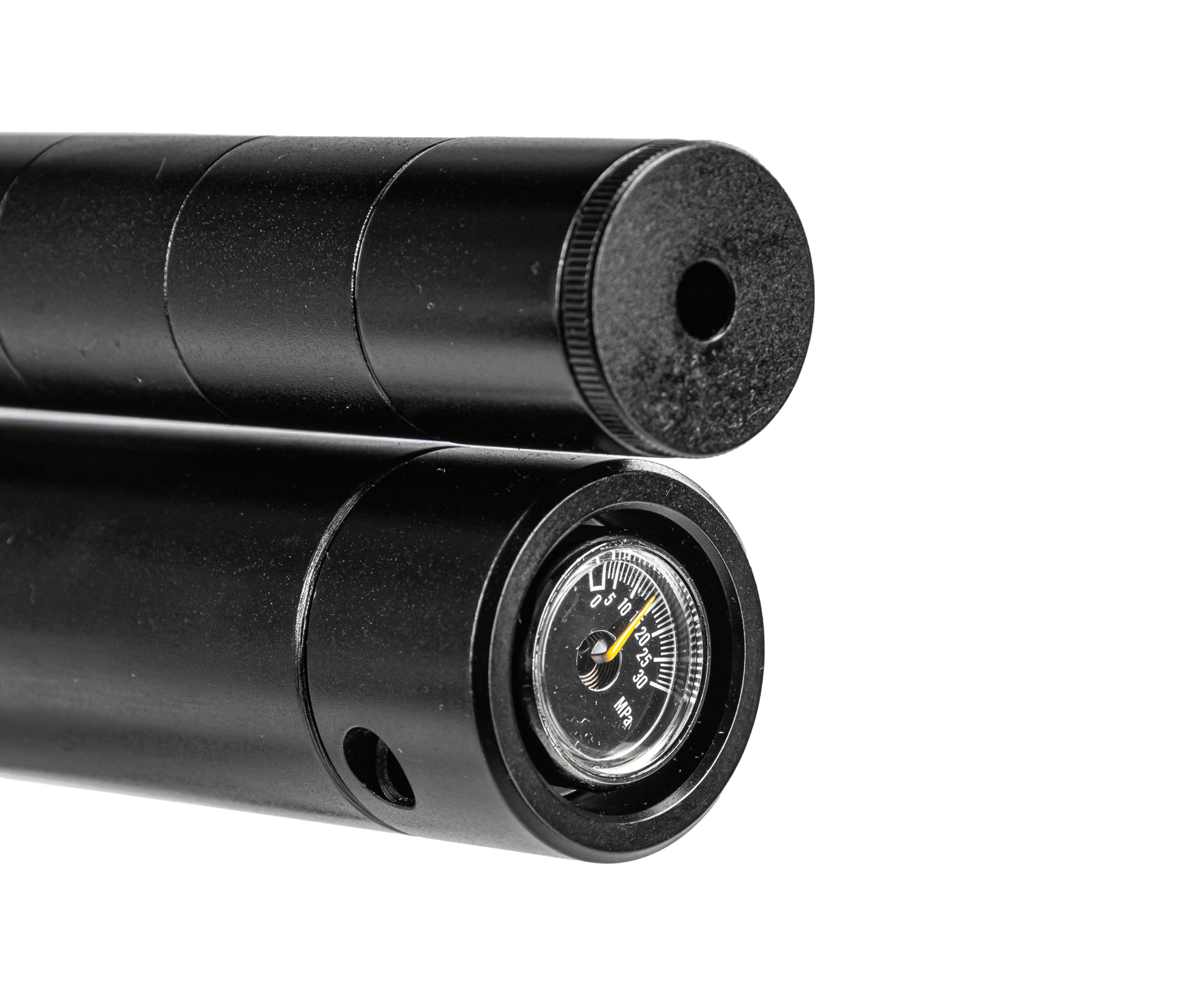 Рабочее давление в баллоне составляет до 250 Бар, а показатели контролируются штатным манометром, расположенным в передней части платформы, с ее торца. Объем ресивера - 278 куб. см, без учета редуктора - механизм занял часть пространства в резервуаре. Такие характеристики позволяют провести продолжительную стрелковую сессию, если полностью заправить устройство газом.
