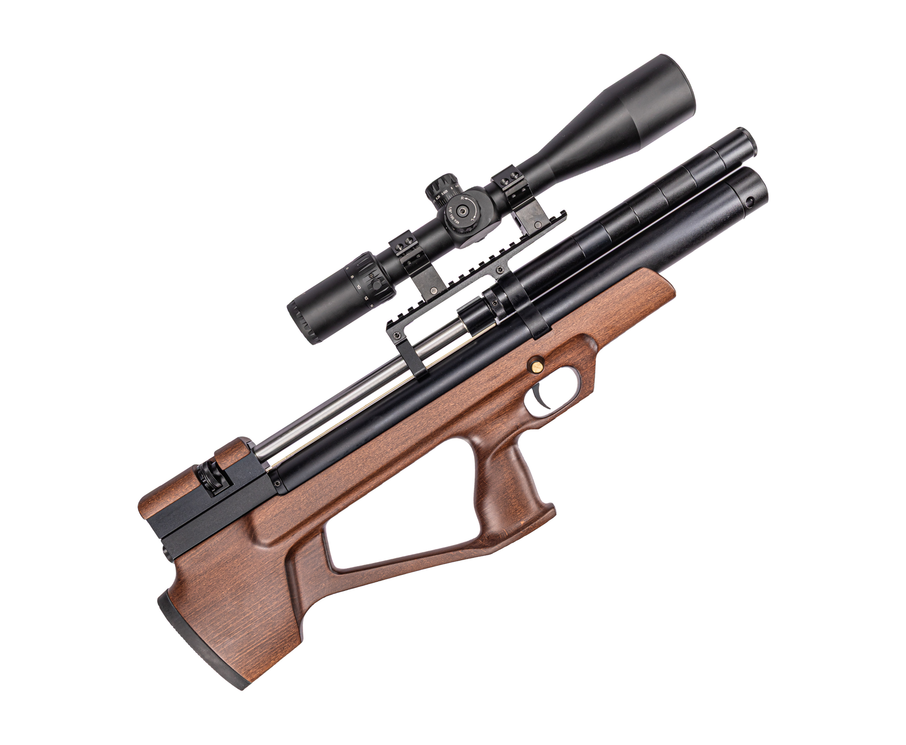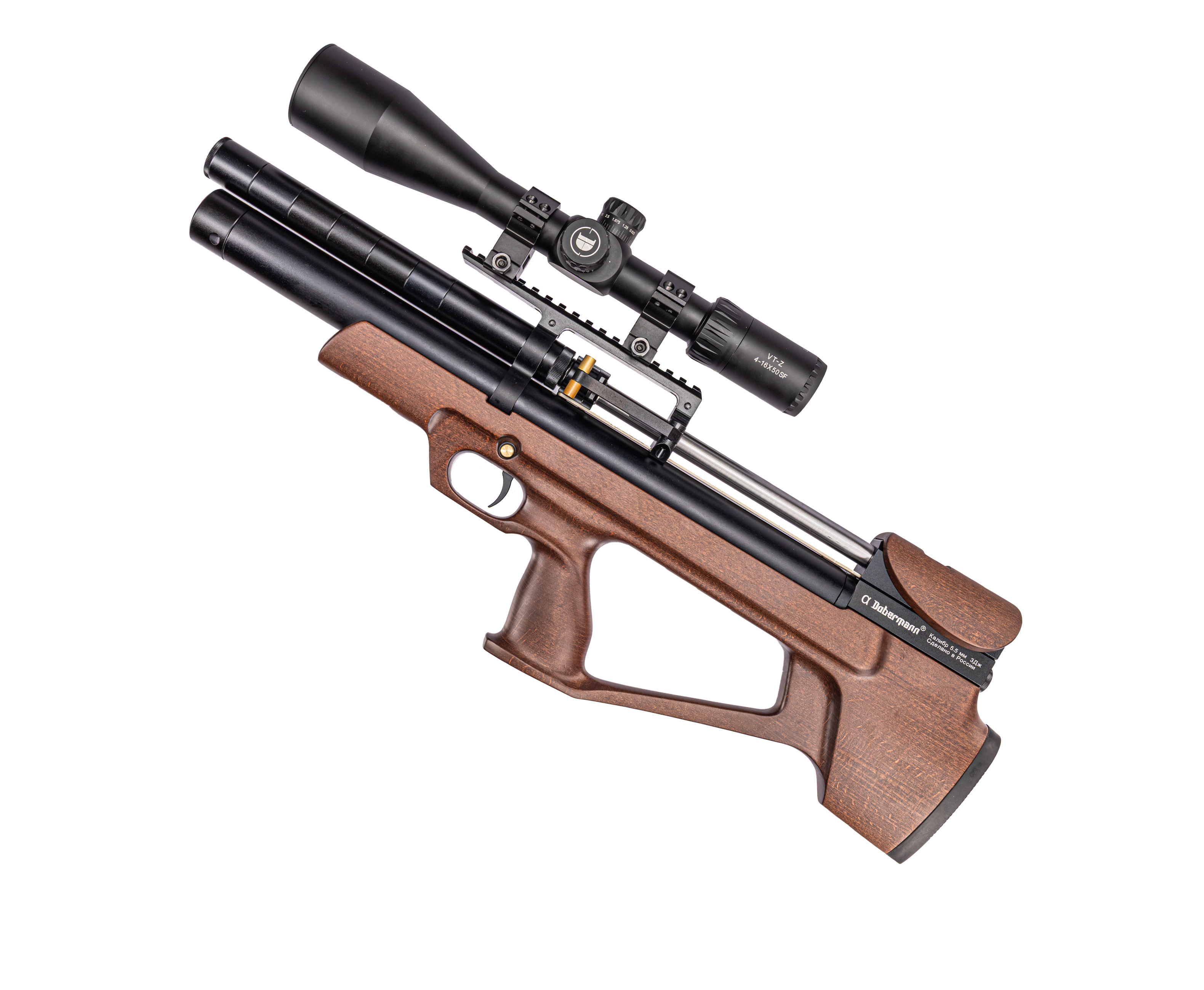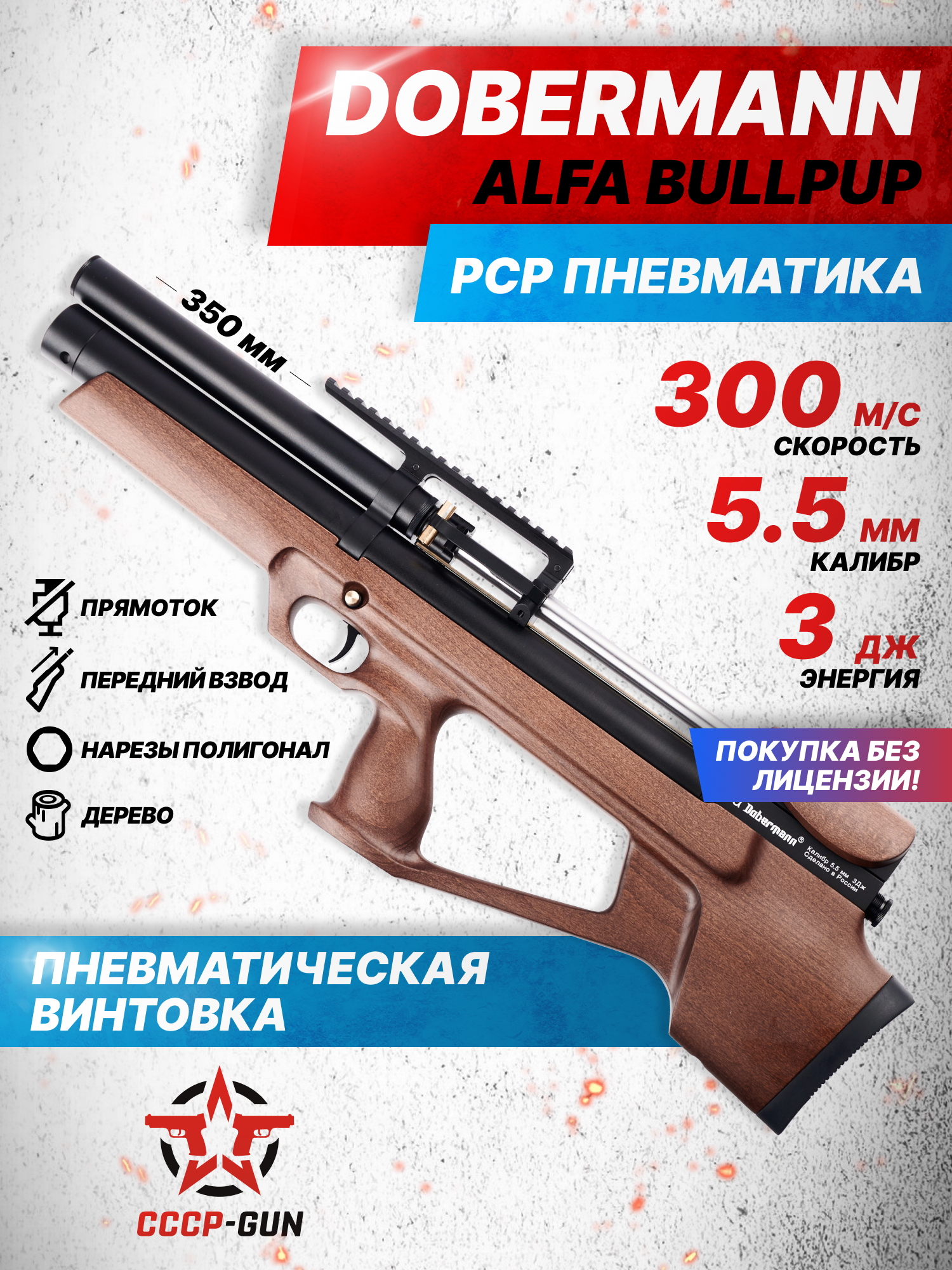 Одной из таких разработок стала рассматриваемая пневматическая винтовка Alfa Dobermann 350 Bull-Pup. Она построена по схеме PCP прямоточного типа. Такой принцип работы наделяет изделие повышенной дульной энергией, поскольку давление не регулируется вспомогательными узлами.