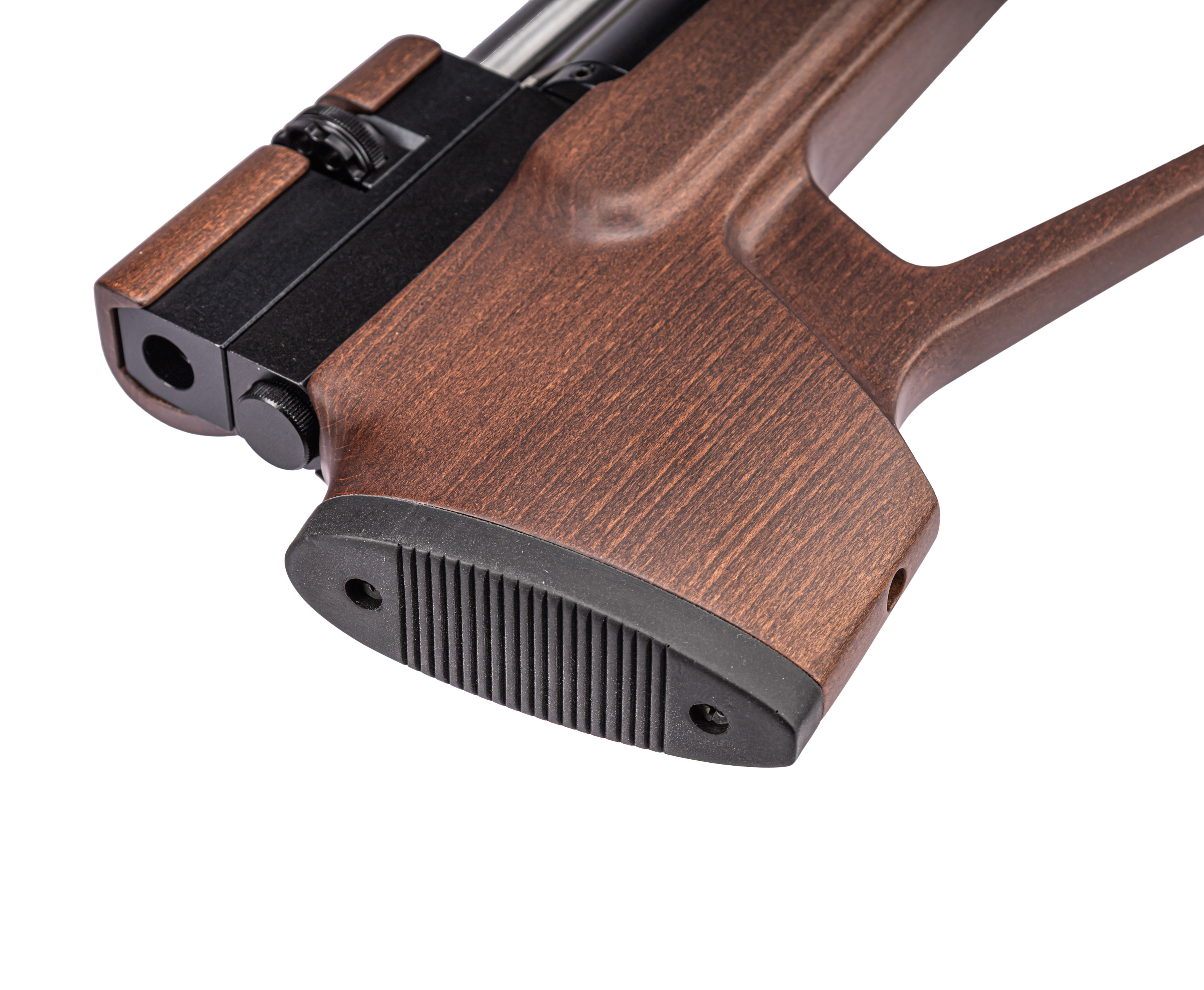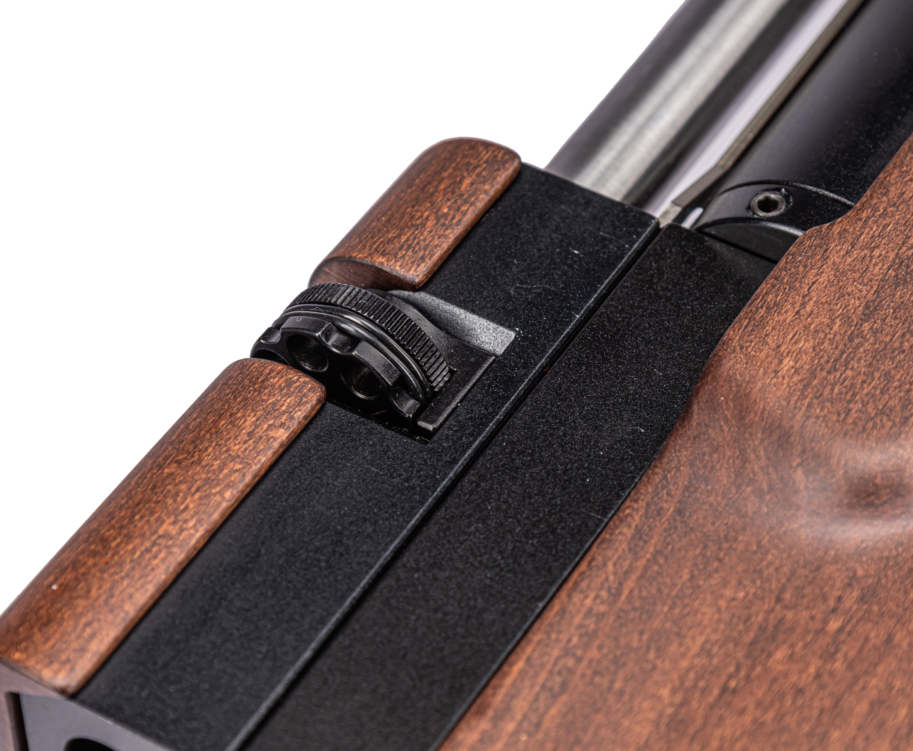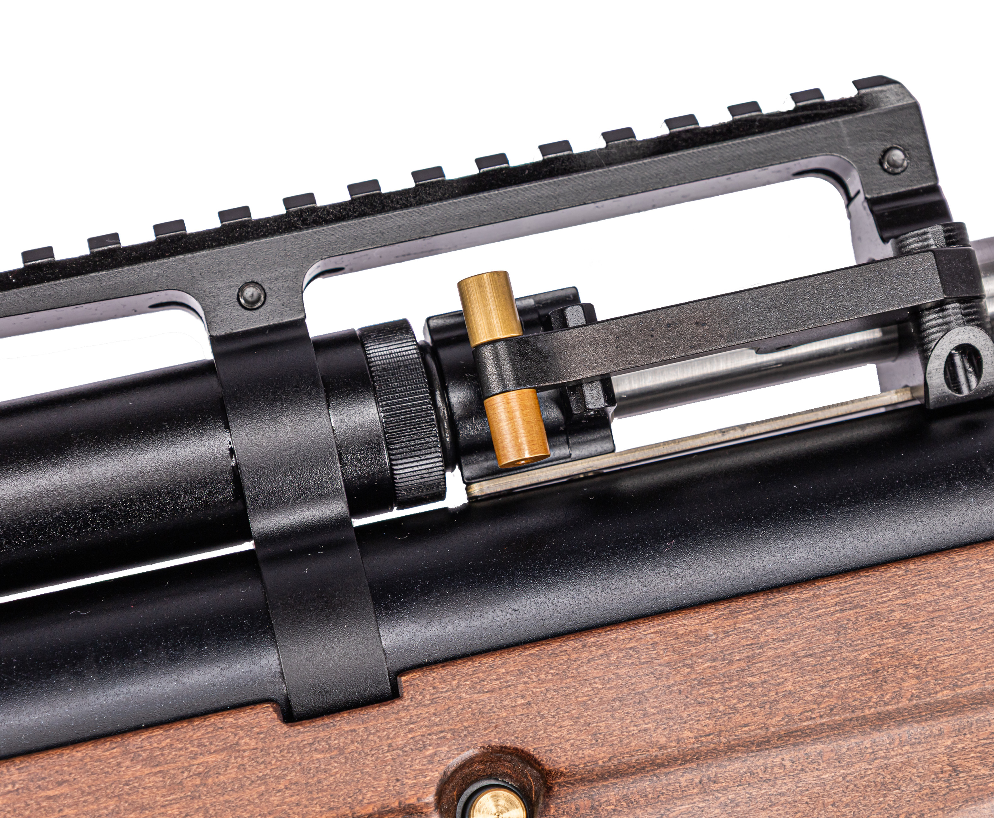 Источником энергии в Альфа Доберман PCP является резервуар объемом 278 куб. см, рассчитанный на рабочее давление до 250 Бар. Вместимости баллона хватит на полноценное занятие стрельбой. Для контроля остатка воздуха в ресивере винтовка оснащена штатным манометром.
