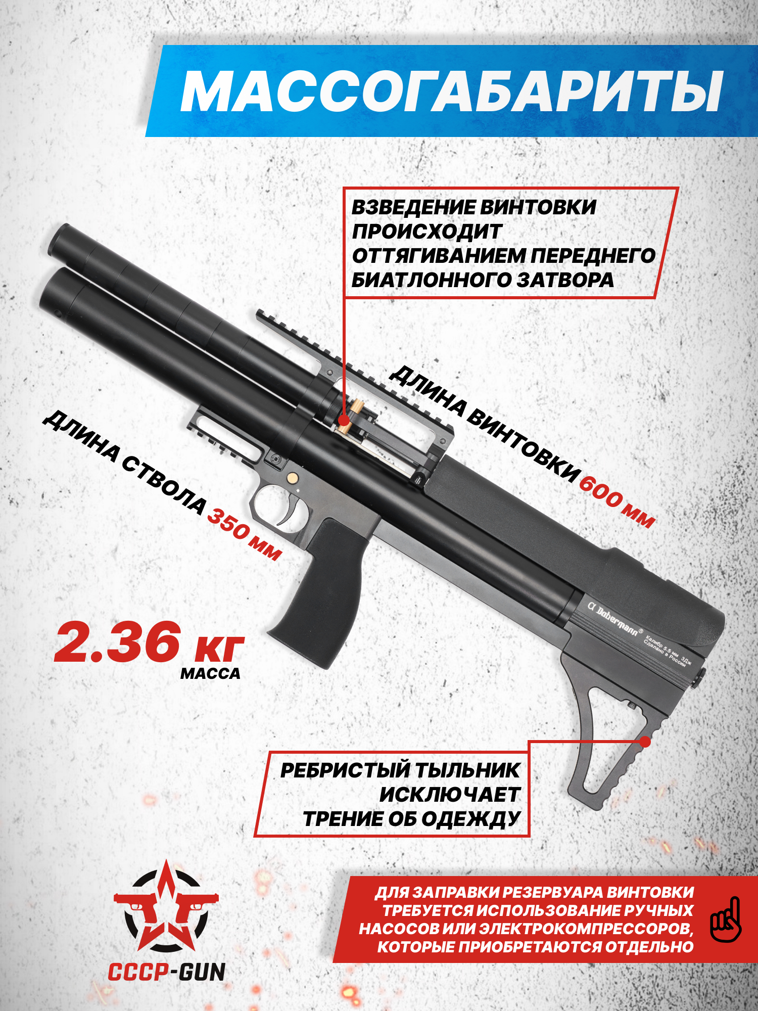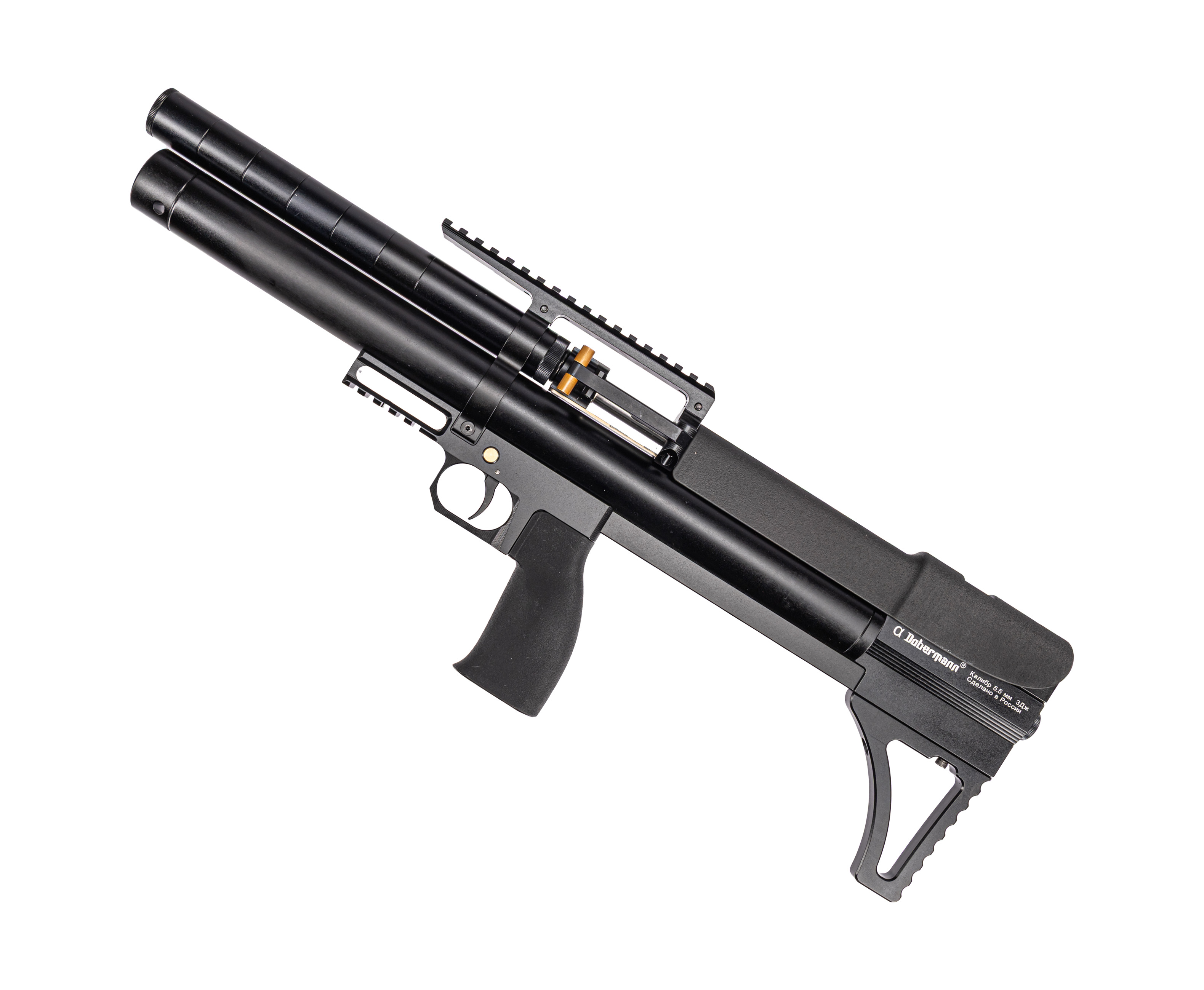 Полная длина Альфа Доберман РСР 5.5 - 600 мм. Такой размер особенно удобен при стрельбе в ограниченных условиях - с импровизированных укрытий или в помещениях. Вес конструкции - 2.36 кг, а центр тяжести смещен ближе к прикладу, что сохраняет баланс между устойчивостью и мобильностью.