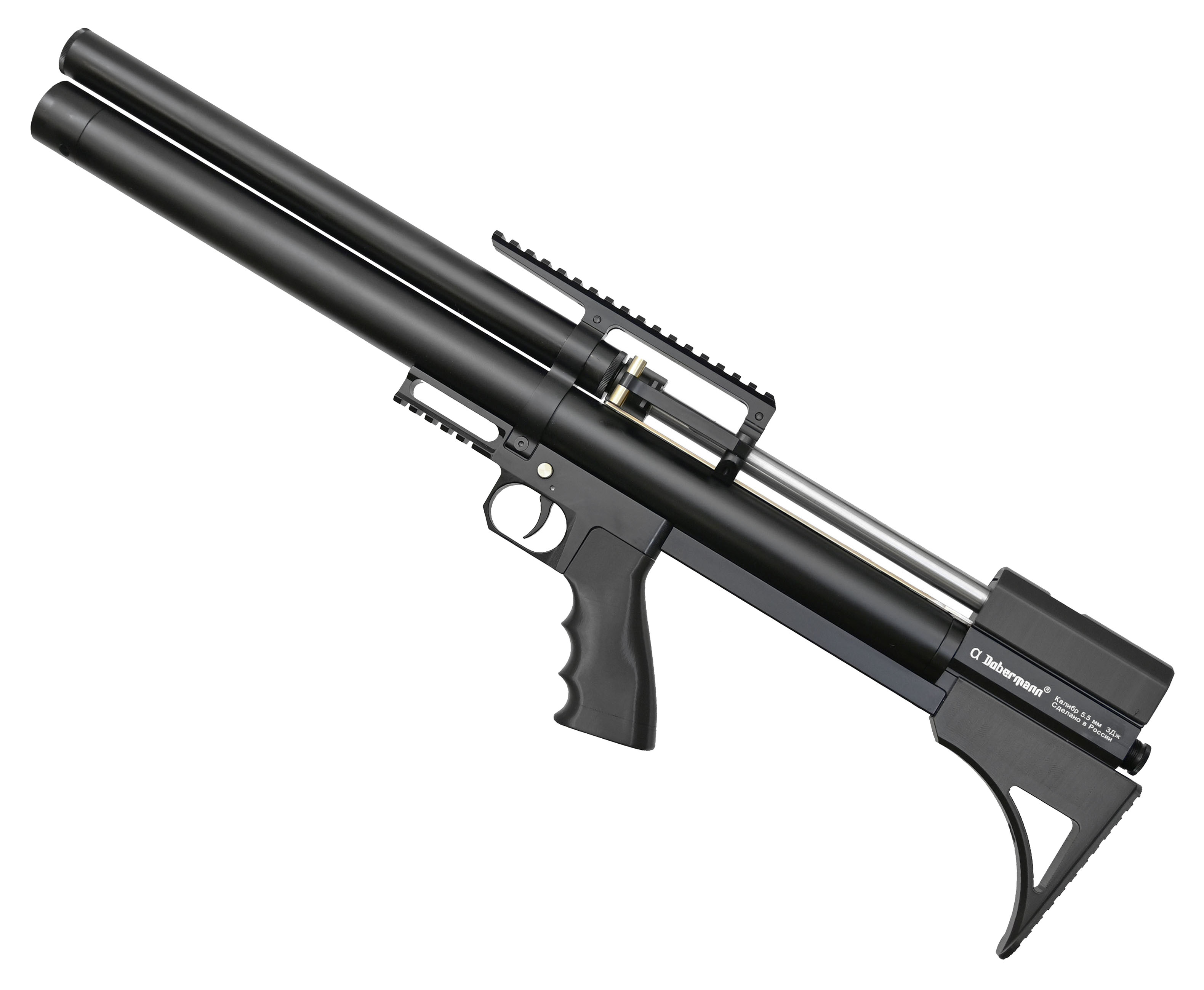 Рабочее давление в штатном ресивере изделия может достигать 300 Бар, при этом объем резервуара составляет 345 куб. см, без учета редуктора. Контроль показателей для последующей дозаправки осуществляется через встроенный манометр. Он расположен в передней части баллона, на его торце.