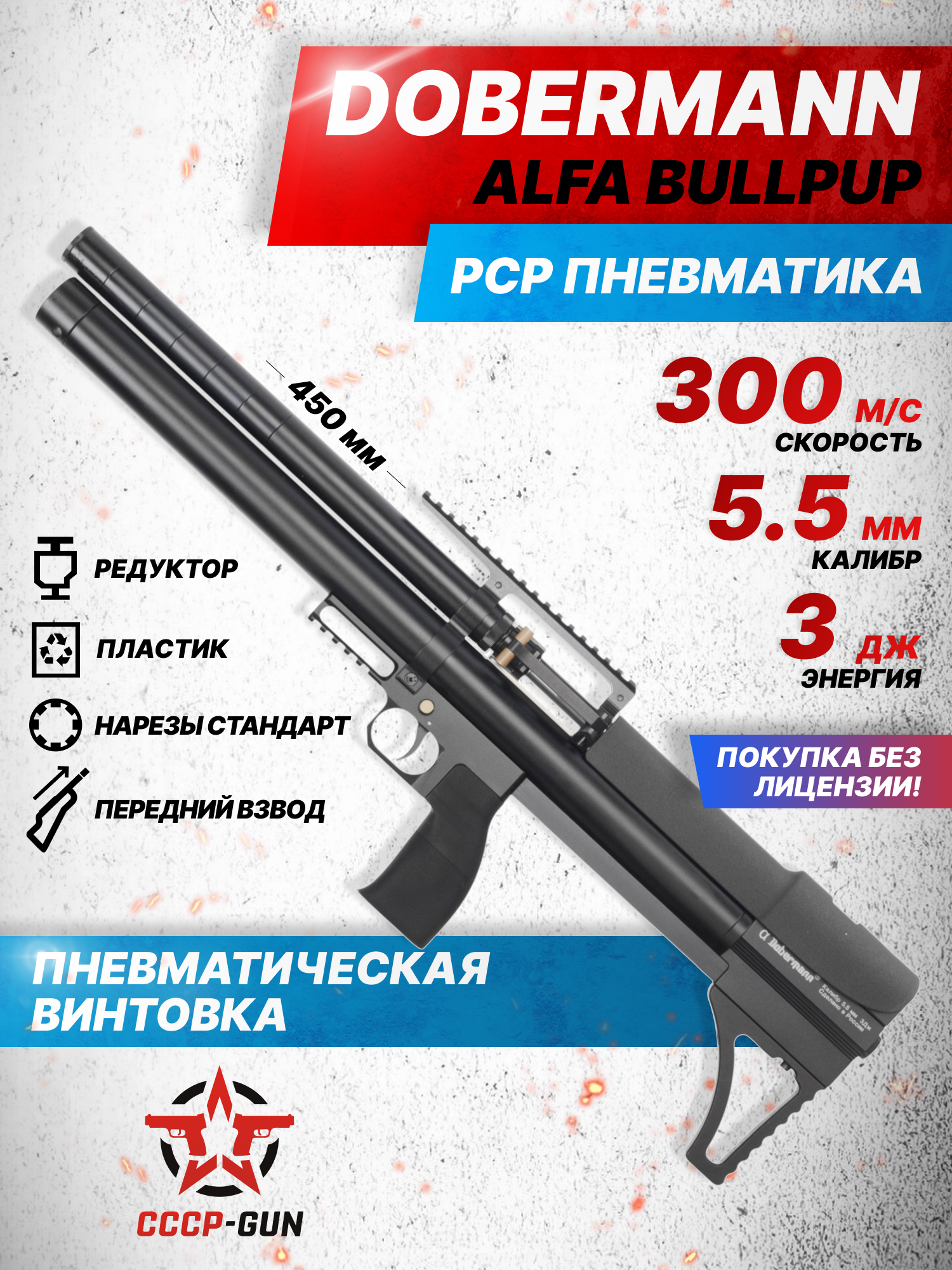 Российский производитель Dobermann специализируется на создании технологичных пневматических винтовок, рассчитанных на уверенную стрельбу при компактных габаритах. Главный акцент компания делает на точную механику, качественные материалы и продуманную эргономику, подходящую как для опытных стрелков, так и для начинающих. Каждый экземпляр линейки изготовителя выделяется своей надежностью и возможностью тюнинга, а Dobermann Alfa калибра 5.5 мм - одна из ключевых моделей бренда, объединяющая в себе PCP схему и укороченную Булл-Пап компоновку.