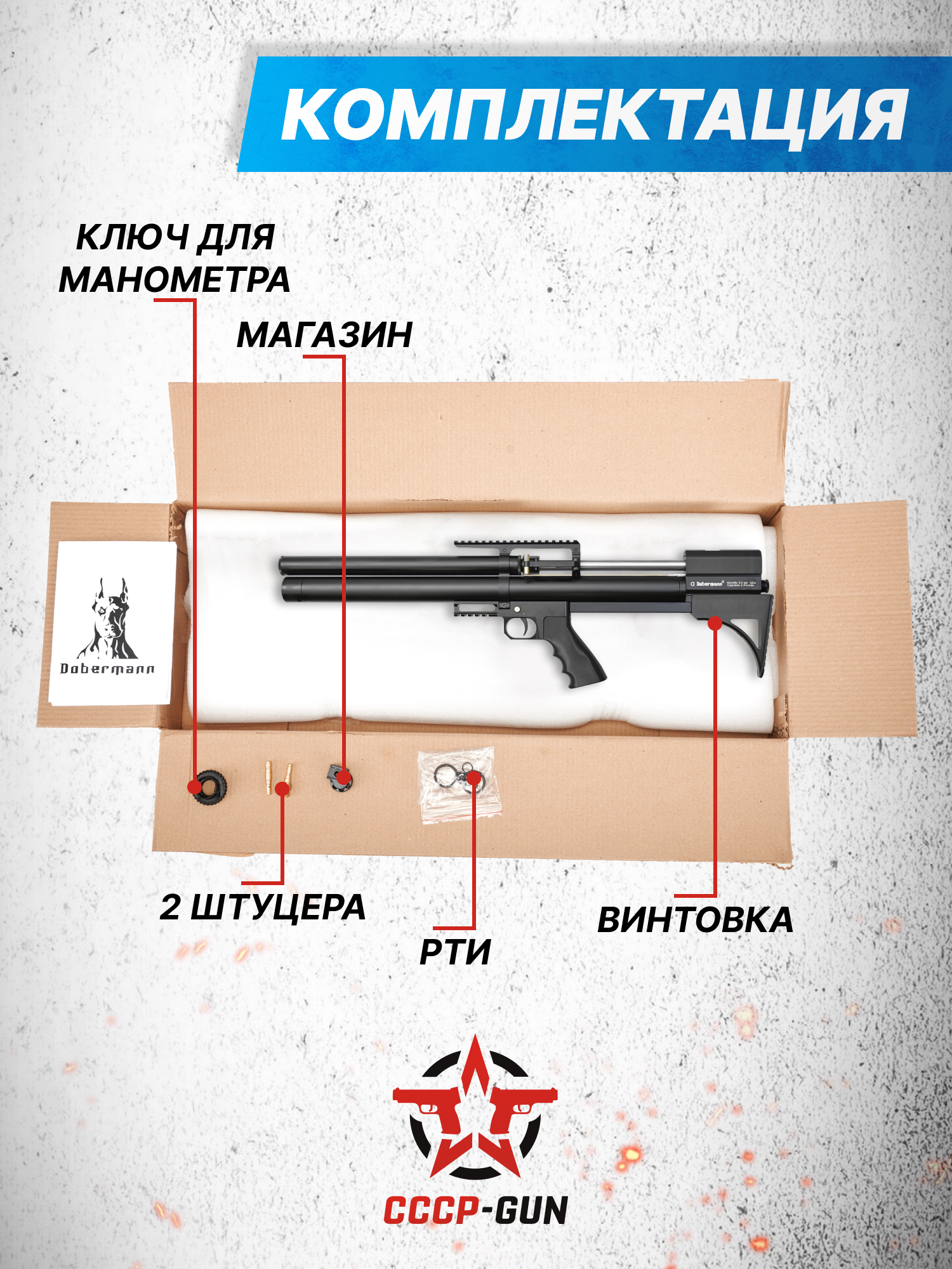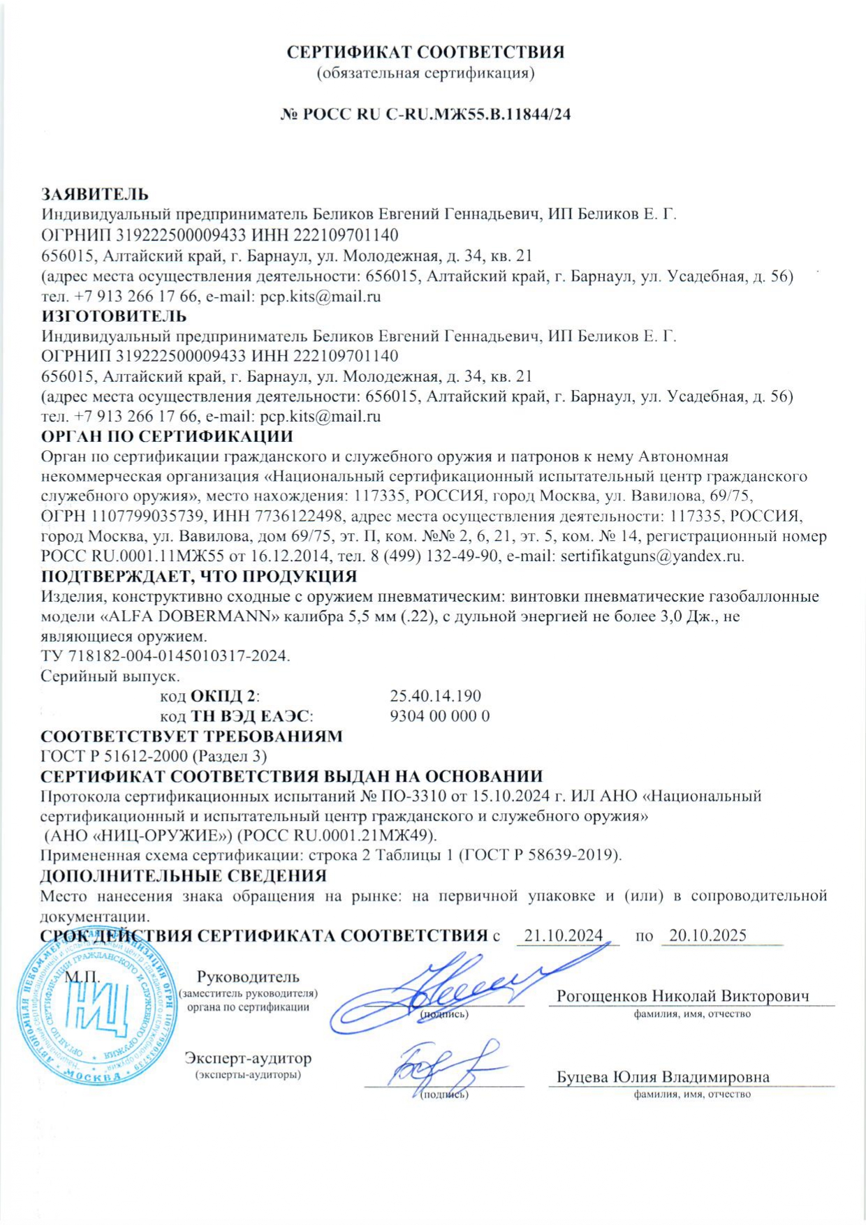 На территории России винтовки Dobermann Alfa продаются свободно за счет того, что производитель выпускает пневматику с штатной дульной энергией до 3 Дж. По этой причине для покупки обозреваемого экземпляра пользователю понадобится только паспорт, а оформлять разрешение на оружие в Росгвардии не придется. Конструкторы компании позаботились о безопасном режиме в пневматике и добавили над спусковым крючком кнопочный предохранитель.