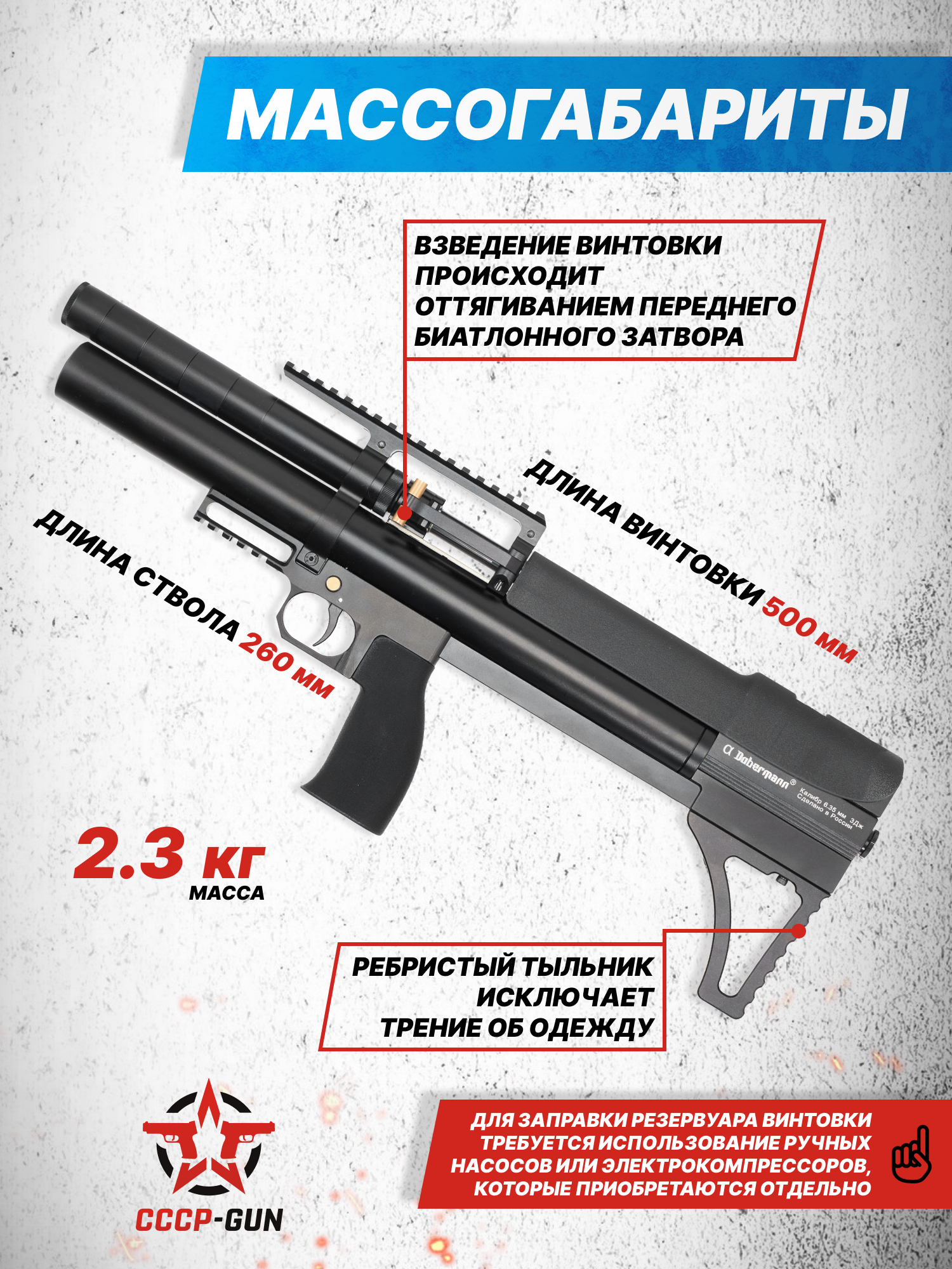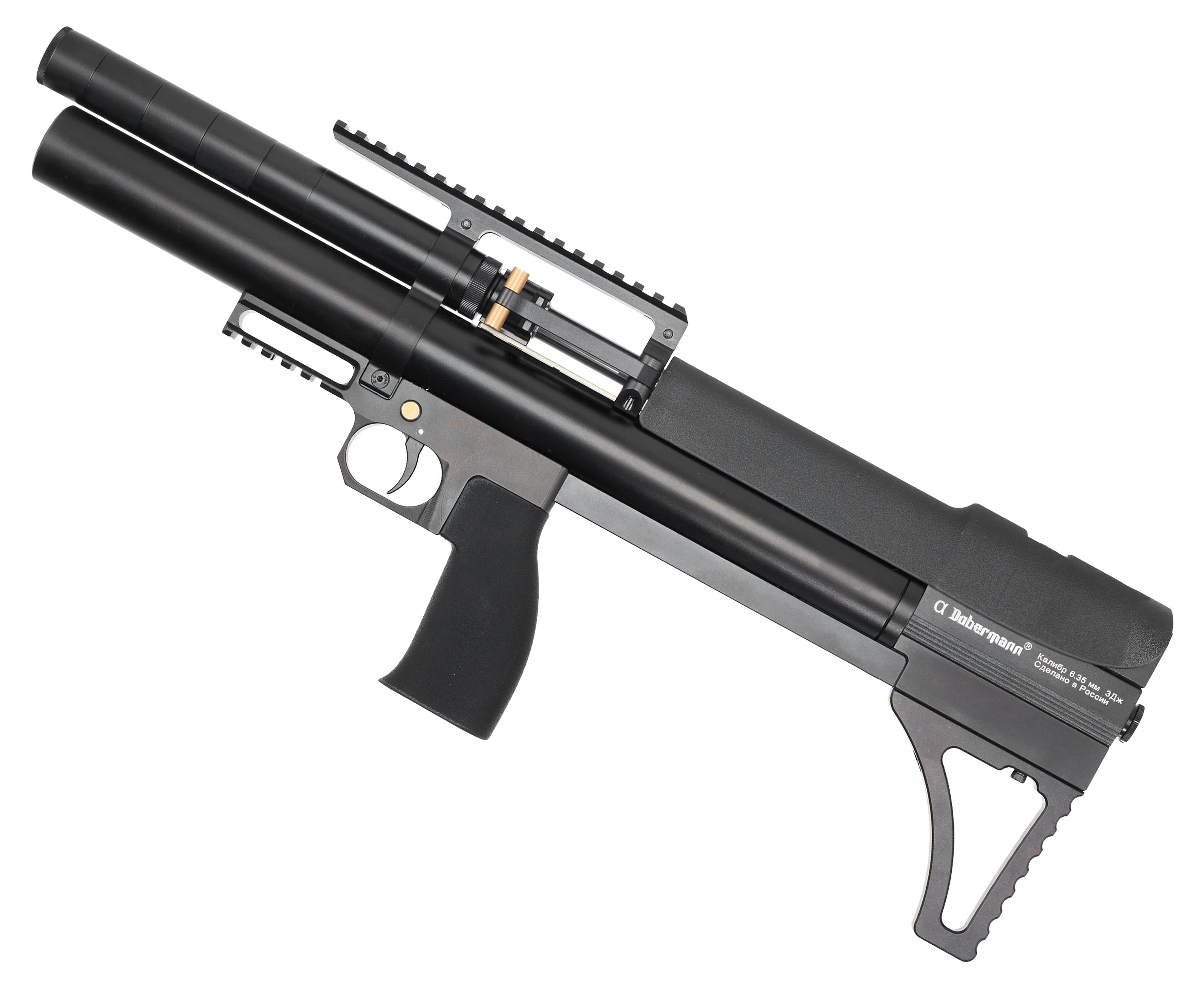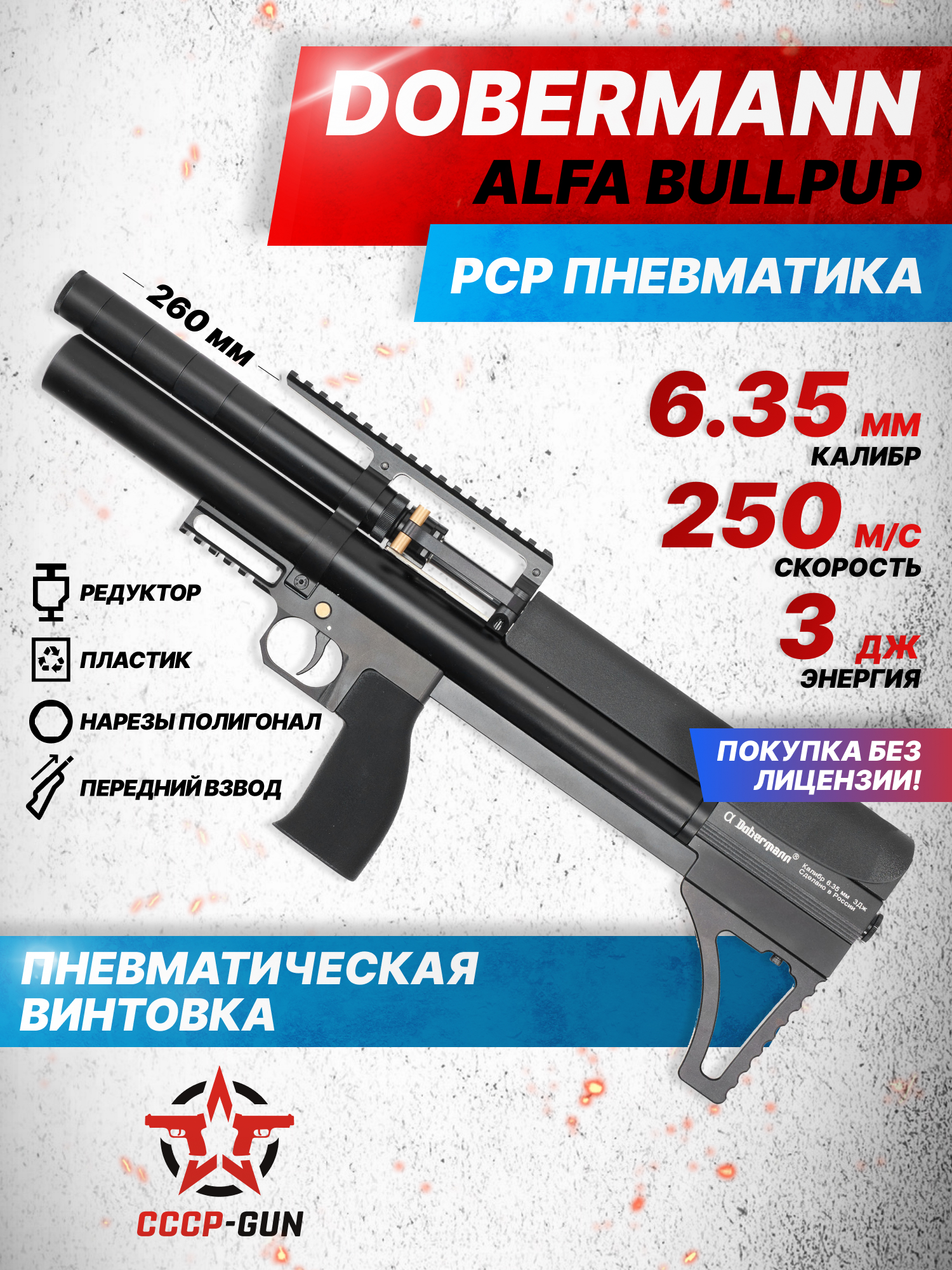 Российская компания Dobermann уверенно закрепилась на рынке пневматического оружия, специализируясь на создании надежных изделий, сочетающих повышенную точность и эргономику. Винтовки завода оснащаются технологичными и современными решениями. Модель Alfa Bull-Pup 6.35 мм с укороченным стволом - это предельно компактная и при этом функциональная платформа со схемой предварительной накачки воздуха.