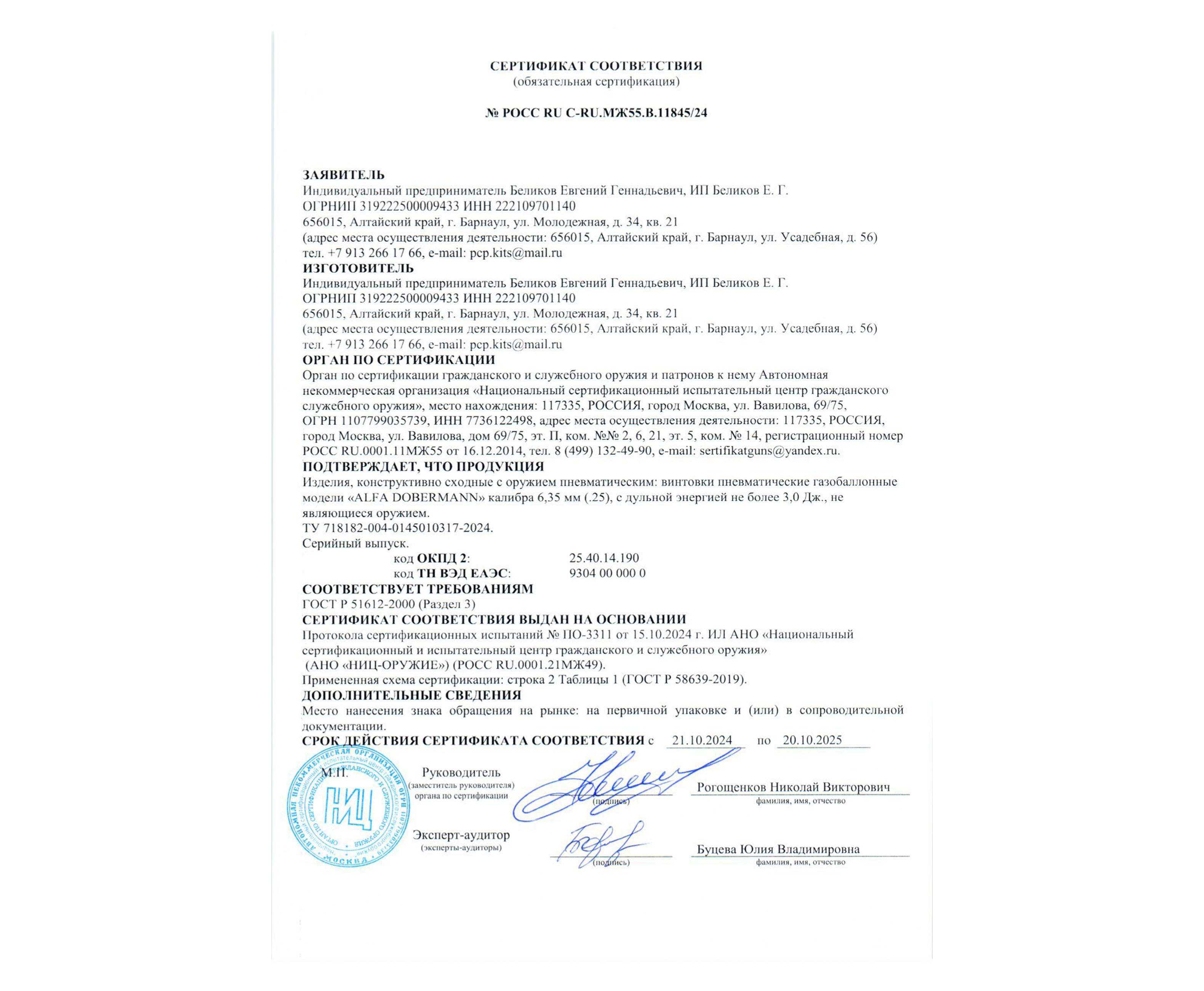 Ствол модели Альфа Доберман протяженностью 260 мм, выполненный из стали с полигональными нарезами, рассчитан на свинцовые пули калибра 6.35 мм. Геометрия канала уменьшает трение и улучшает обтюрацию.