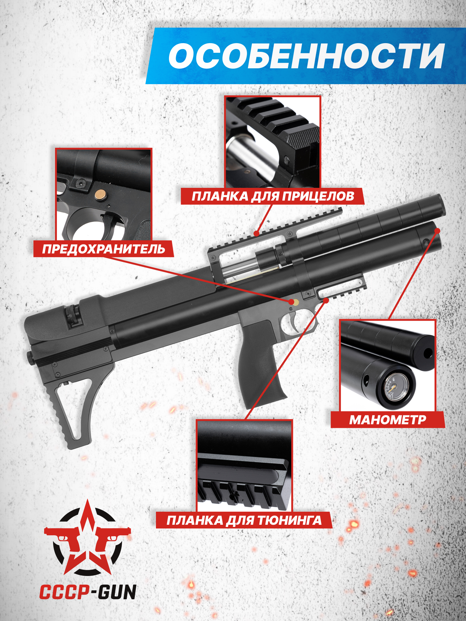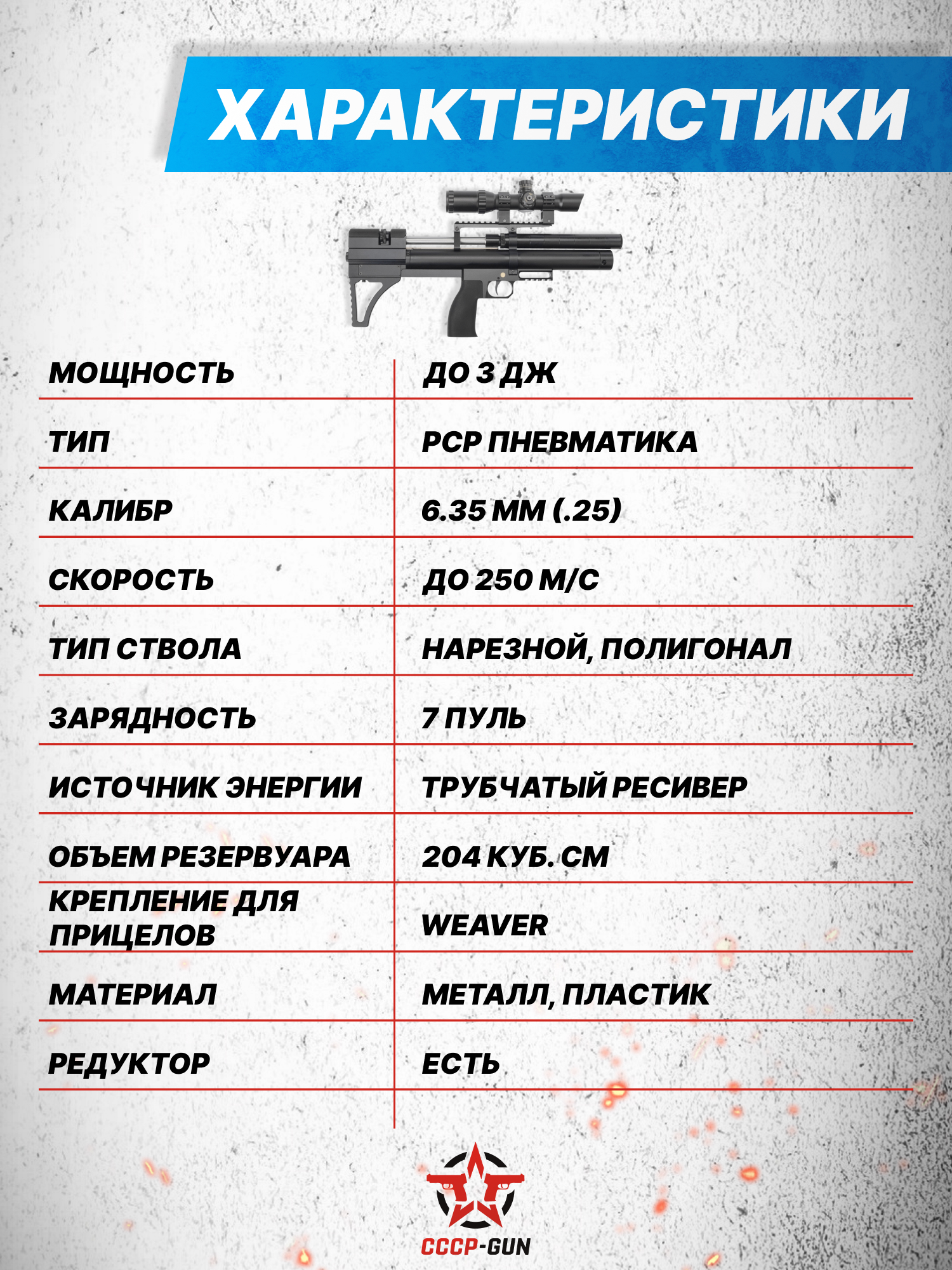Внимание! Данная модель поставляется в разрешенной мощности для свободного приобретения на территории Российской Федерации. При этом в модели имеется возможность увеличения мощности путем замены части деталей или настройки конструкции, однако не стоит забывать о Федеральном законе «Об оружии» № 150 - ФЗ. В случае необходимости, опираясь на данный закон и руководствуясь им, возможно, потребуется получить разрешение от ЛЛР ГУ МВД России после вмешательства в конструкцию.