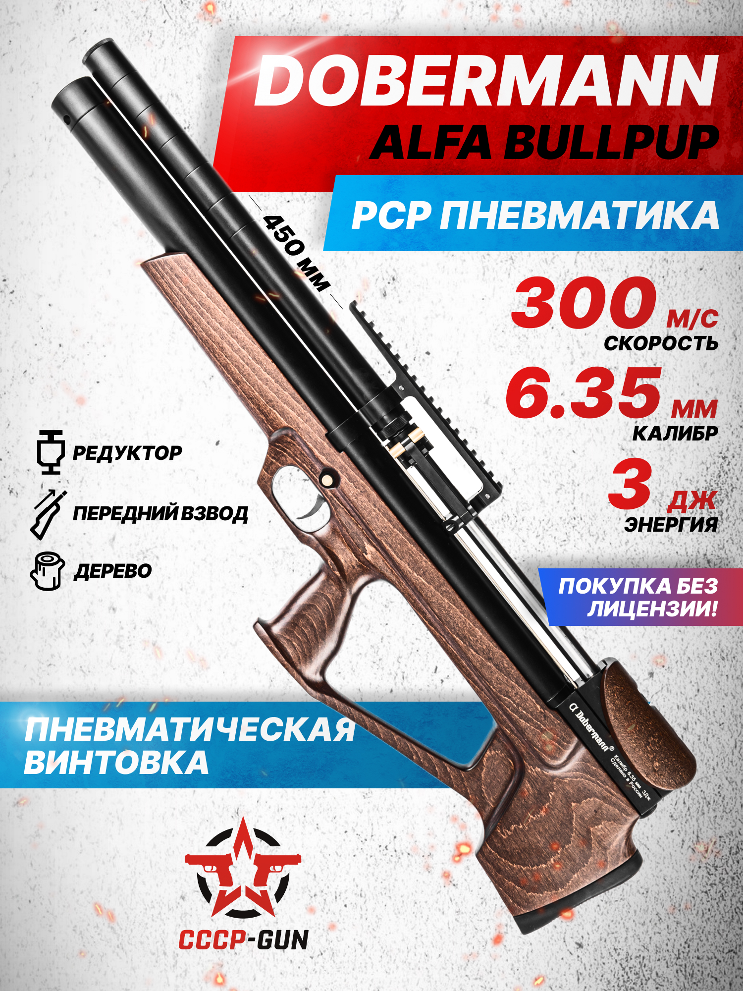 Пневматическая винтовка Dobermann Alfa Bull-Pup 6.35 мм (450 мм, стандартные нарезы, передний взвод, дерево)