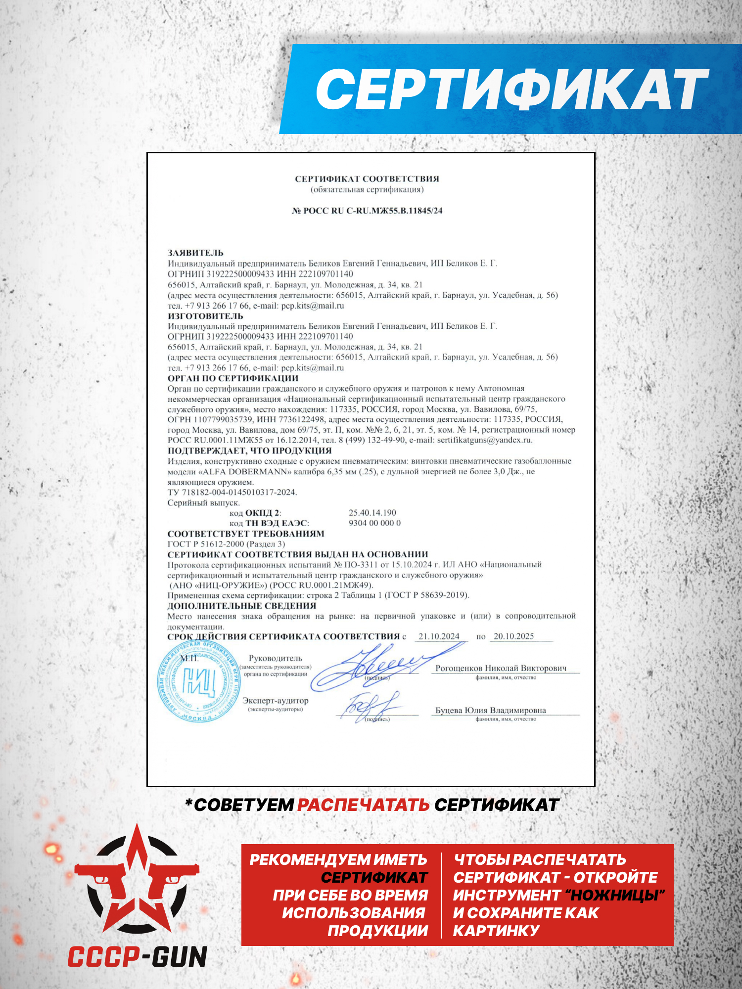 Для установки прицелов используется планка Weaver 22 мм. Она расположена на мостике и подходит для большинства оптических и коллиматорных моделей. Длина Альфа Доберман Буллпап 6.35 мм составляет 700 мм.