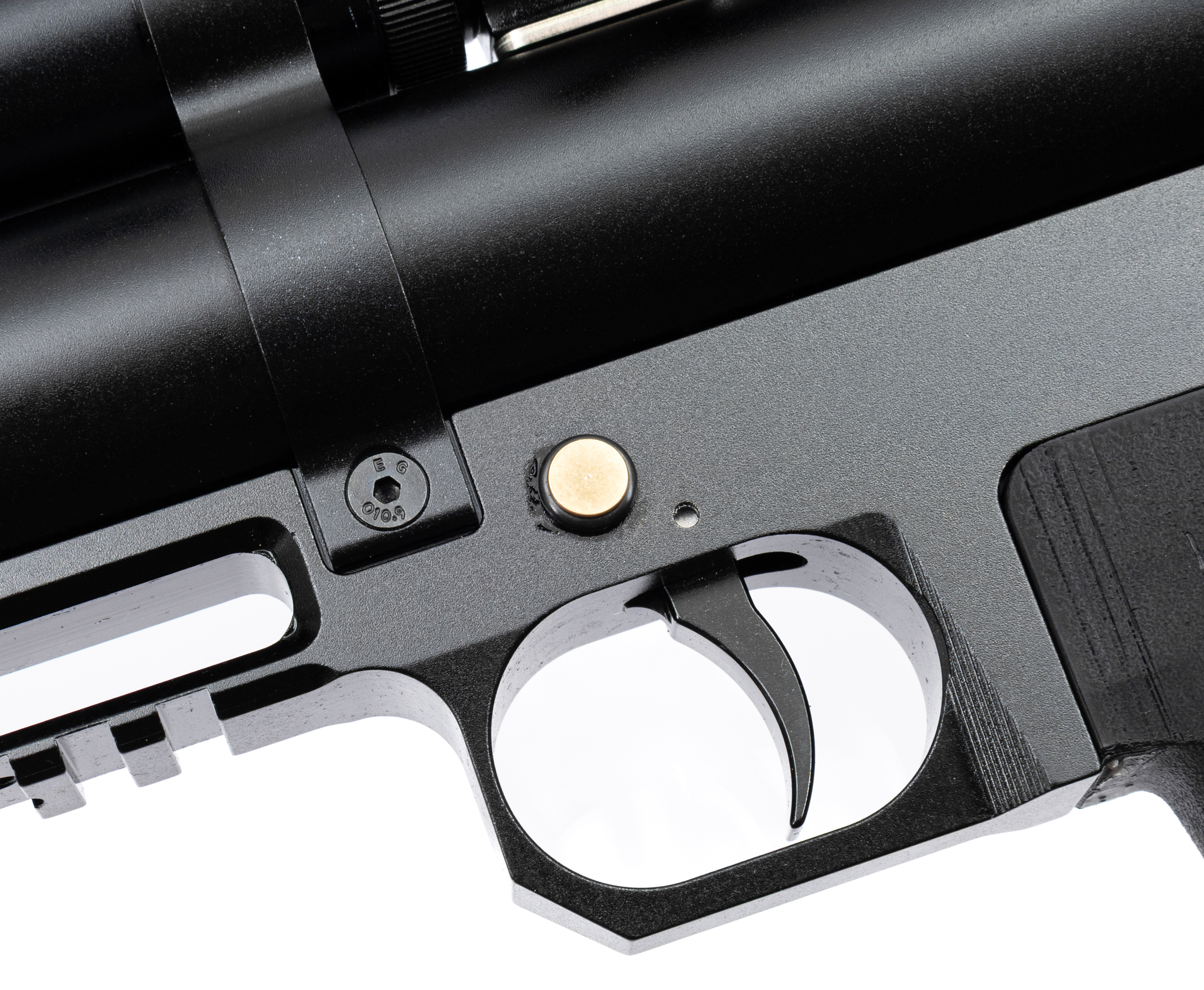 Alfa Dobermann 6.35 мм оснащена ресивером объемом 345 кубических сантиметров, рабочее давление - до 300 Бар. На торце баллона предусмотрен штатный манометр для отслеживания показателей.