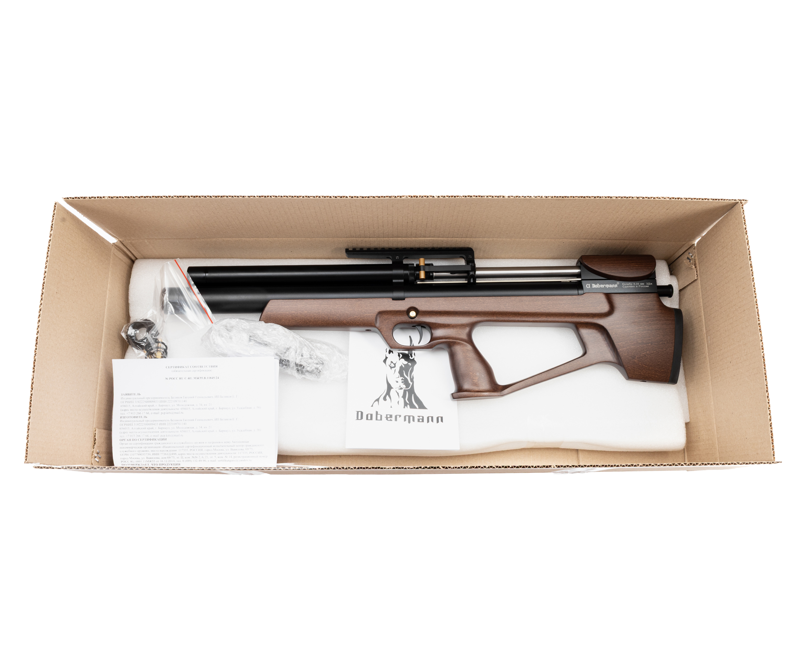Масса винтовки составляет 3.45 кг. Благодаря должному распределению веса Dobermann Буллпап 6.35 мм сохраняет устойчивость при стрельбе с рук и комфортна при длительном удержании. Компактная длина делает модель подходящей как для тренировок в тире, так и для работы в полевых условиях.