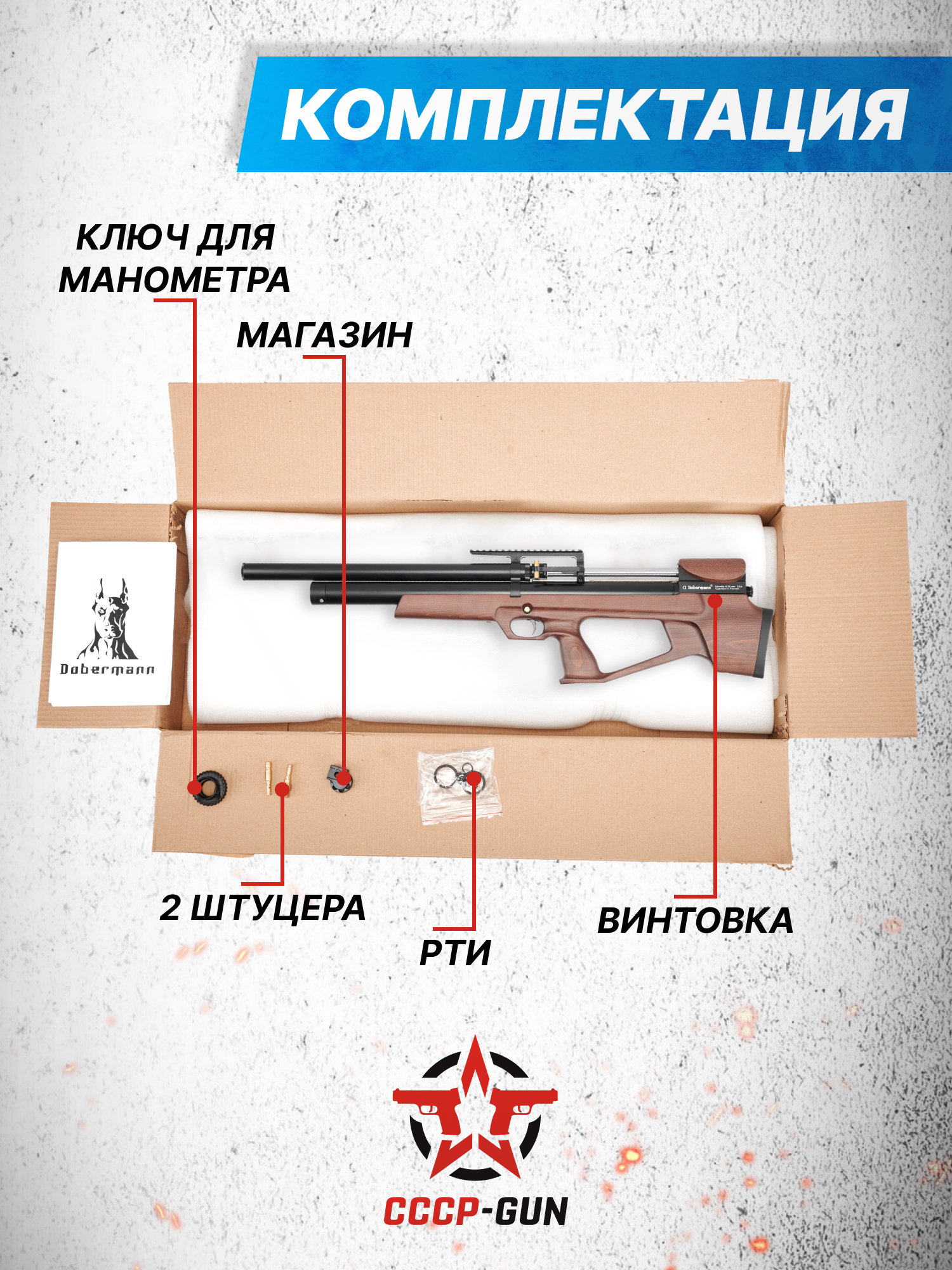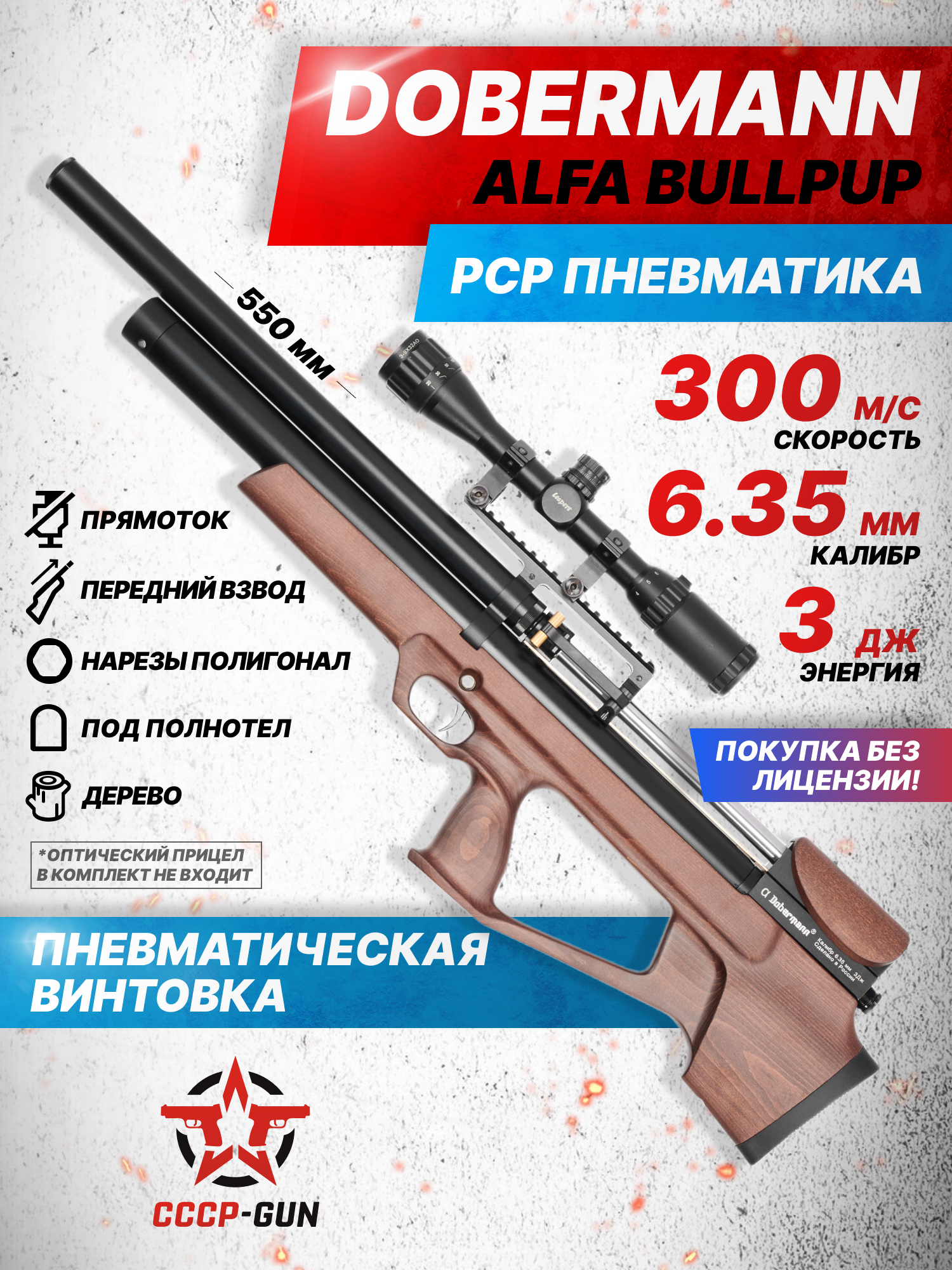 Российская компания Dobermann разрабатывает пневматическое оружие, предназначенное для точной стрельбы свинцовыми пулями. Модель Alfa 6.35 мм представляет серию PCP-винтовок с компоновкой Буллпап, созданных для работы с тяжелыми полнотелыми снарядами и обладающих устойчивой траекторией полета боеприпаса на дальних рубежах.
