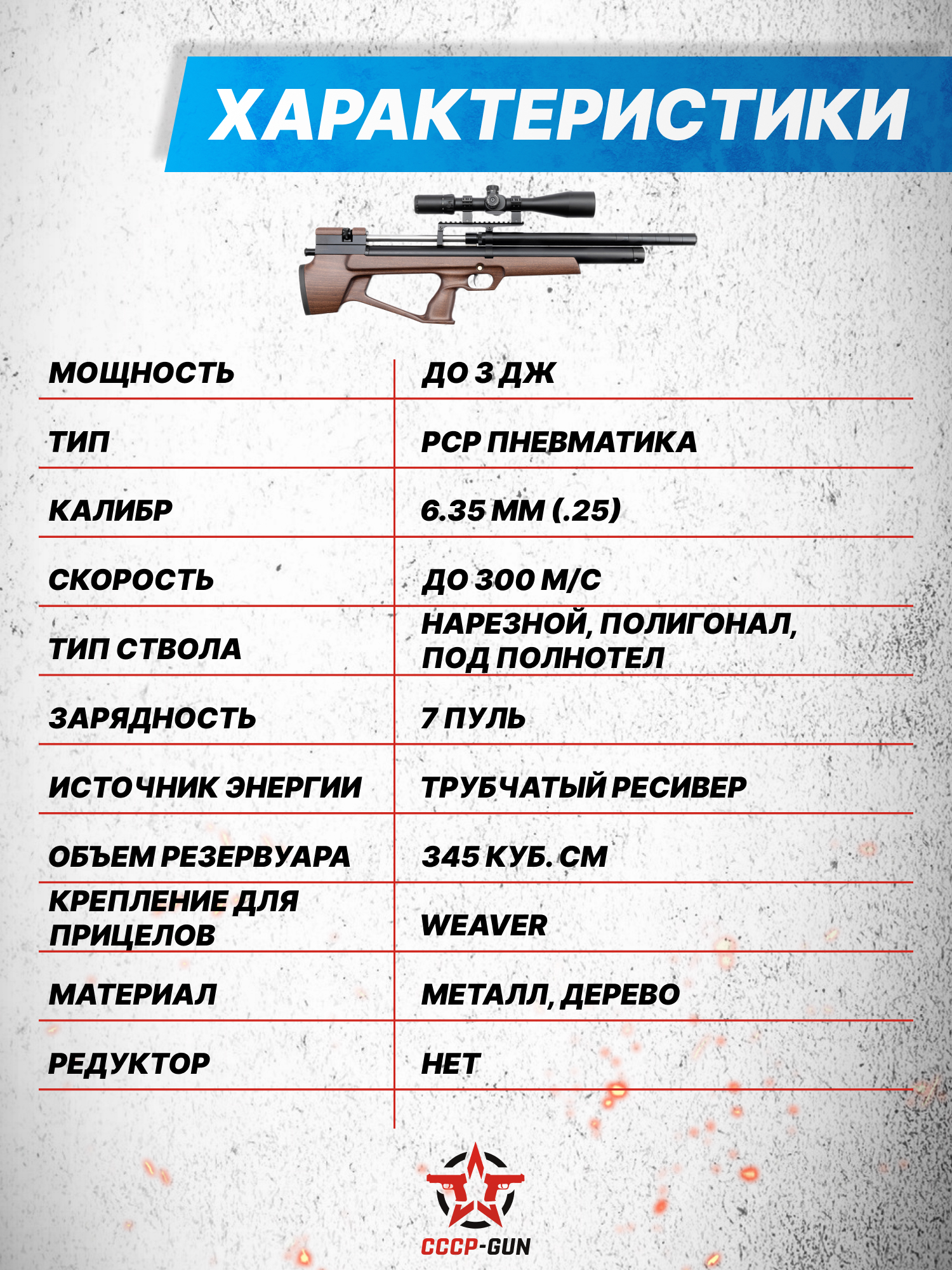 Изделие рассчитано на использование в рамках гражданских ограничений по мощности - до 3 Джоулей, что дает возможность свободно приобретать и применять его без лицензии. После соответствующих доработок винтовка способна разгонять пули до 300 метров в секунду.