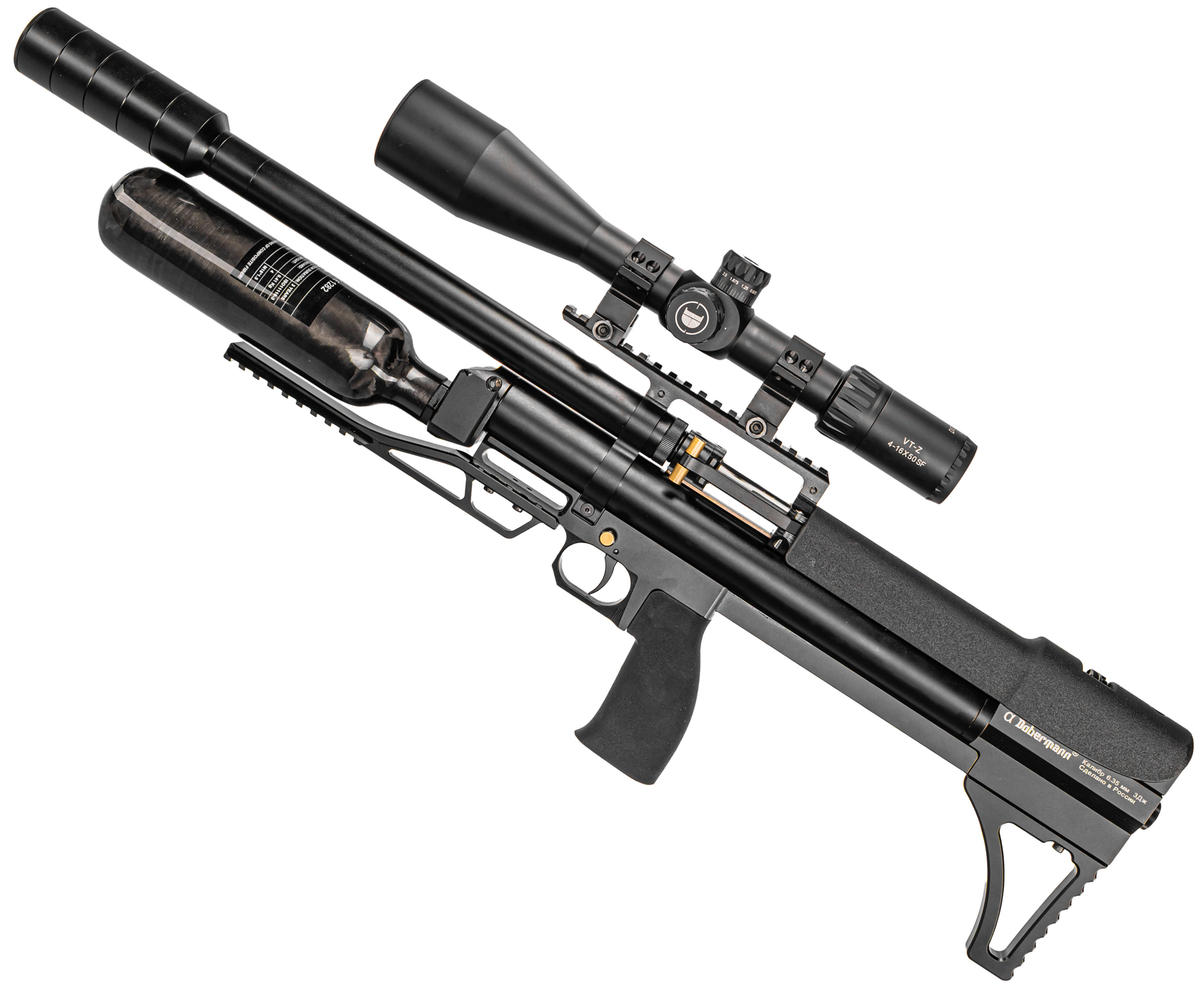 Пневматическая винтовка Dobermann Alfa Bull-Pup 6.35 мм (600 мм, редуктор, стандарт, под полнотел, модератор 44 мм, колба, передний взвод)