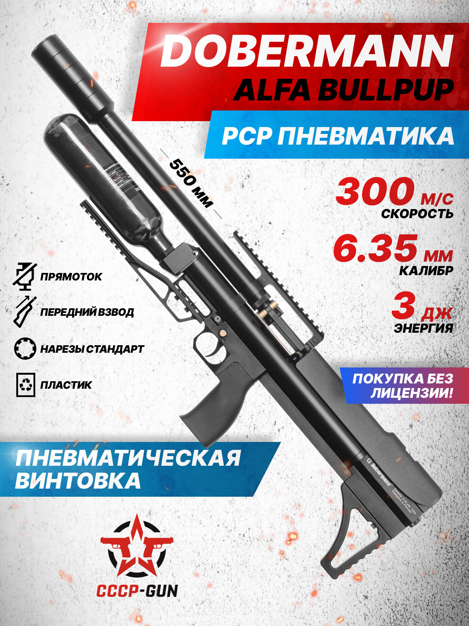Пневматическая винтовка Dobermann Alfa Bull-Pup 6.35 мм Доберман (260 мм, пластик, редуктор, полигональные нарезы, передний взвод)