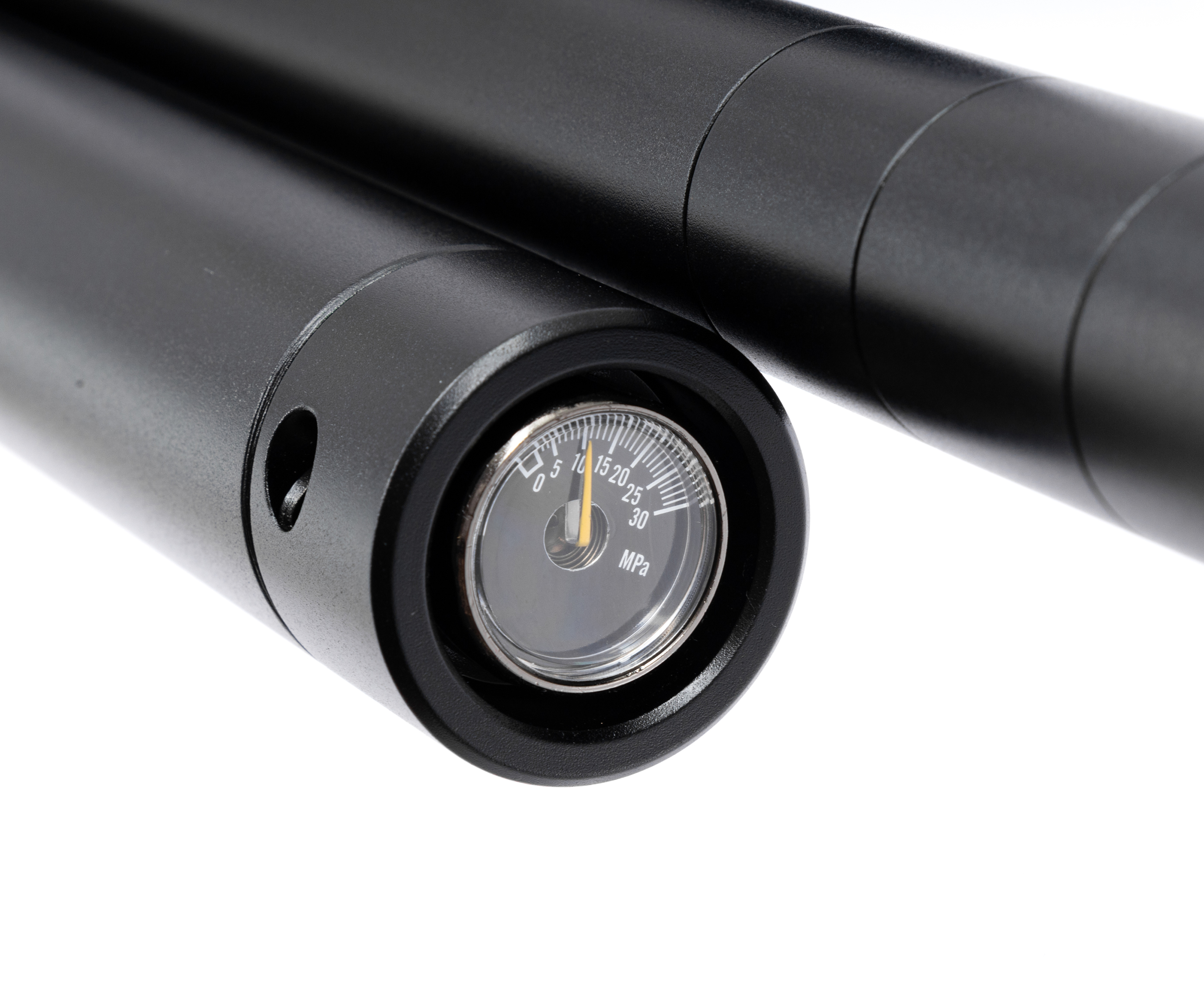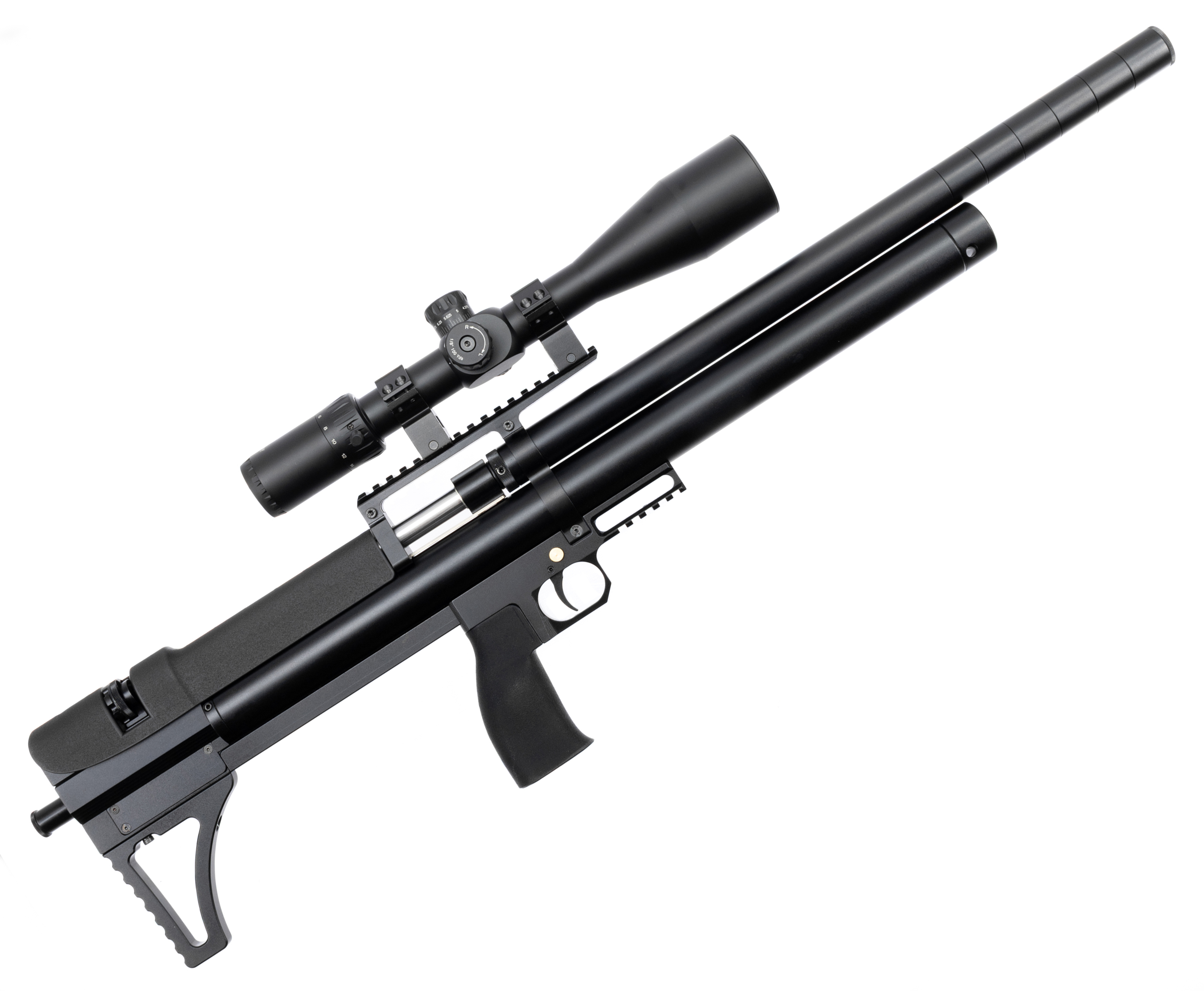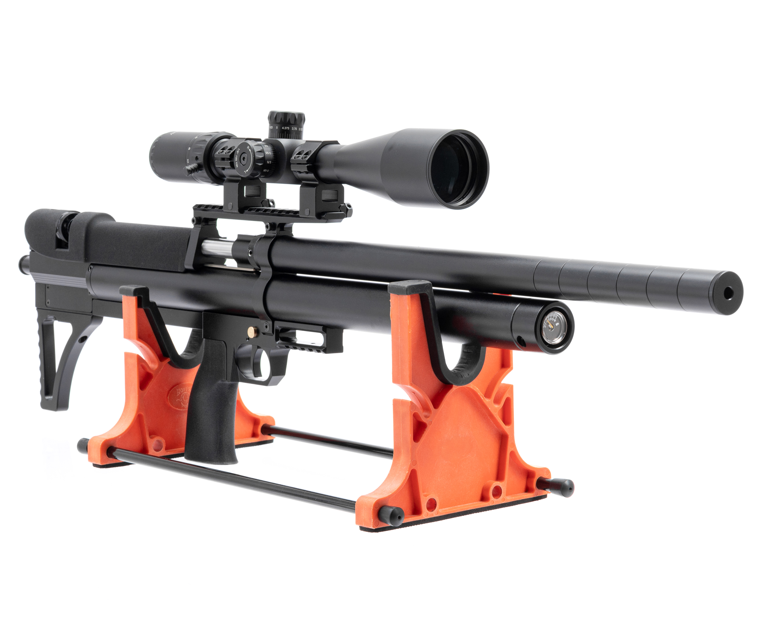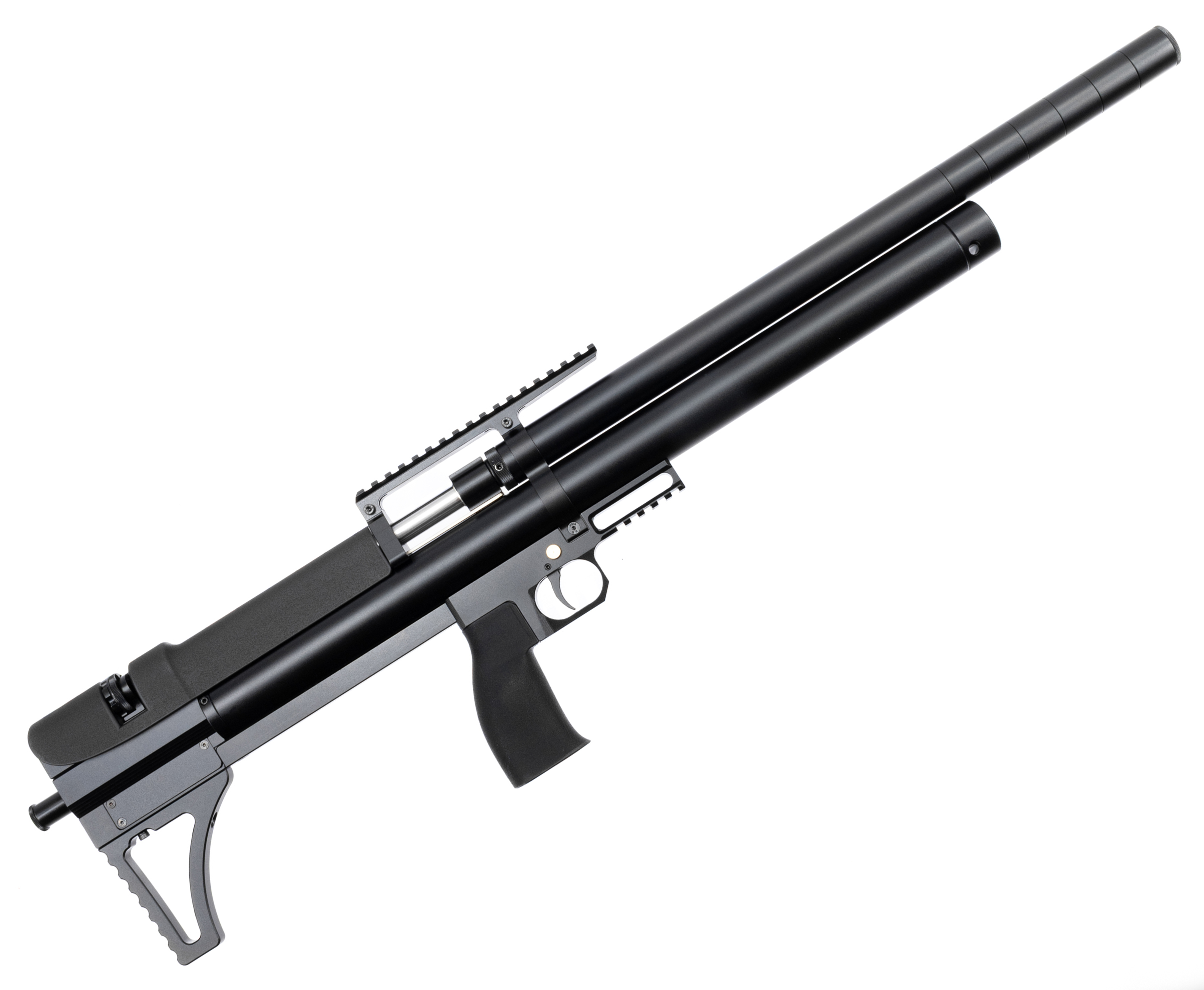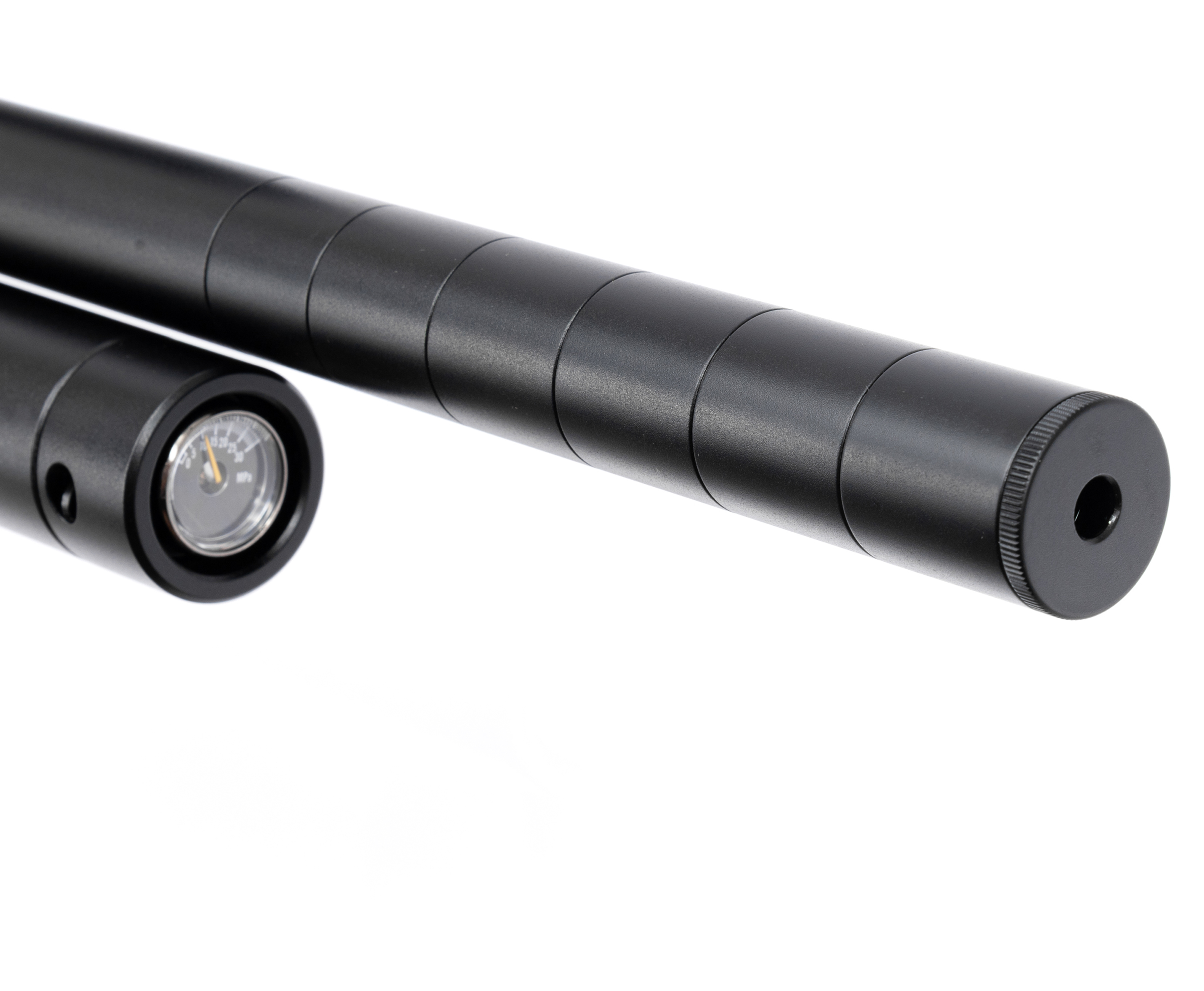 Выстрел происходит за счет энергии, получаемой от сжатого воздуха, предварительно закачиваемого в ресивер объемом 345 куб. см. Рабочее давление достигает отметки в 300 Бар, показатели отслеживаются встроенным манометром. Для заправки предусмотрен быстросъемный штуцер, совместимый с большинством насосов и баллонов.