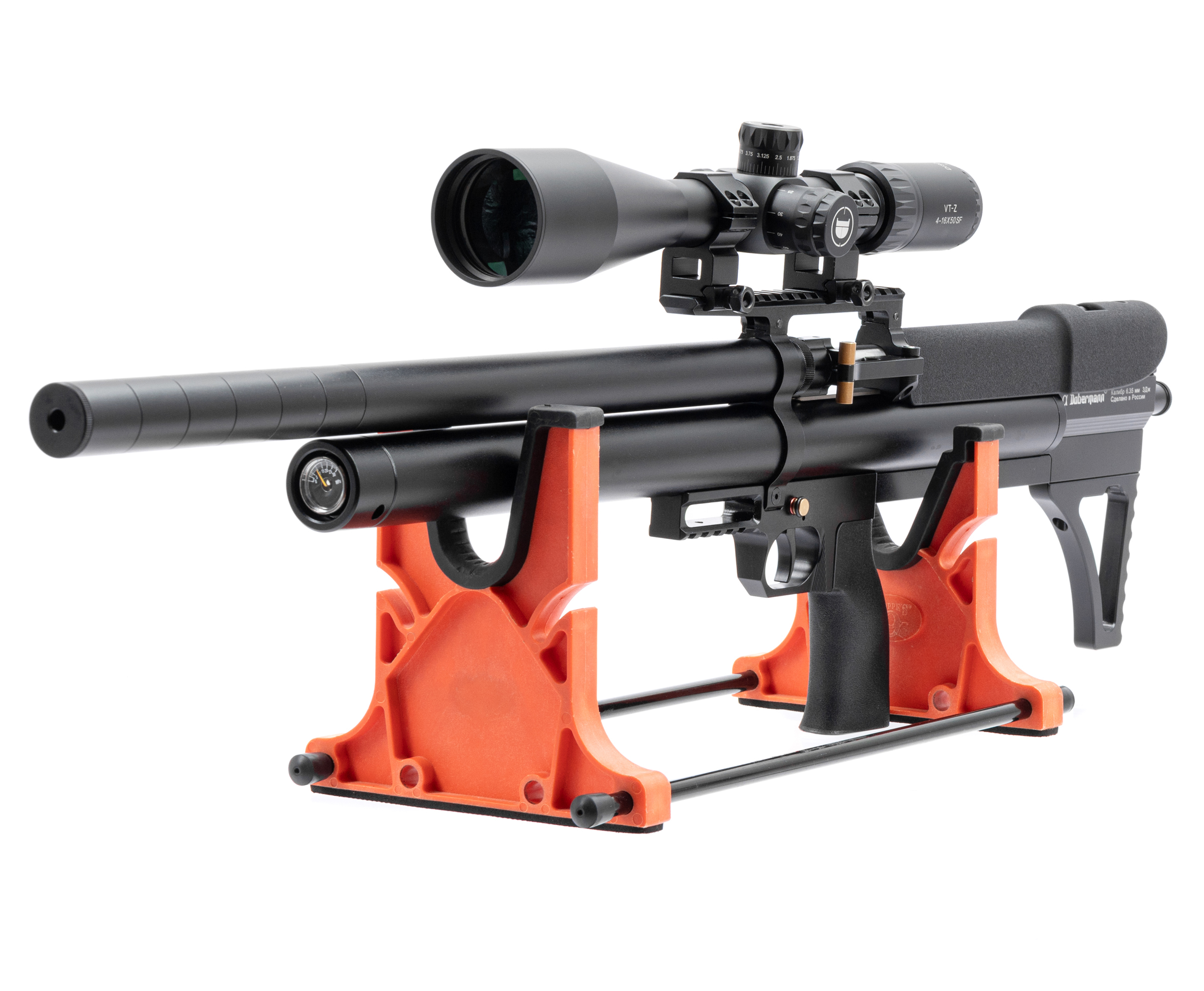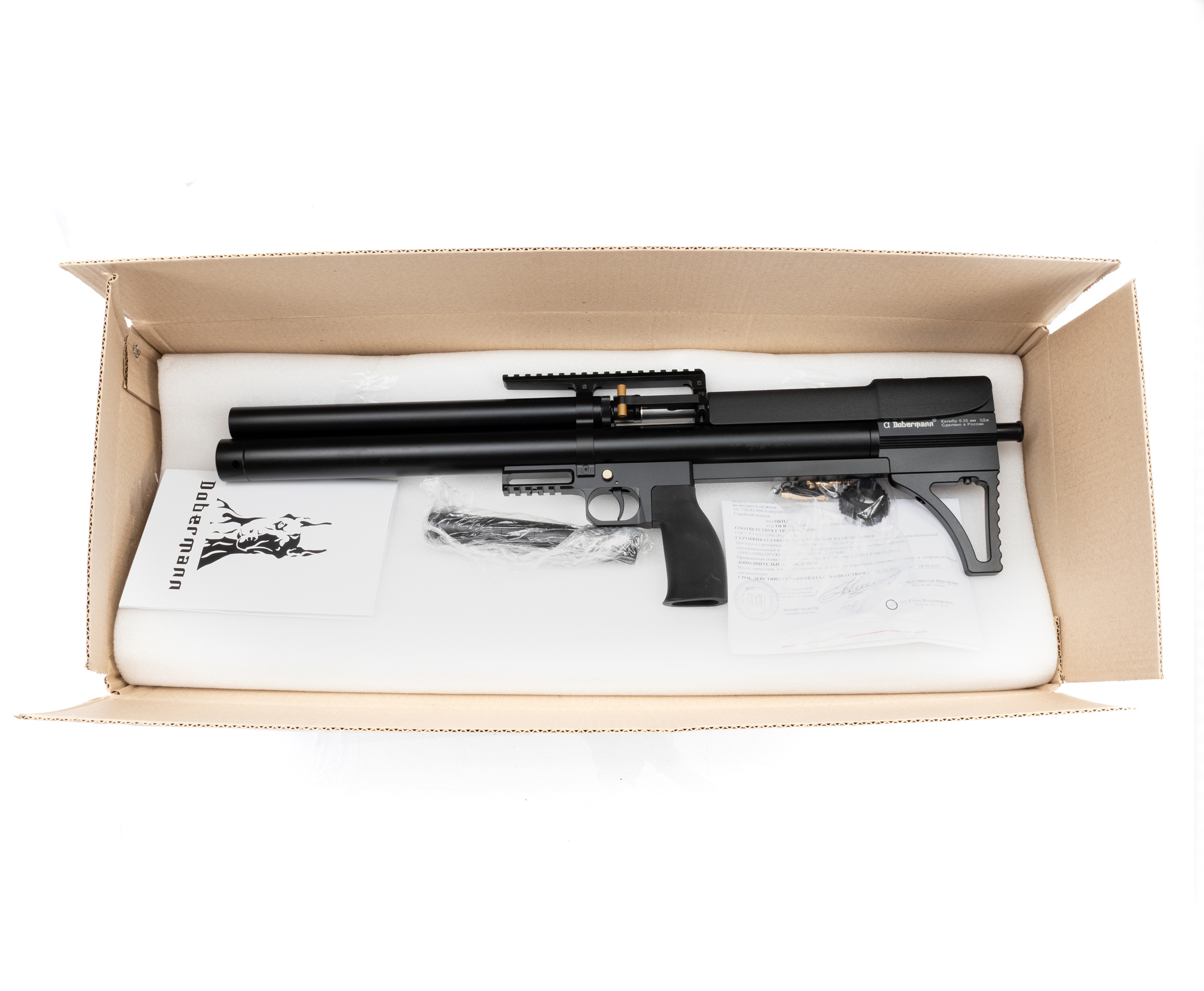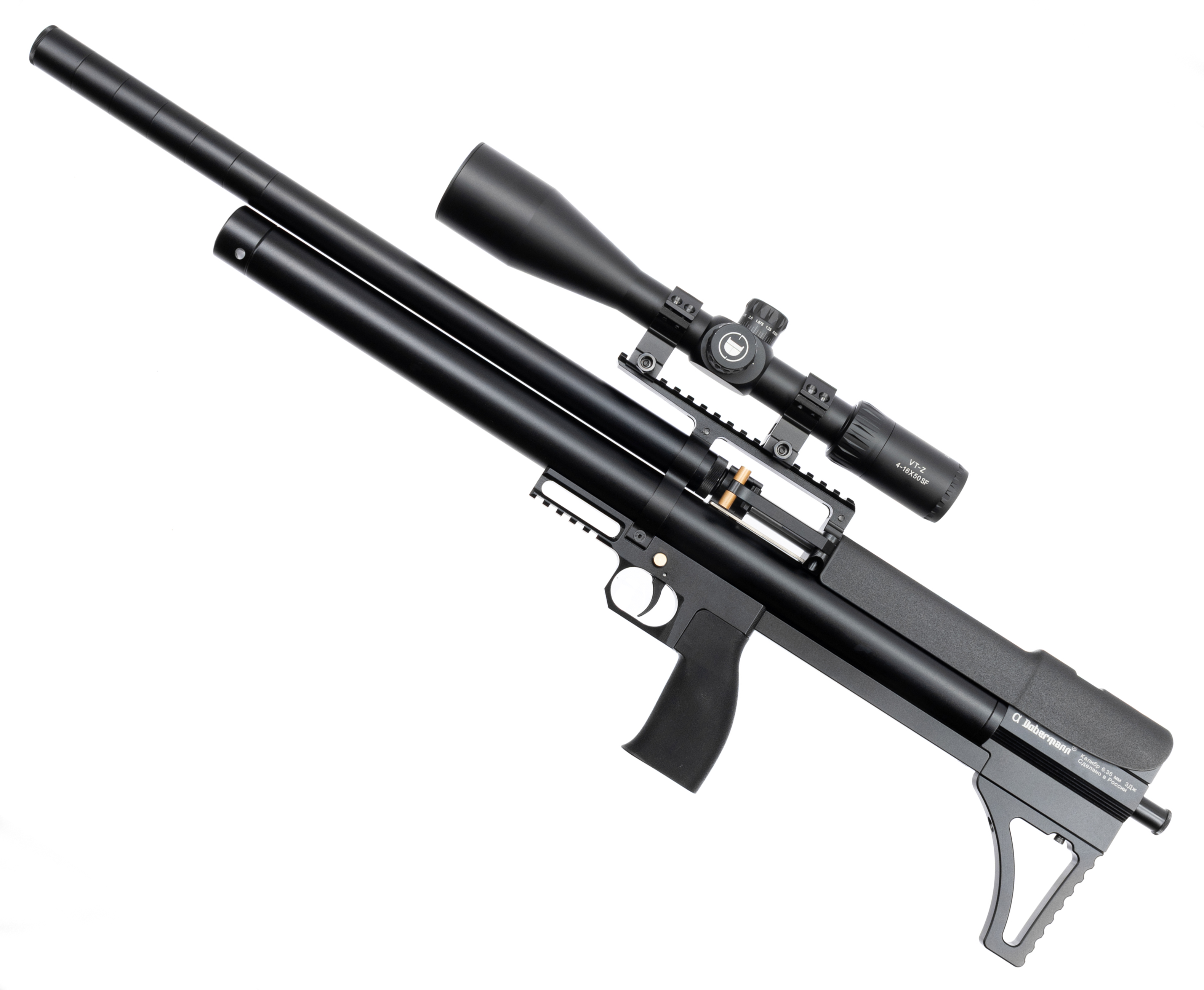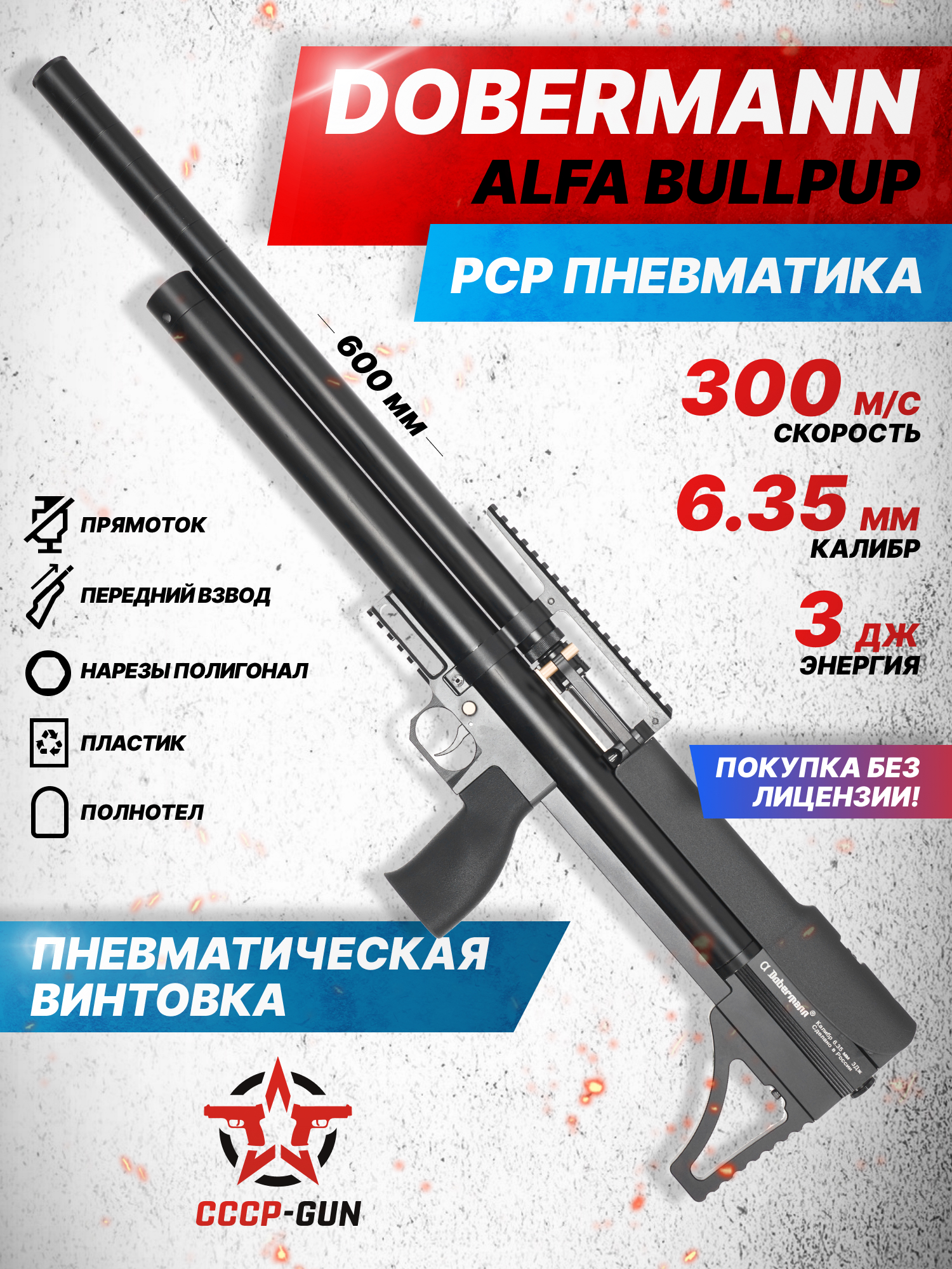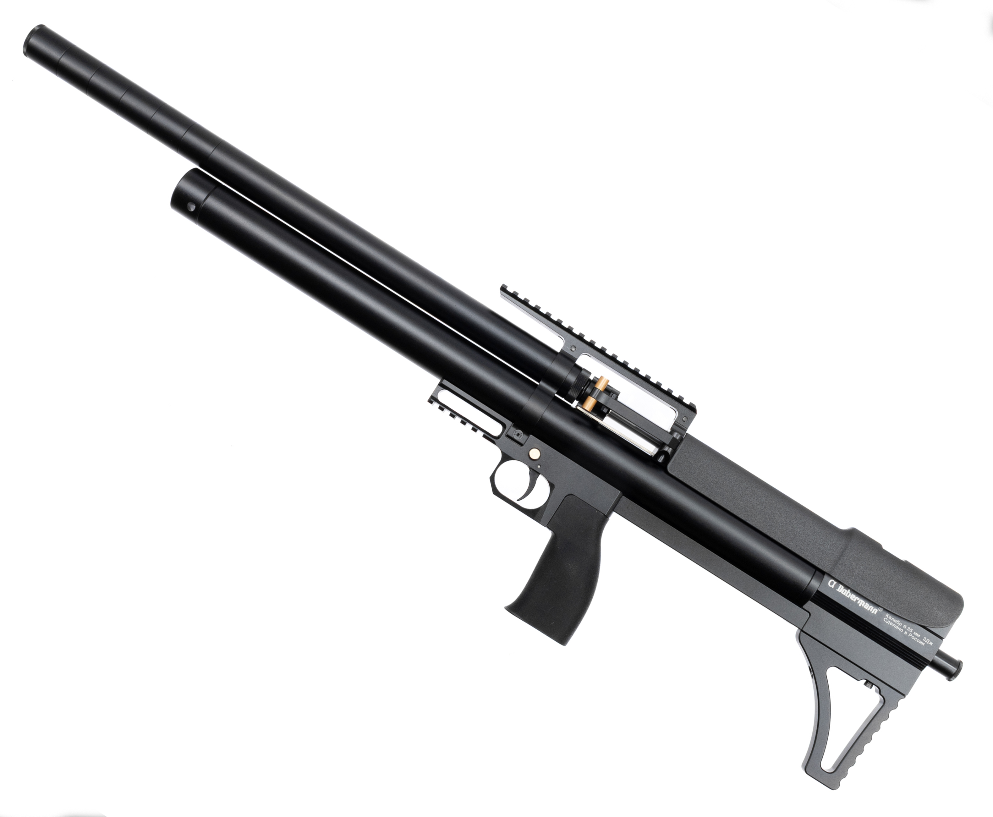 Укороченная компоновка винтовок пользуется большим спросом, такие изделия компактнее при сохранении полной длины ствола. Этот формат делает возможным использование оружия в условиях узкого пространства - из-за укрытия или из транспортного средства. К таким изделиям относится рассматриваемая пневматическая винтовка Alfa Dobermann Буллпап 6.35 мм.