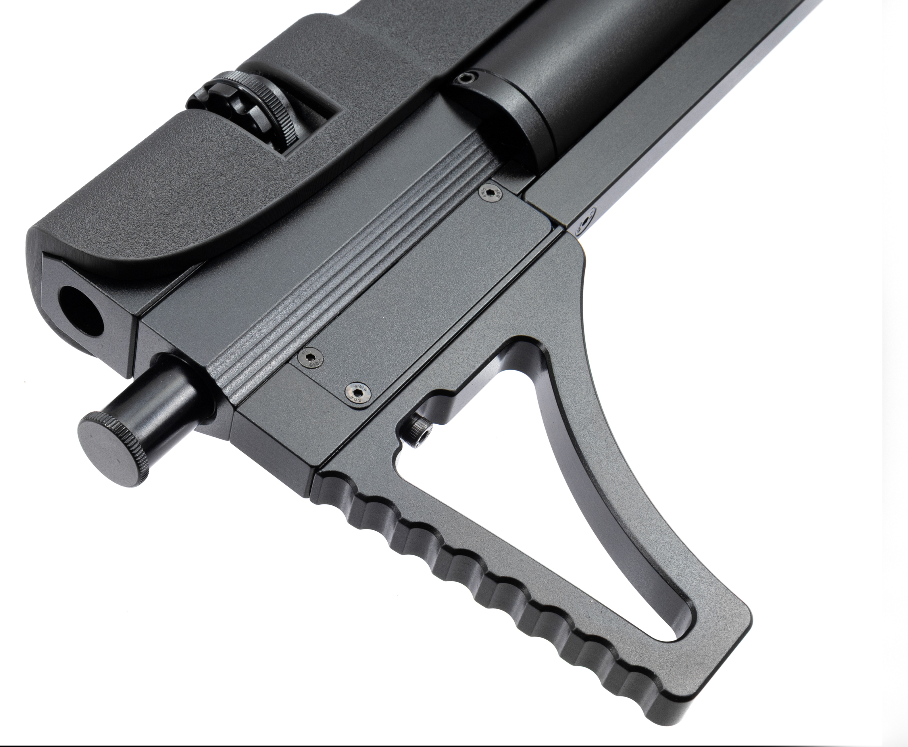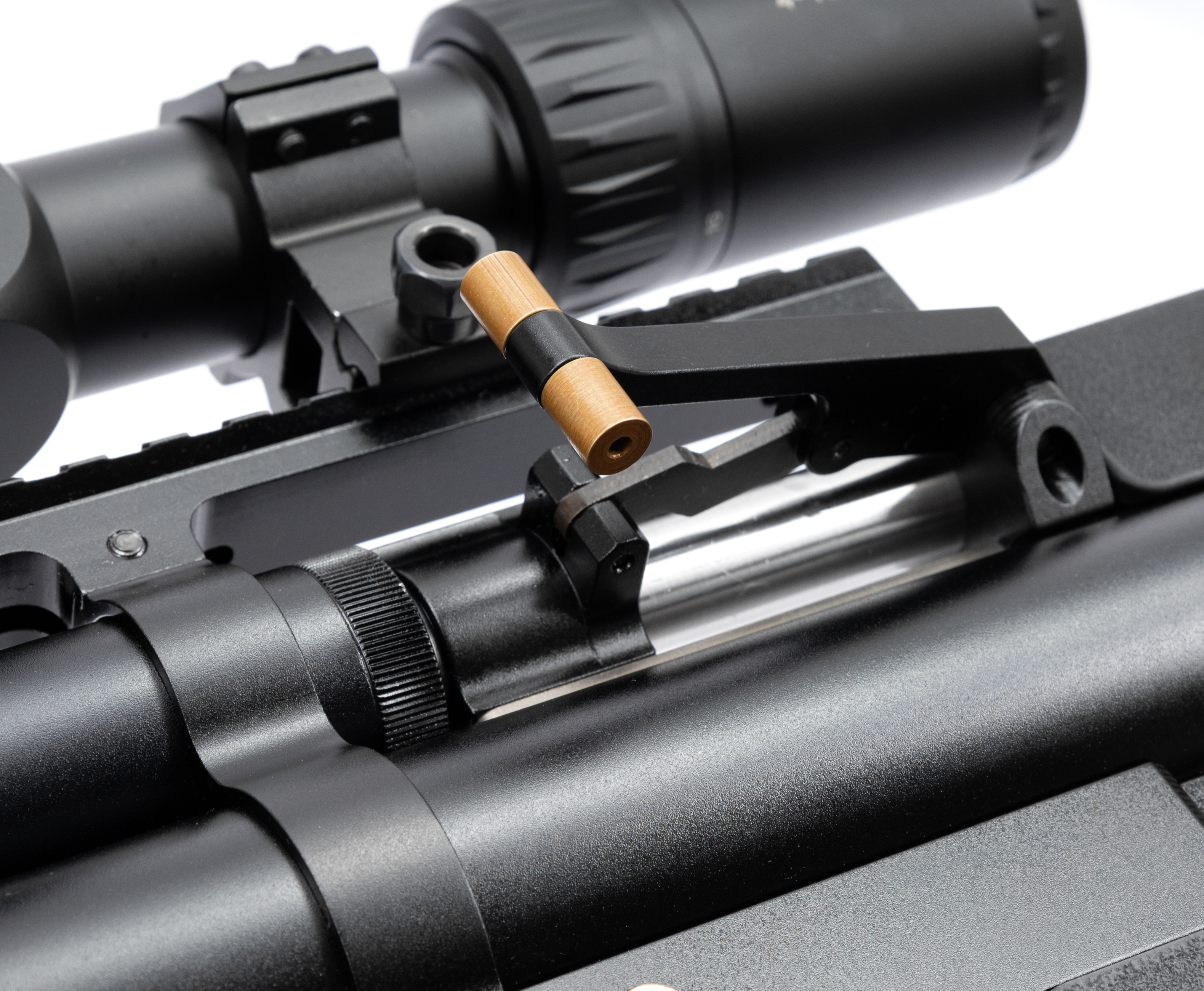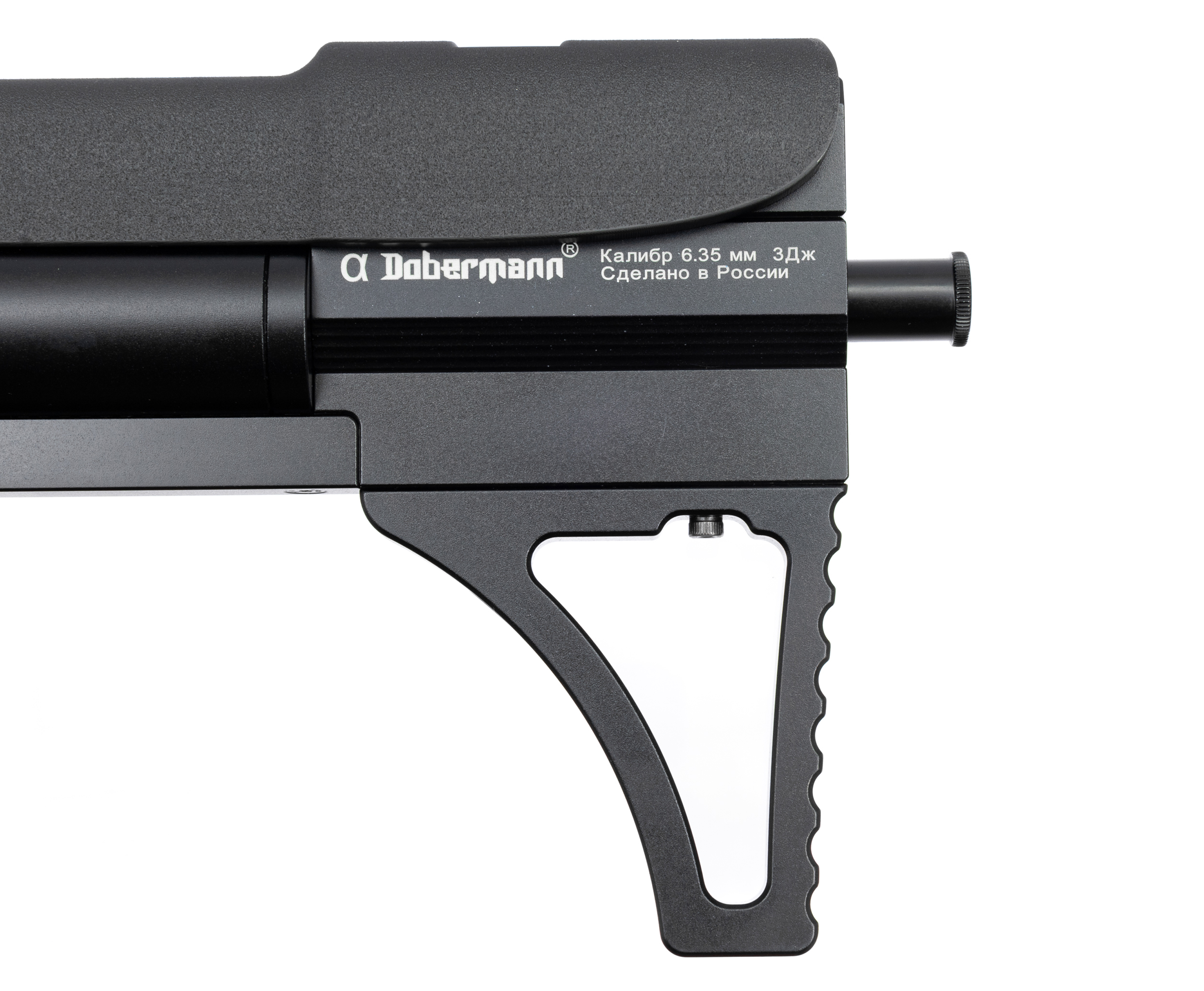 ПСП винтовка Доберман Альфа подготавливается к выстрелу посредством переднего взвода. Такое размещение комфортно для стрелков любого доминирующего глаза, позволяя сохранять сформированную вкладку при перезарядке. К прочим органам управления относится кнопочный предохранитель над спусковым крючком, который блокирует его работу и не допускает случайного нажатия.