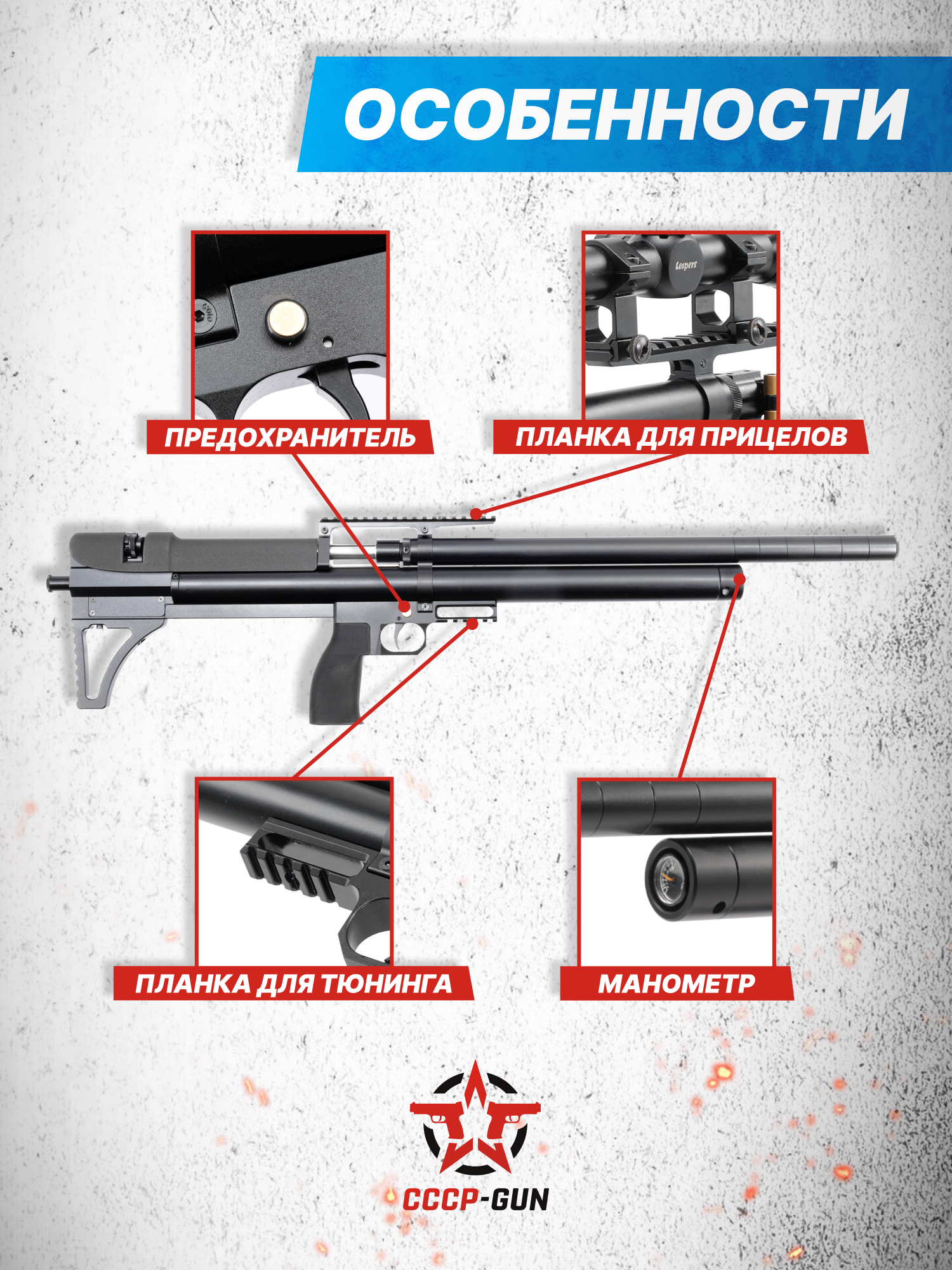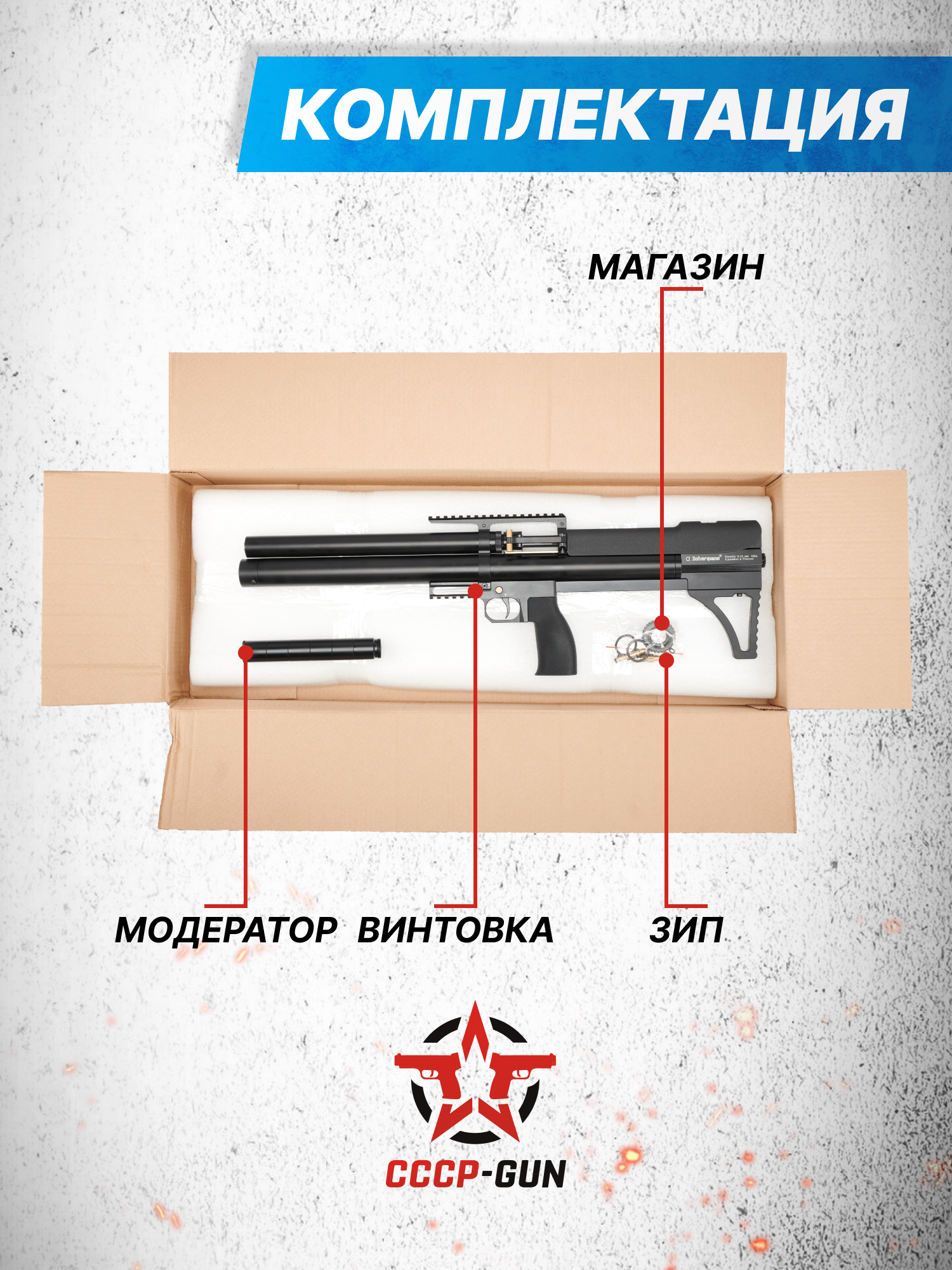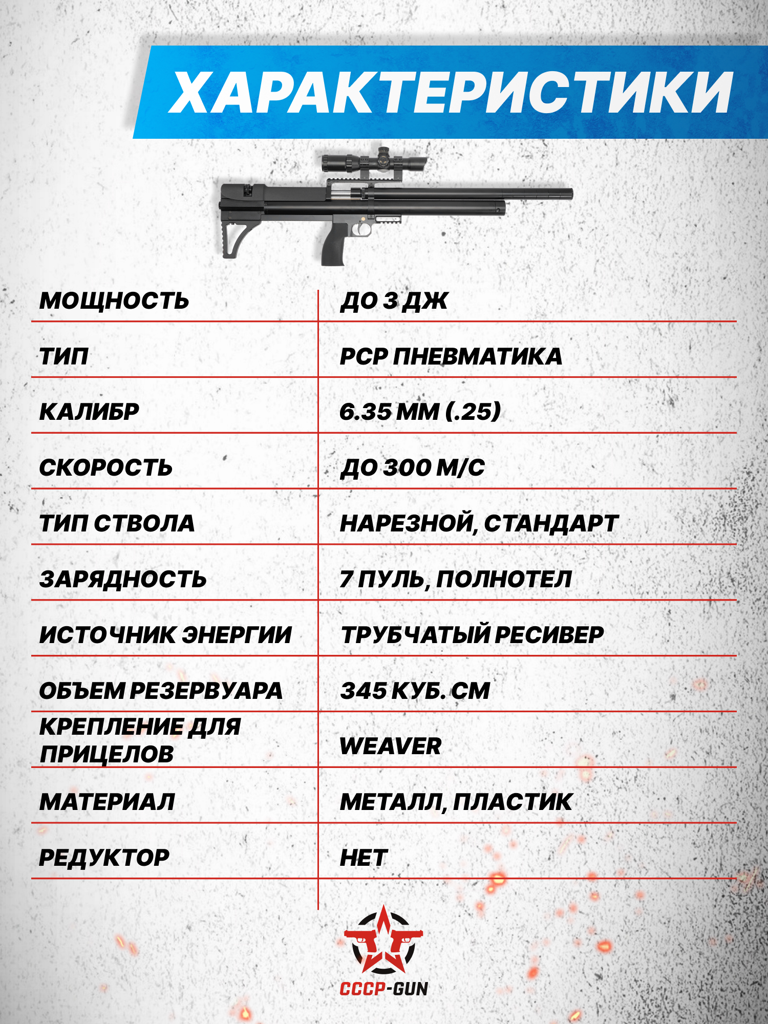Внимание! Данная модель поставляется в разрешенной мощности для свободного приобретения на территории Российской Федерации. При этом в модели имеется возможность увеличения мощности путем замены части деталей или настройки конструкции, однако не стоит забывать о Федеральном законе «Об оружии» № 150 - ФЗ. В случае необходимости, опираясь на данный закон и руководствуясь им, возможно, потребуется получить разрешение от ЛЛР ГУ МВД России после вмешательства в конструкцию.