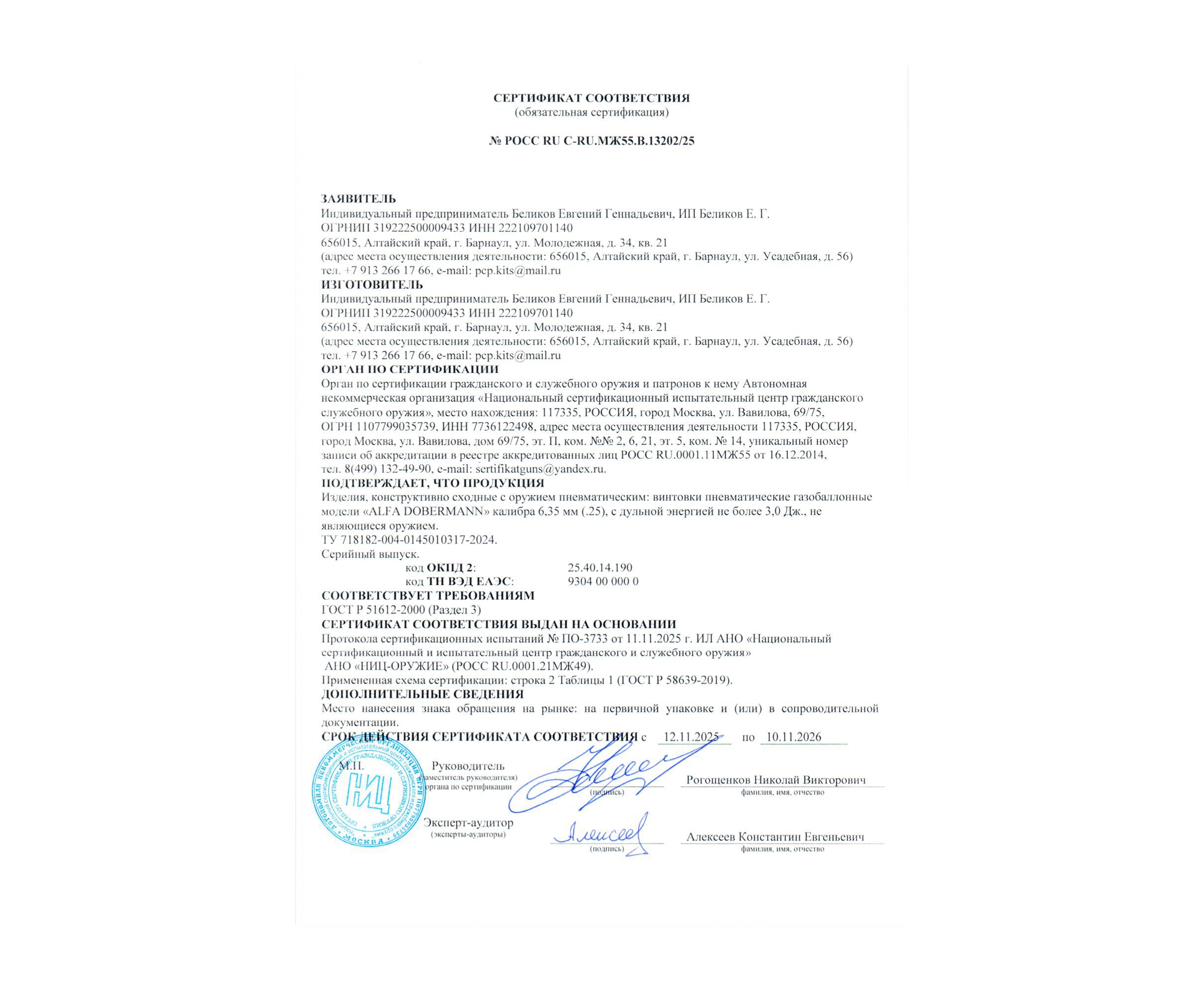 Dobermann винтовка ведет одиночную стрельбу, а начальная скорость свинцового снаряда способна достигать 300 метров в секунду. Такой баллистический потенциал заложен конструктивно, но в розничную сеть на территории РФ изделия фирмы поступают с дульной энергией, ограниченной лимитом 3 Дж. Такое ограничение мощности позволяет свободно приобретать рассматриваемое пневматическое оружие без оформления лицензии.