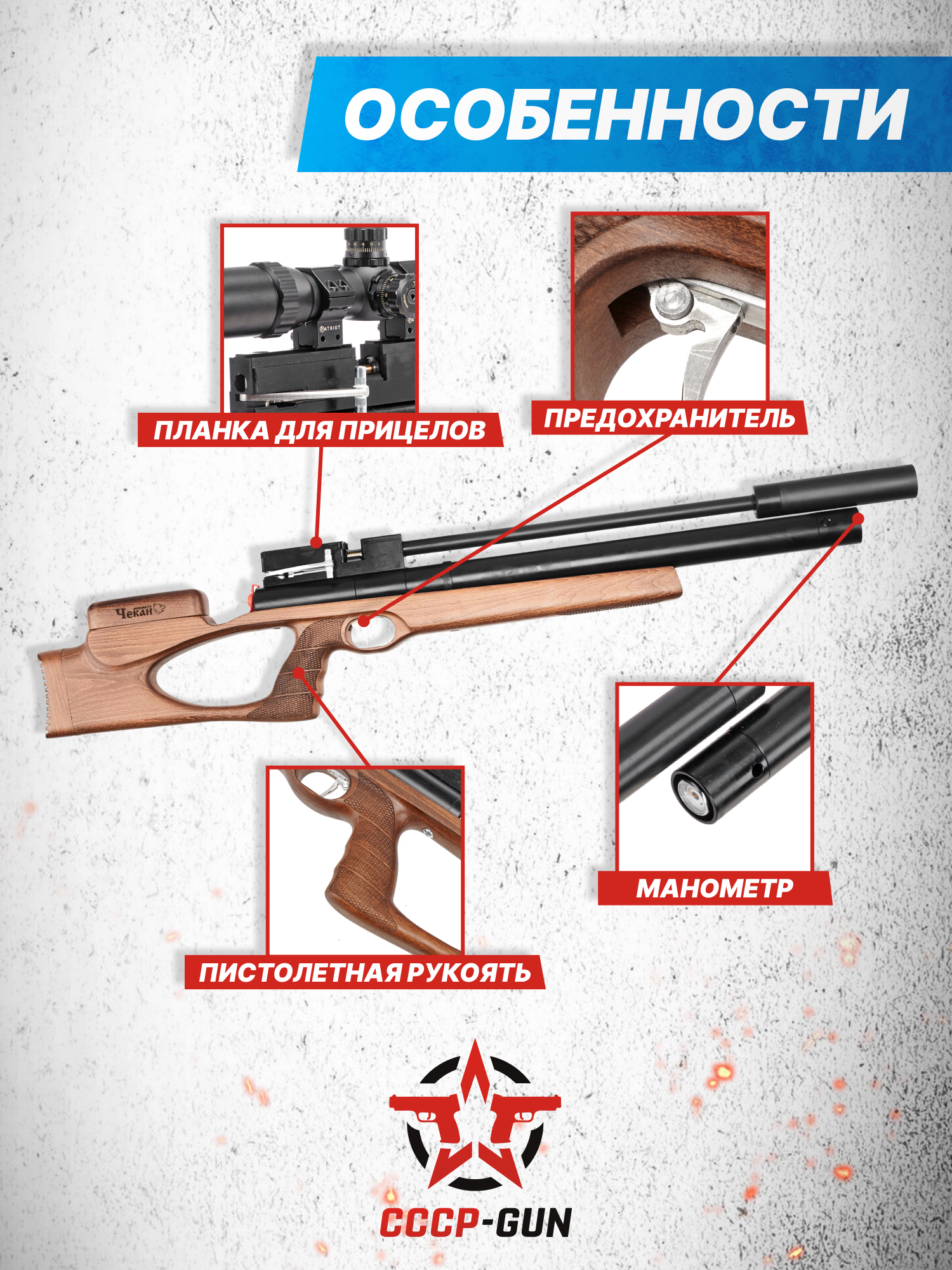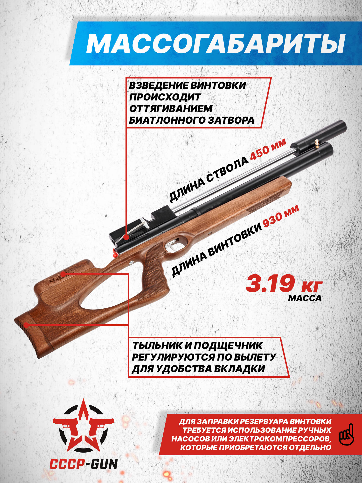 Классическая компоновка представленной PCP винтовки 5 5 мм предполагает полную длину 930 мм - анатомический приклад при этом оснащен системой регулировки высоты затыльника и положения щеки, обеспечивая индивидуальную настройку под антропометрию пользователя. Рукоять пистолетного типа с насечками исключает проскальзывание ладони даже при интенсивном использовании в дождливую погоду или с тактическими перчатками.