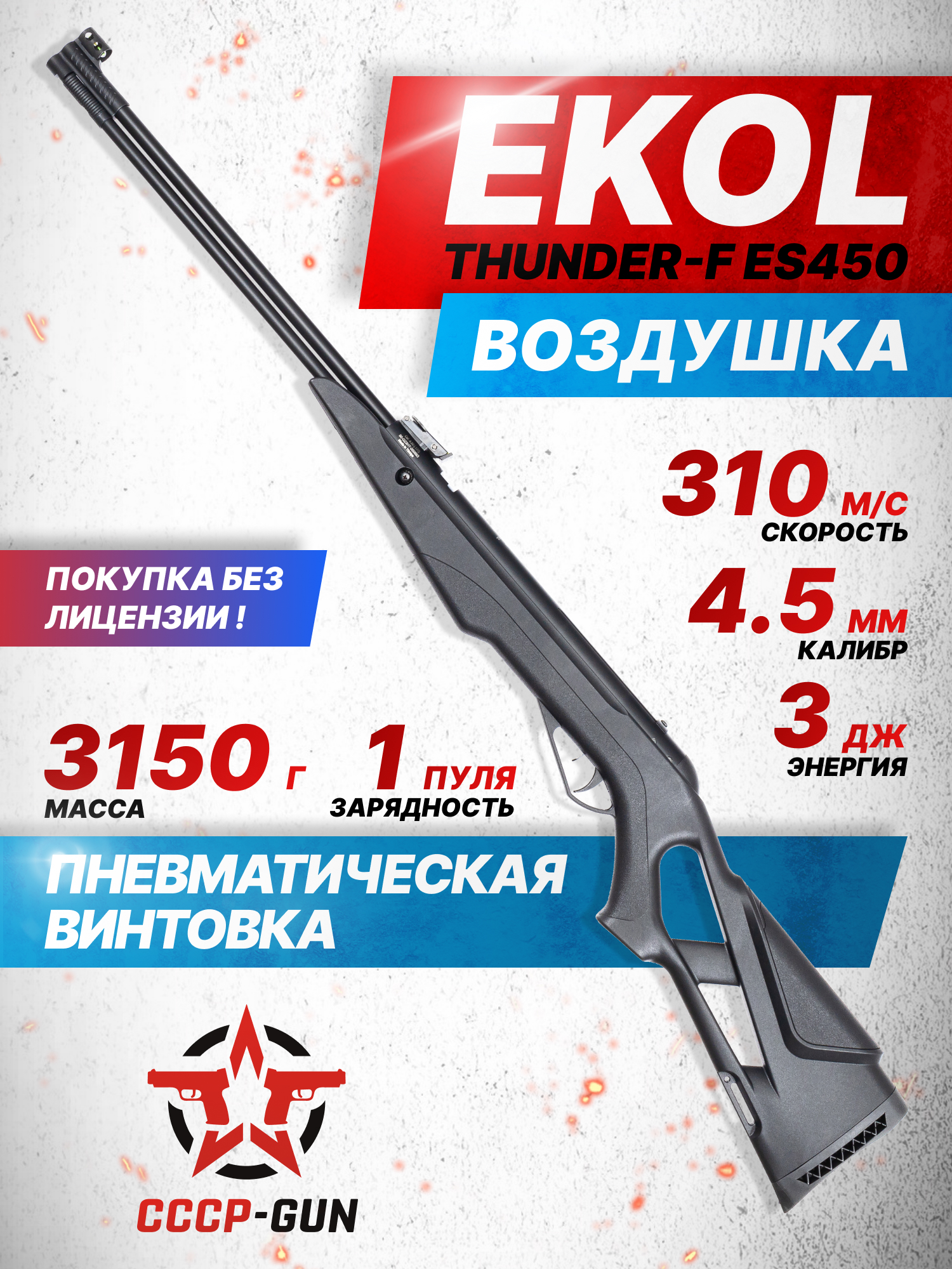 Несмотря на то, что Ekol Thunder F ES450 4.5 демонстрирует максимальную скорость полета снарядов, достигающую 310 метров в секунду, в России винтовка продается свободно и не требует лицензии для покупки. Такая опция возможна ввиду фиксированной дульной энергии поставляемых в РФ моделей, которая приравнивается 3 Дж. Также производитель оборудовал изделие автоматическим предохранителем, что становится большим плюсом для начинающих стрелков или в случае, если пневматика будет применяться для тренировок подрастающего поколения.