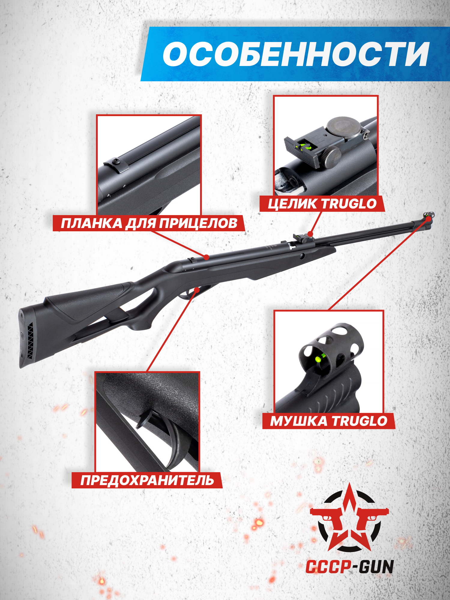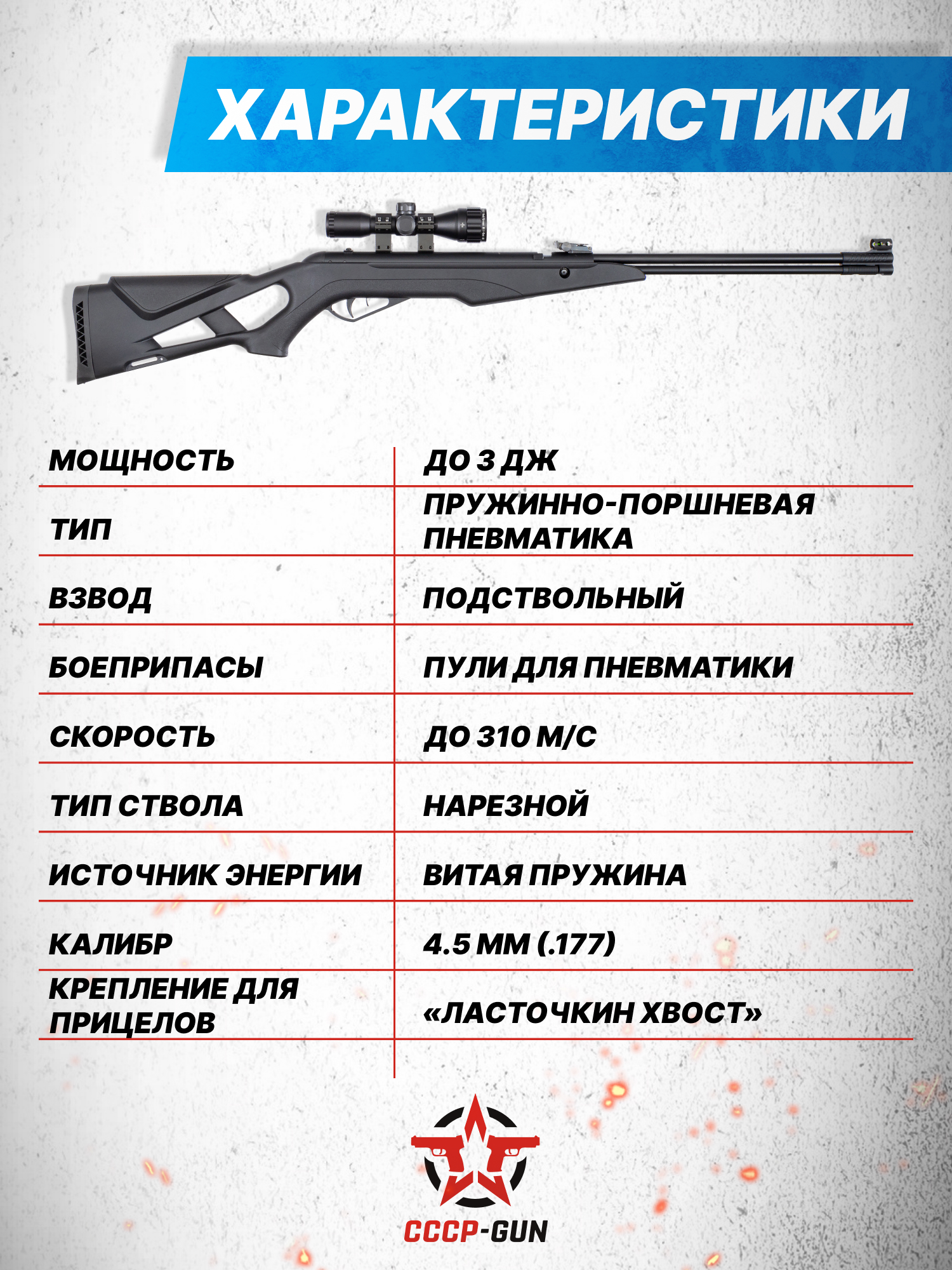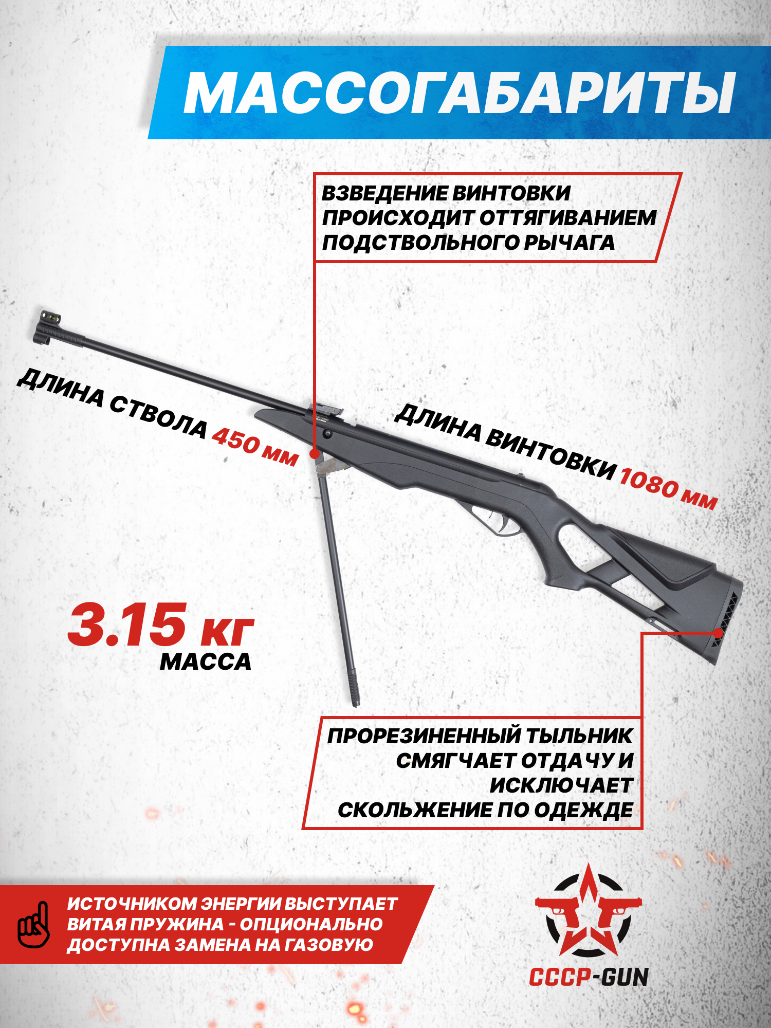 Внимание! Данная модель поставляется в разрешенной мощности для свободного приобретения на территории Российской Федерации. При этом в модели имеется возможность увеличения мощности путем замены части деталей или настройки конструкции, однако не стоит забывать о Федеральном законе «Об оружии» № 150 - ФЗ. В случае необходимости, опираясь на данный закон и руководствуясь им, возможно, потребуется получить разрешение от ЛЛР ГУ МВД России после вмешательства в конструкцию.