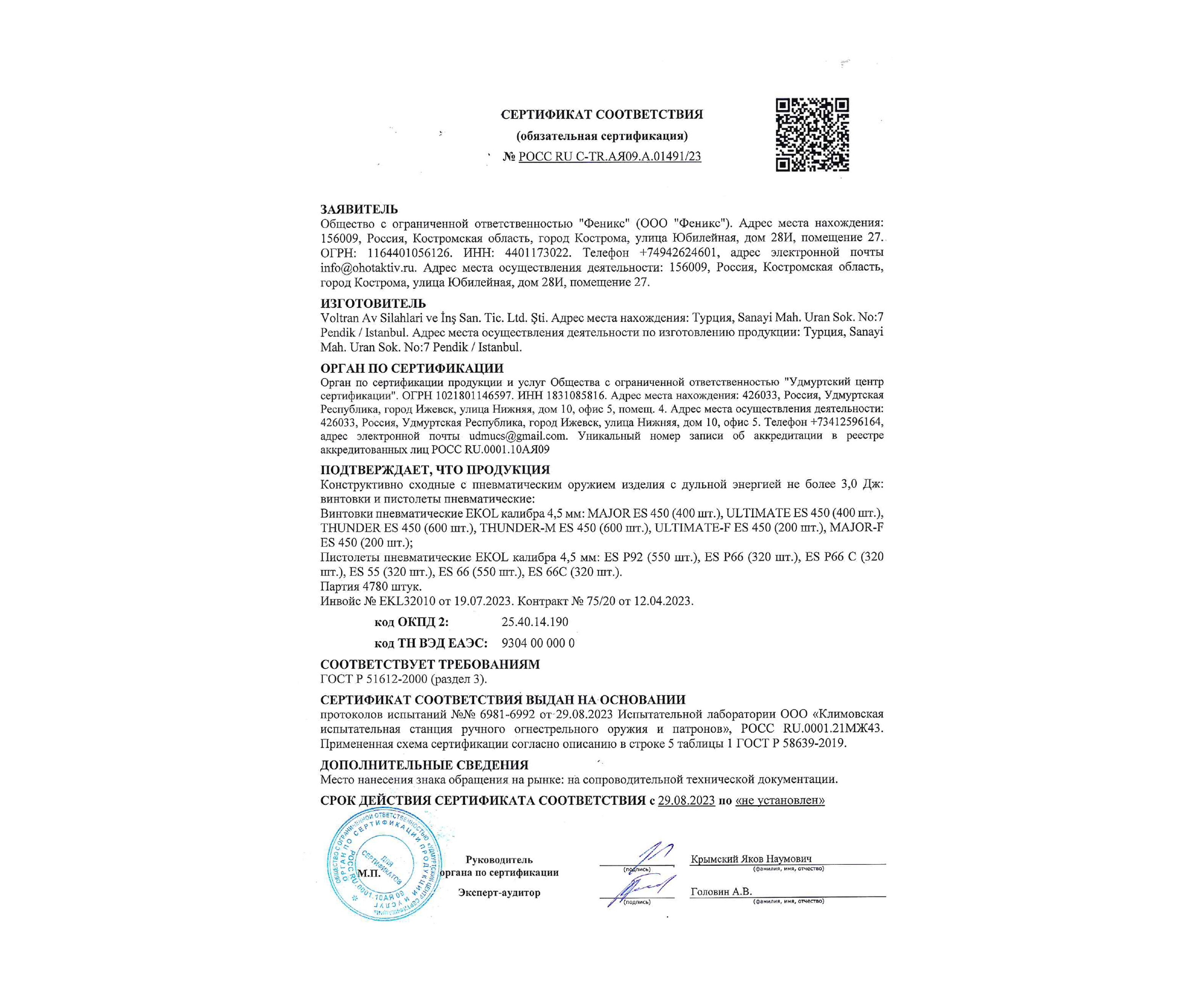 Рассматриваемая Ekol Ultimate винтовка применяется в качестве первичного пневматического оружия для освоения базовых принципов безопасной эксплуатации, а также востребована для развлекательной стрельбы и тренировок на дистанциях открытых и закрытых тиров. Безопасность эксплуатации обозреваемой модели ES450 обеспечивается автоматическим предохранителем, блокирующим ход ударно-спусковых деталей ради предотвращения непреднамеренного выстрела - для деактивации нужно сдвинуть рычаг перед триггером.