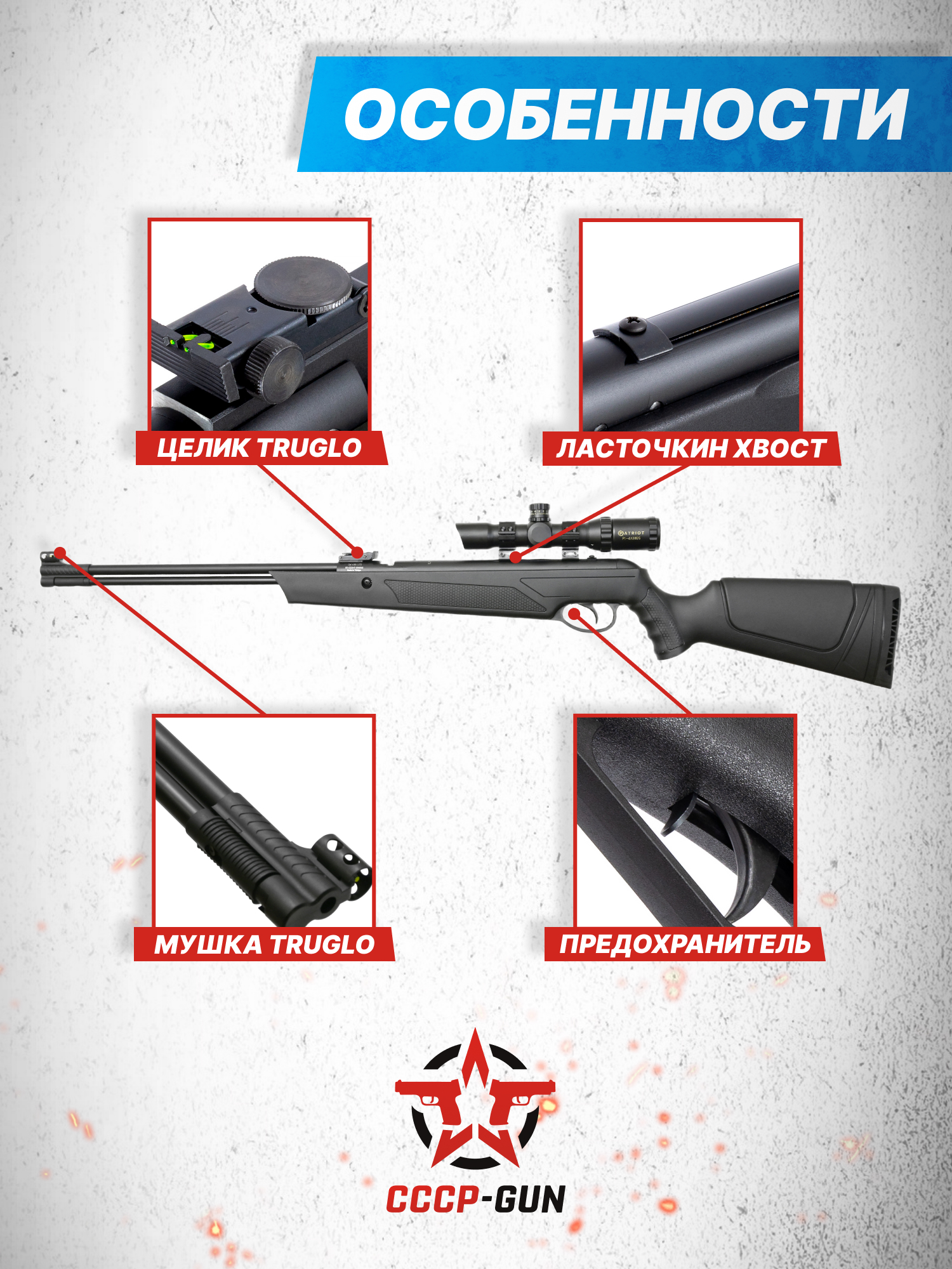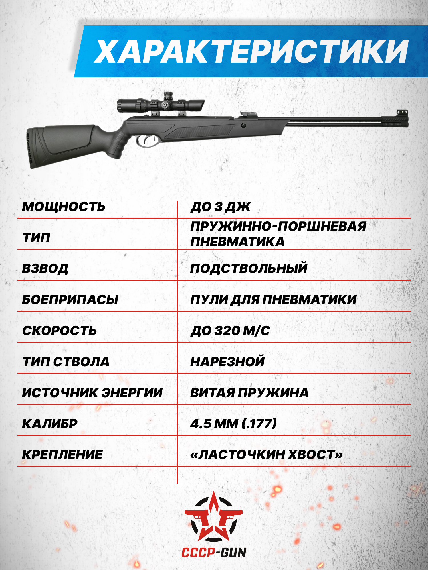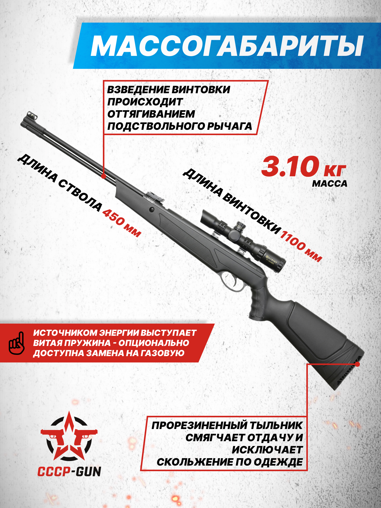 На практике владелец получает максимально точную и мощную пневматику, отличающуюся легким взводом. Нарезной ствол в данном случае изготовлен из отборной стальной заготовки и характеризуется длиной 450 миллиметров. Внутреннее сечение обуславливает выбор боеприпасов, в роли которых используются воланчиковые пули калибром 4.5 мм.