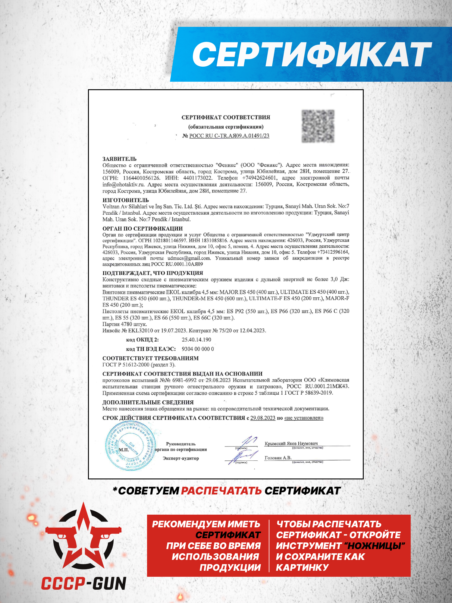 Внимание! Данная модель поставляется в разрешенной мощности для свободного приобретения на территории Российской Федерации. При этом в модели имеется возможность увеличения мощности путем замены части деталей или настройки конструкции, однако не стоит забывать о Федеральном законе «Об оружии» № 150 - ФЗ. В случае необходимости, опираясь на данный закон и руководствуясь им, возможно, потребуется получить разрешение от ЛЛР ГУ МВД России после вмешательства в конструкцию.