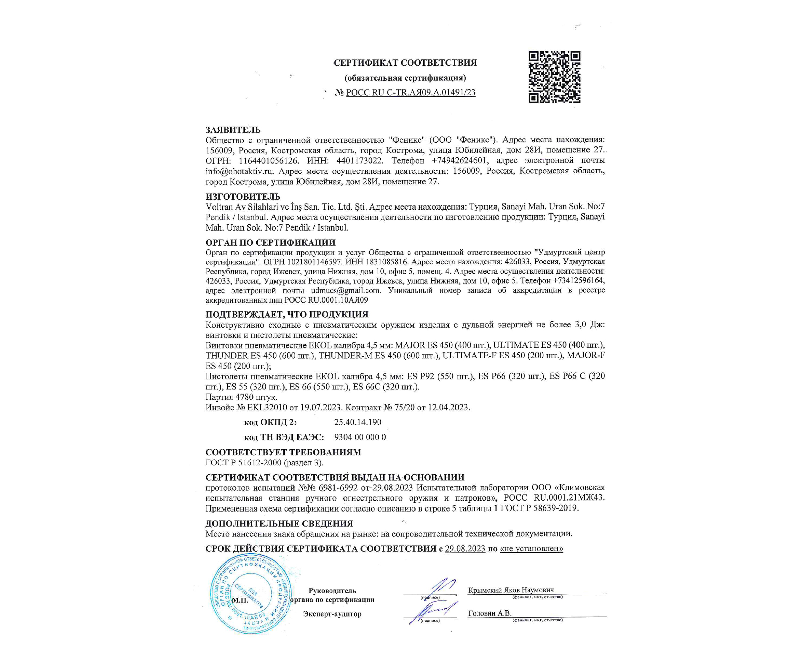 Такого разгона в теории удается добиться в конфигурациях для зарубежного рынка, тогда как на территорию России продукция турецкого завода поставляется в соответствии с законодательно установленными ограничениями мощности 3 Дж. Благодаря указанной особенности пневматика не нуждается в обязательном лицензировании и приобретается свободно по достижении возраста восемнадцати лет.