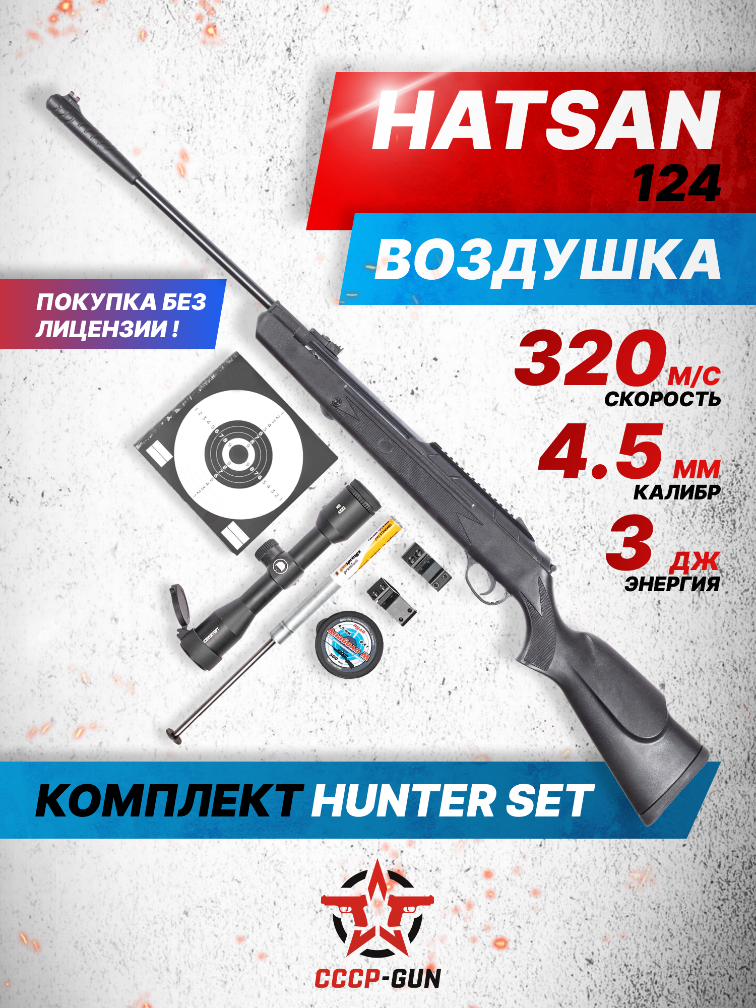 Набор Hatsan 124 Hunter Set 4.5 продается в России свободно, поскольку входящая в список винтовка поставляется производителем на территорию России с разрешенной мощностью в пределах значения 3 Дж. Таким образом, получать лицензию на оружие в Росгвардии покупателям не требуется, характеризуя пневматику как доступный вариант для спорта и развлекательной стрельбы. Чтобы пользователь мог работать с изделием сразу из коробки, в комплект добавлены свинцовые пули, мишени, оптический прицел 4x32 и газовая пружина.