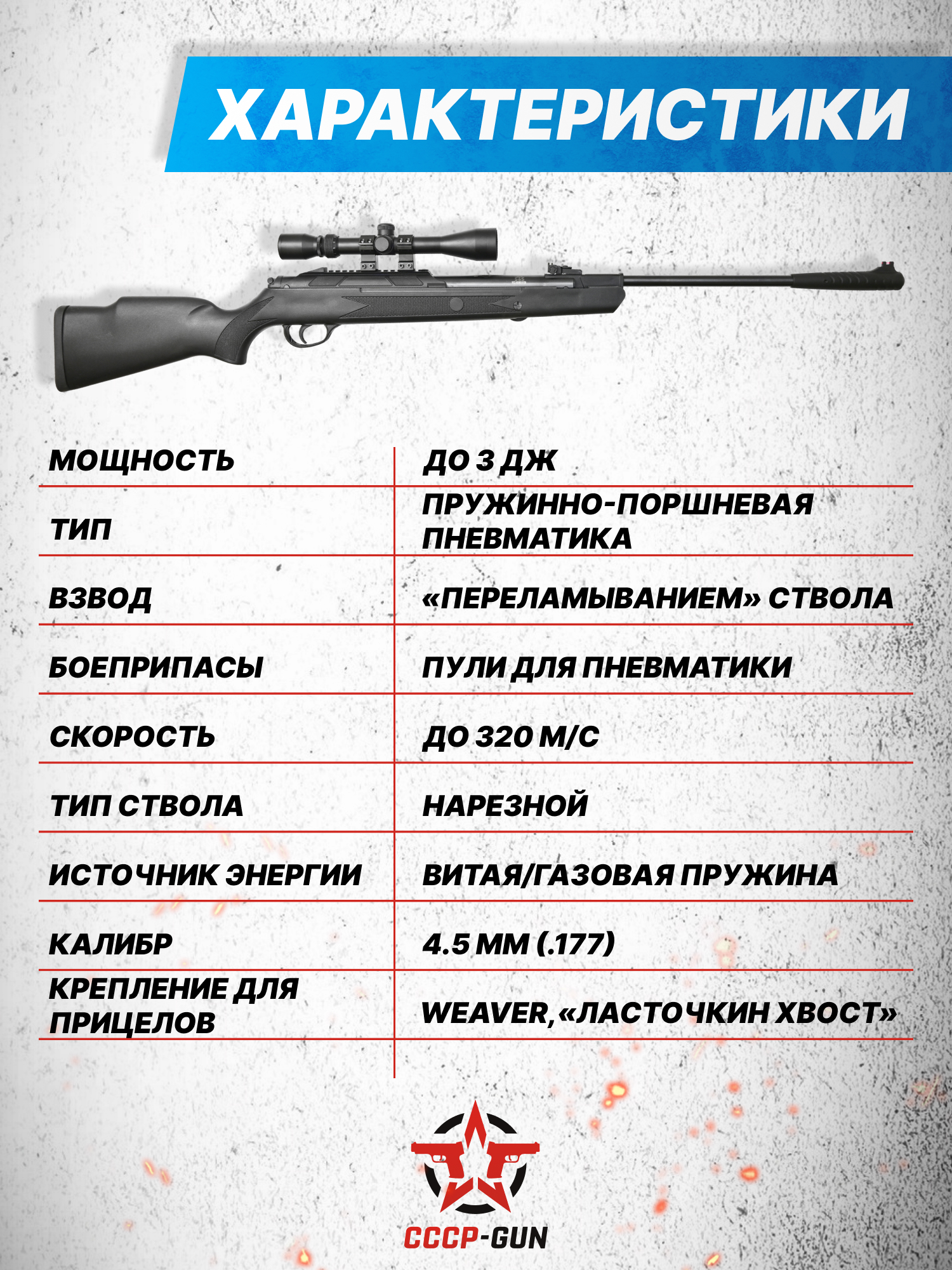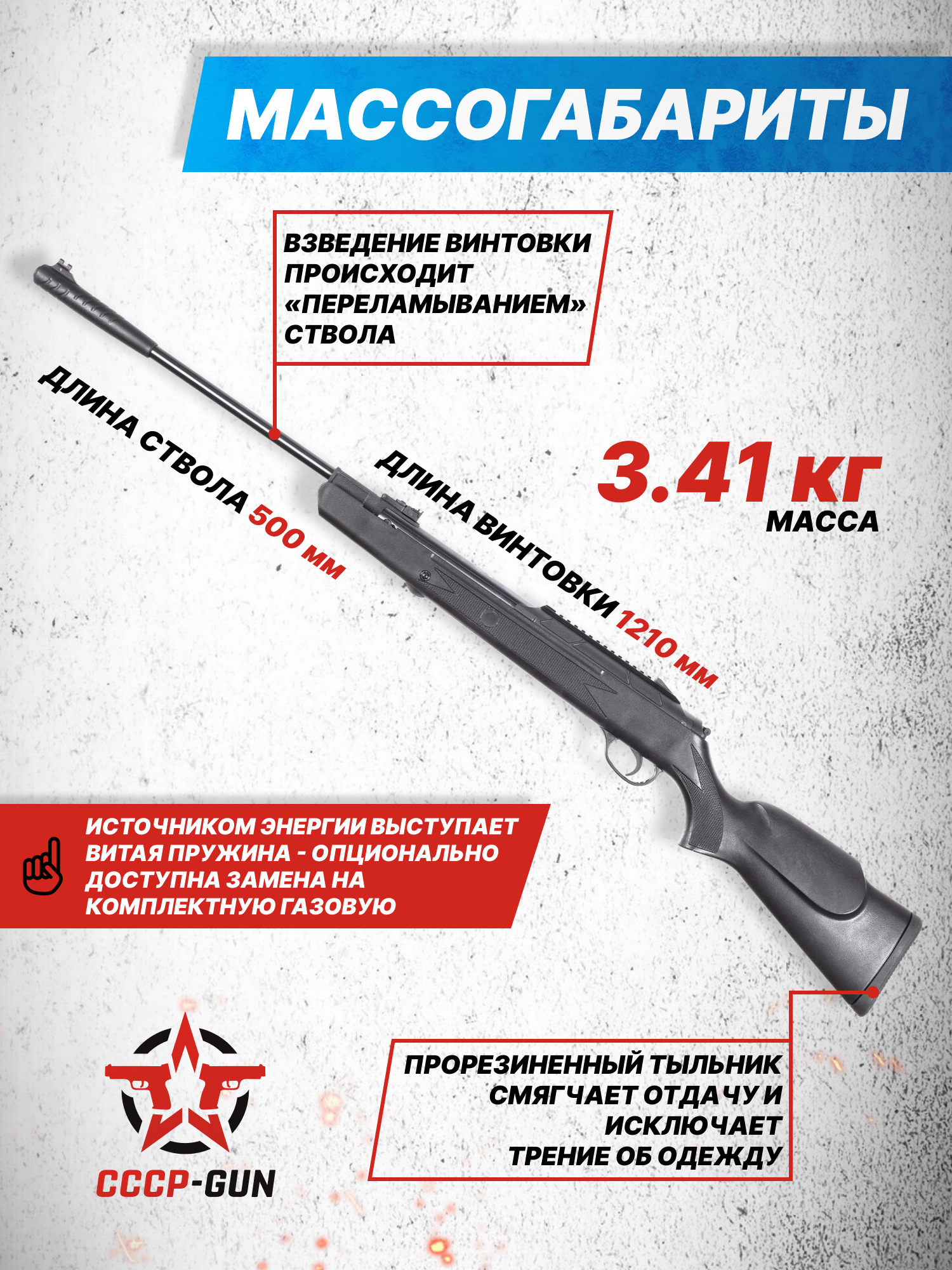 Внимание! Данная модель поставляется в разрешенной мощности для свободного приобретения на территории Российской Федерации. При этом в модели имеется возможность увеличения мощности путем замены части деталей или настройки конструкции, однако не стоит забывать о Федеральном законе «Об оружии» № 150 - ФЗ. В случае необходимости, опираясь на данный закон и руководствуясь им, возможно, потребуется получить разрешение от ЛЛР ГУ МВД России после вмешательства в конструкцию.
