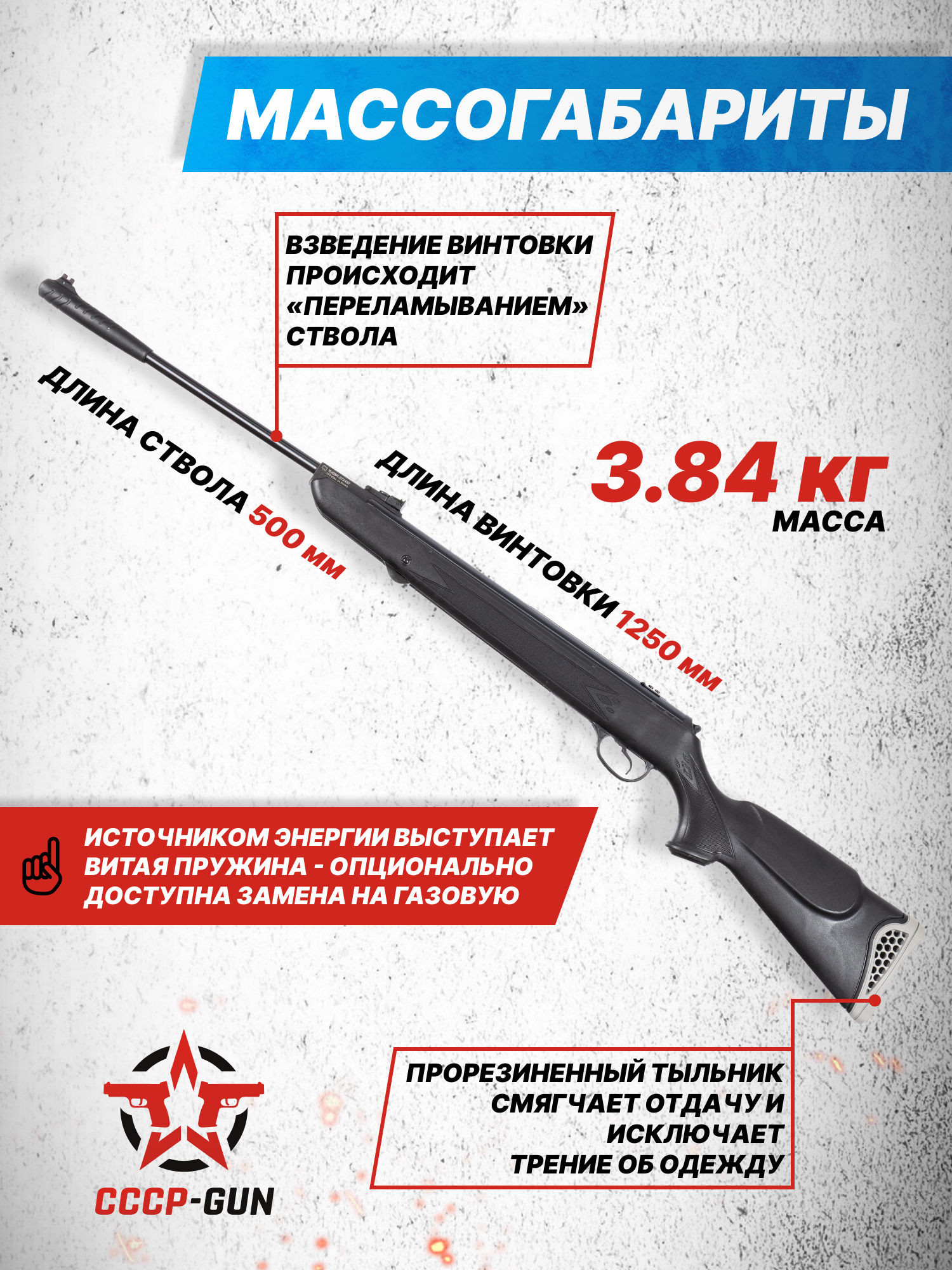 Внимание! Данная модель поставляется в разрешенной мощности для свободного приобретения на территории Российской Федерации. При этом в модели имеется возможность увеличения мощности путем замены части деталей или настройки конструкции, однако не стоит забывать о Федеральном законе «Об оружии» № 150 - ФЗ. В случае необходимости, опираясь на данный закон и руководствуясь им, возможно, потребуется получить разрешение от ЛЛР ГУ МВД России после вмешательства в конструкцию.