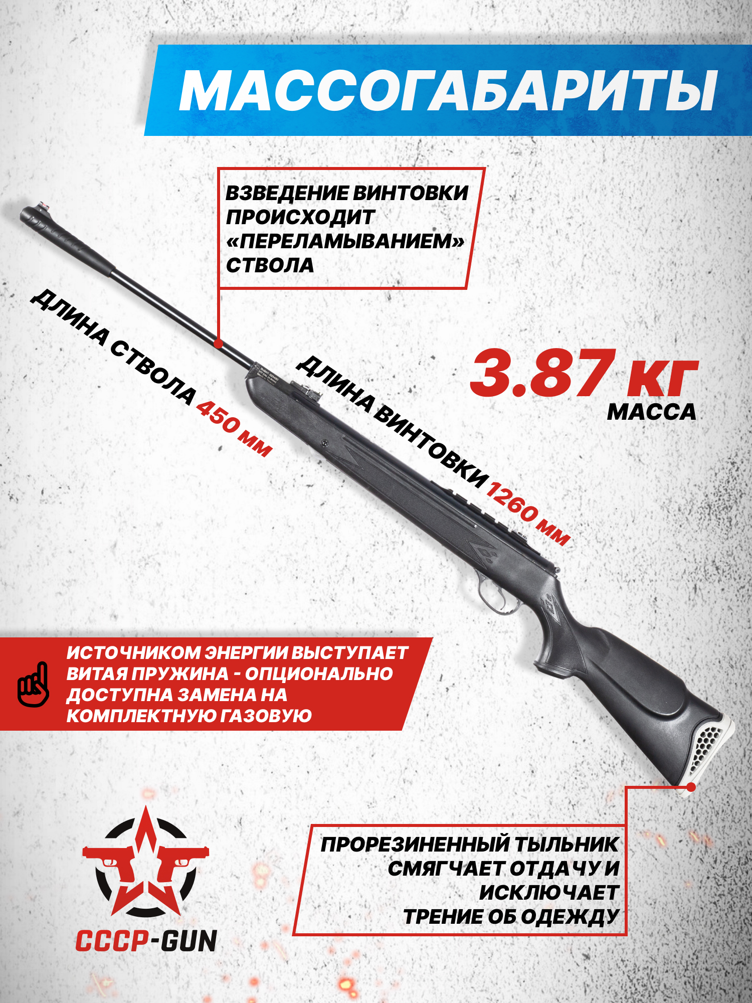 Усиленная вариация Hatsan 125 4.5 мм способна разгонять свинцовые пули воланчикового вида до скорости в 380 метров в секунду. Нарезной стальной бланк длиной 450 миллиметров помогает достигать высокой точности даже при работе по отдаленным целям. Чтобы зарядить и взвести оружие, указанный ствол складывается переломным способом, после чего снаряд устанавливается в показавшийся отсек и узел возвращается в изначальное положение.