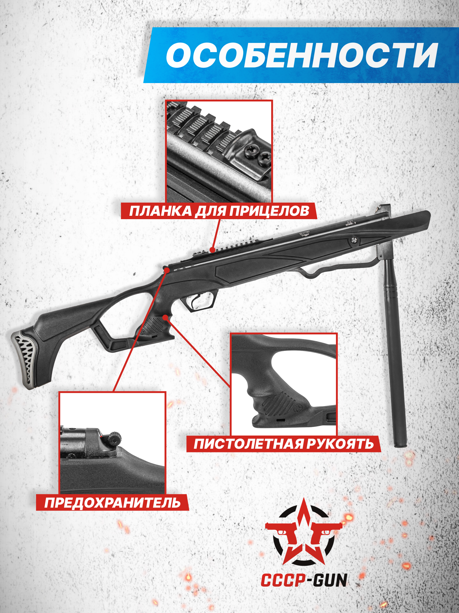 Внимание! Данная модель поставляется в разрешенной мощности для свободного приобретения на территории Российской Федерации. При этом в модели имеется возможность увеличения мощности путем замены части деталей или настройки конструкции, однако не стоит забывать о Федеральном законе «Об оружии» № 150 - ФЗ. В случае необходимости, опираясь на данный закон и руководствуясь им, возможно, потребуется получить разрешение от ЛЛР ГУ МВД России после вмешательства в конструкцию.