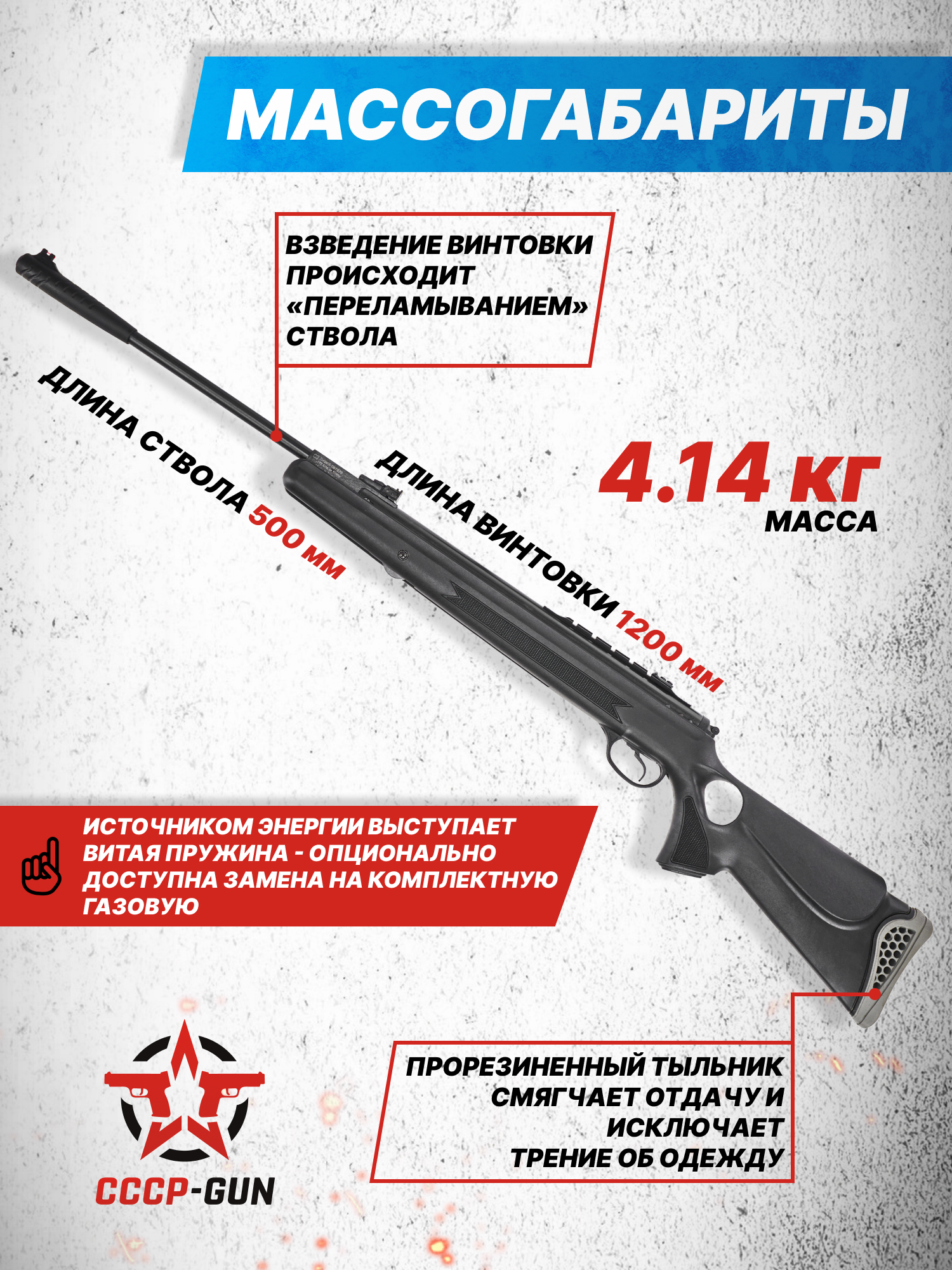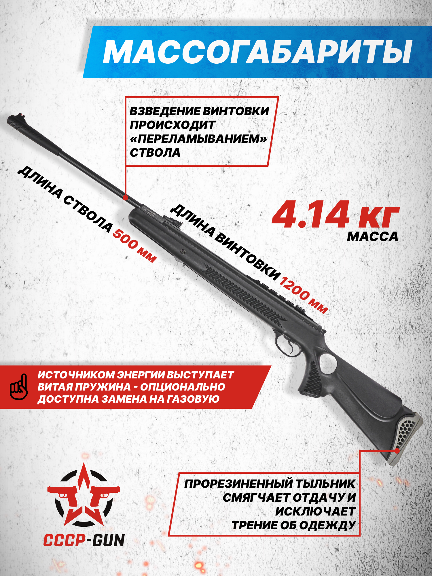 Внимание! Данная модель поставляется в разрешенной мощности для свободного приобретения на территории Российской Федерации. При этом в модели имеется возможность увеличения мощности путем замены части деталей или настройки конструкции, однако не стоит забывать о Федеральном законе «Об оружии» № 150 - ФЗ. В случае необходимости, опираясь на данный закон и руководствуясь им, возможно, потребуется получить разрешение от ЛЛР ГУ МВД России после вмешательства в конструкцию.