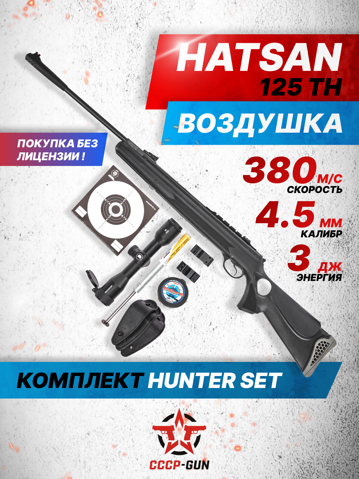 Hatsan 125 TH Hunter Set 4.5 представляет собой комплект из винтовки переломного принципа действия, оптического прицела, газовой пружины, мишеней, а также банки с боеприпасами. На территории России представленный набор продается свободно и не требует от покупателя обращения в Росгвардию для получения оружейной лицензии. Доступно это благодаря тому, что фирма поставляет изделия только с разрешенной законом дульной энергией в пределах значения 3 Дж.