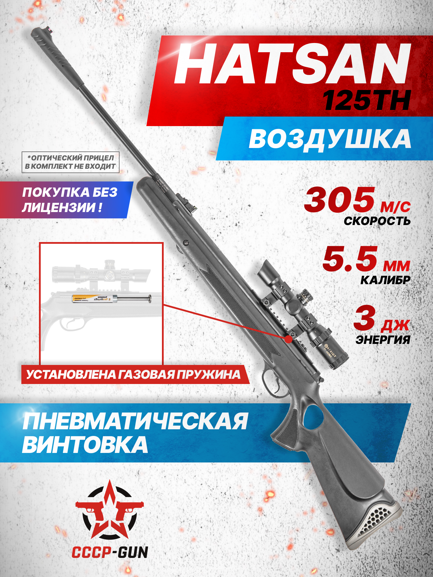 В заводском варианте исполнения Хатсан 5.5 переломка 125ТН оснащена регулируемым целиком и мушкой Truglo с фибероптической нитью. При этом, наличие над компрессором винтовки универсальной монтажной планки дает стрелку оснастить оружие коллиматором или оптическим прицельным приспособлением, как под Weaver 22 мм, так и под «Ласточкин Хвост» с шириной 11 мм. Помимо этого, снижение отдачи выстрела за счет замены пружины открывает возможность использования большего количества вариантов оптики без риска их повреждения при выстреле.
