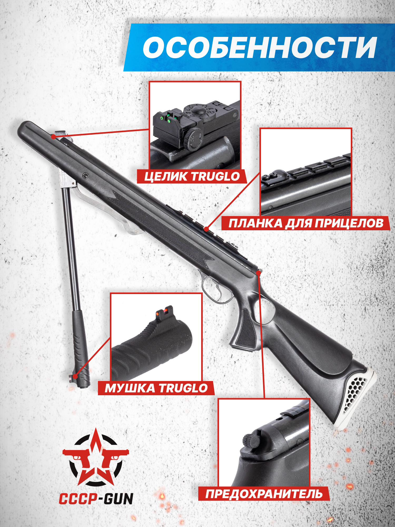 Поверхность рукояти и цевья сделаны с текстурированием, которое предотвращает соскальзывание руки даже в перчатках. Такая конструкция обеспечивает стабильную вкладку и снижает утомляемость при стрельбе стоя. Встроенный предохранитель предотвращает случайный выстрел, блокируя спусковой крючок при взводе.