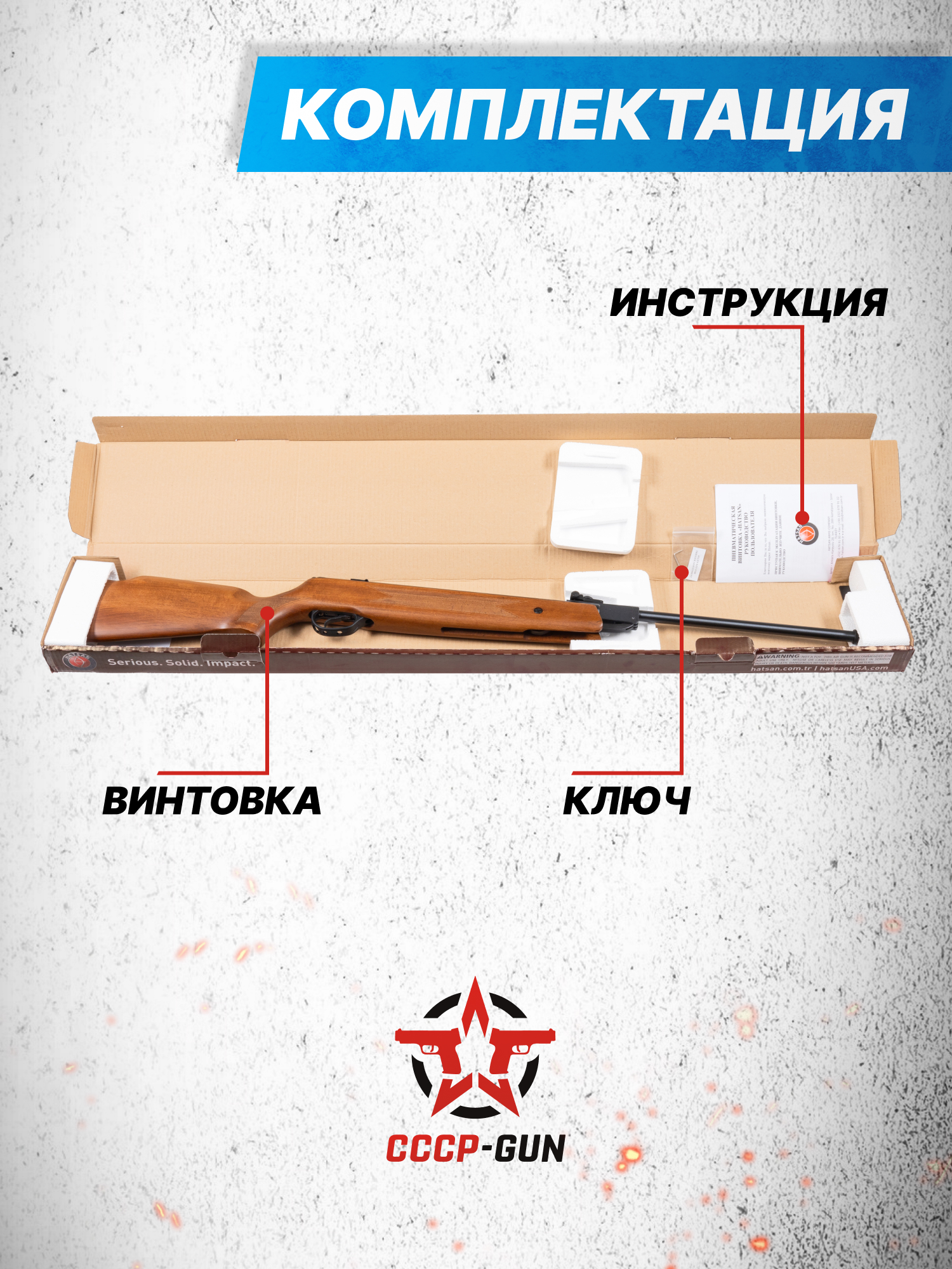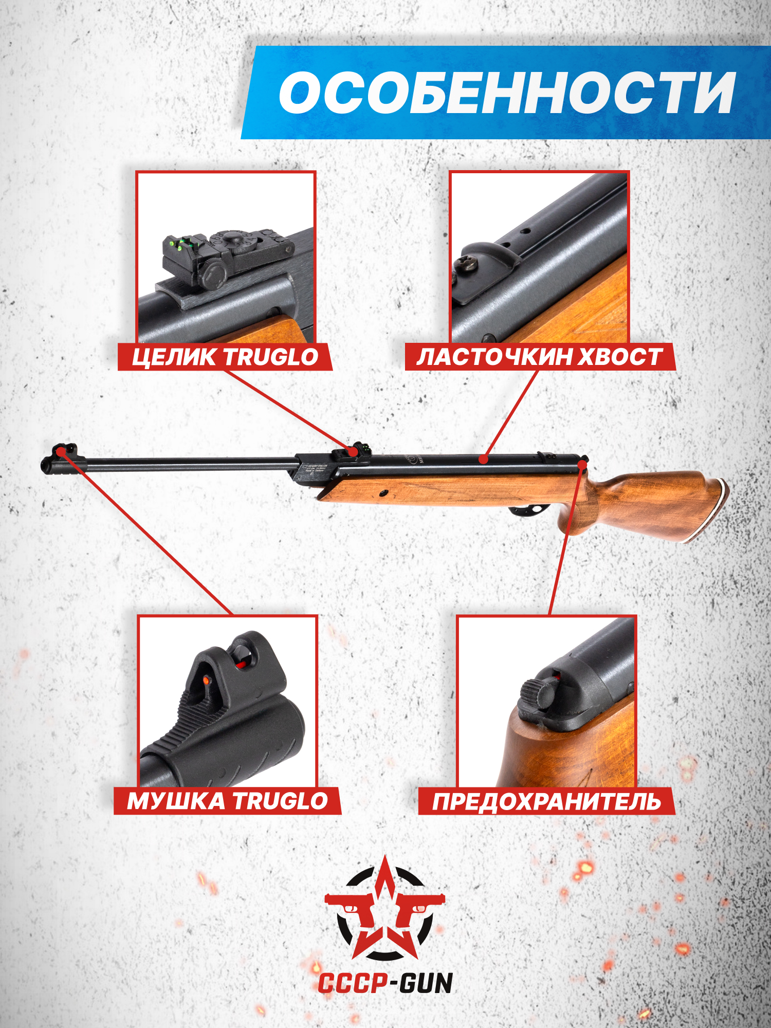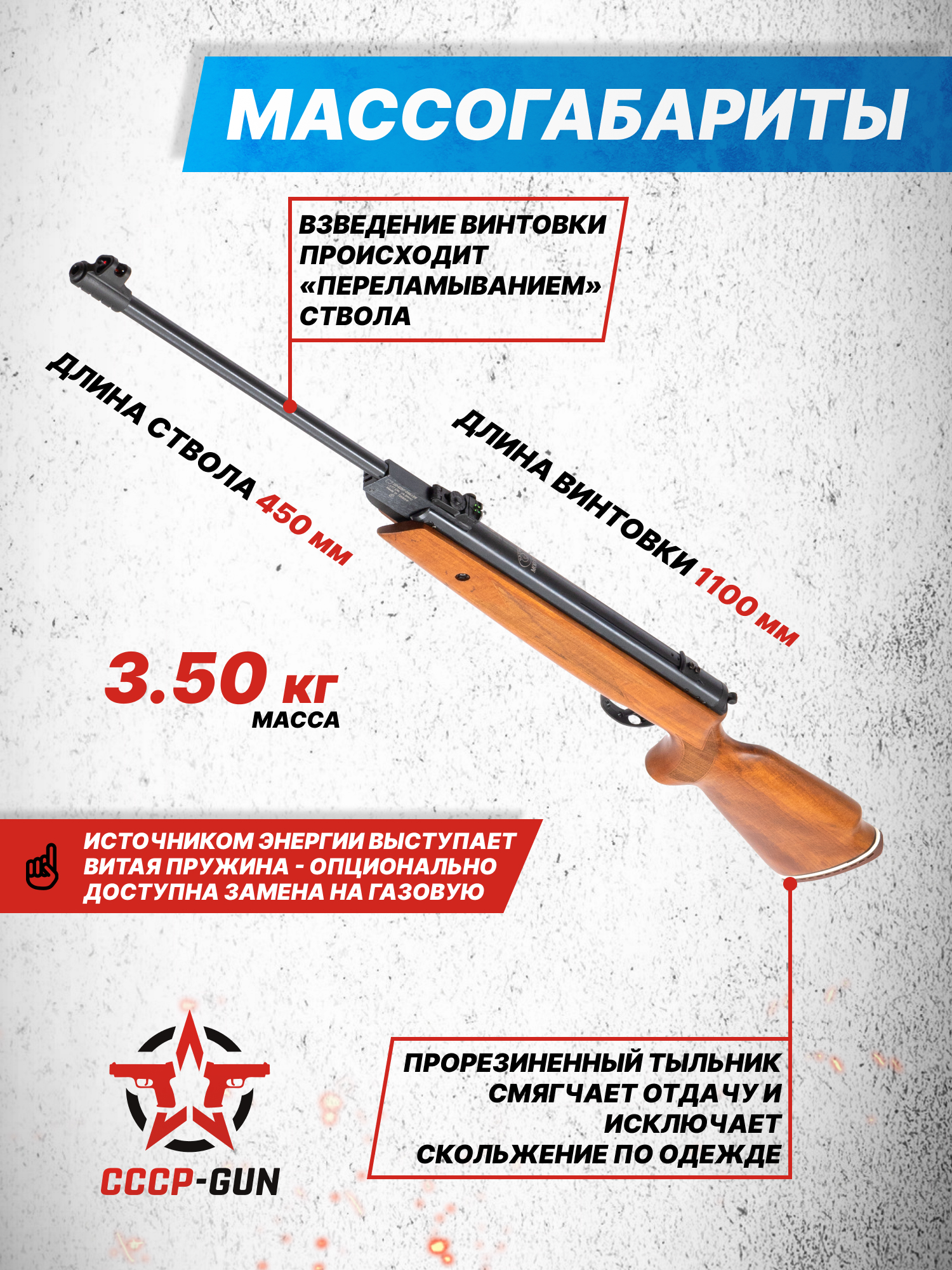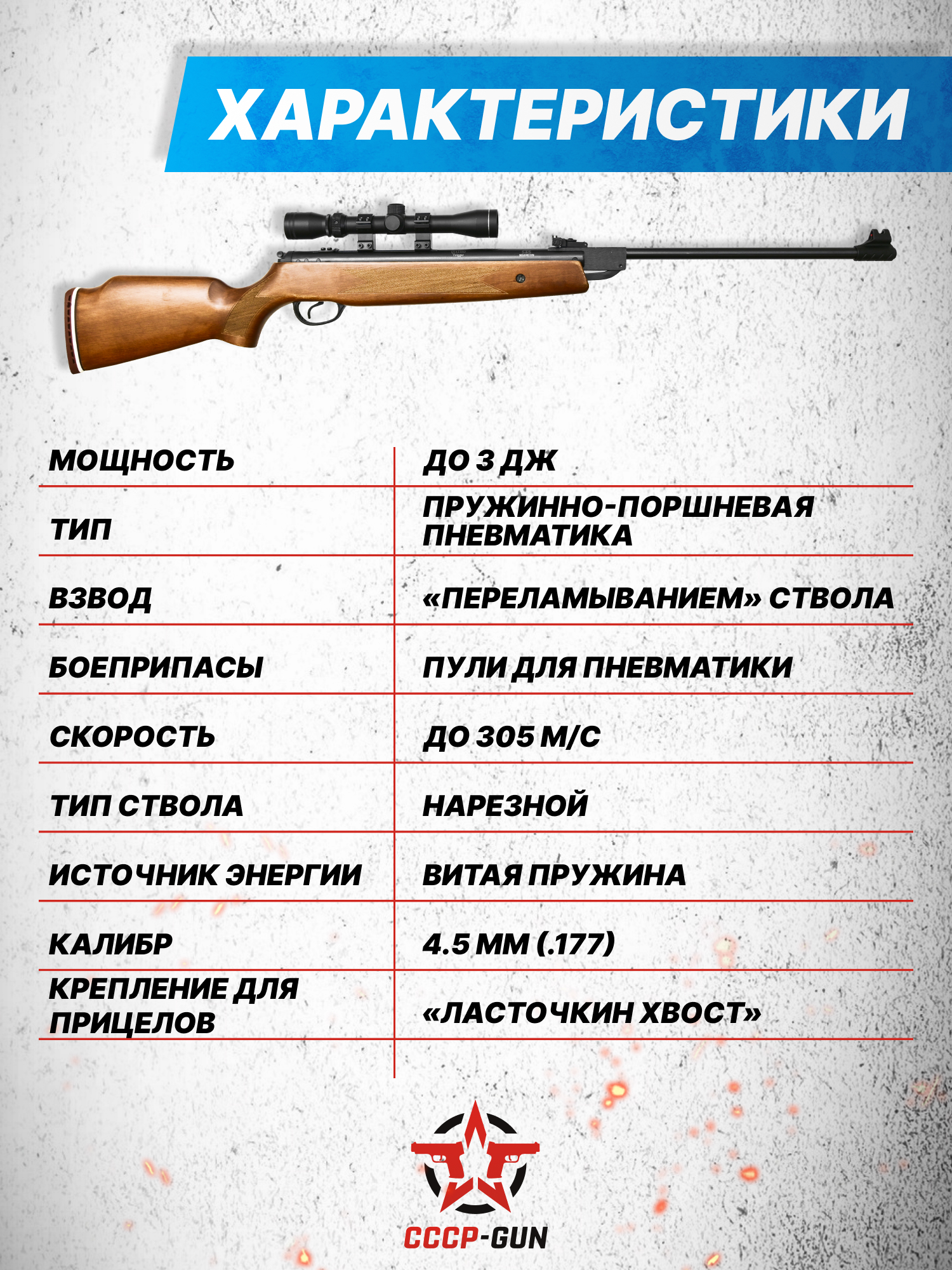 Внимание! Данная модель поставляется в разрешенной мощности для свободного приобретения на территории Российской Федерации. При этом в модели имеется возможность увеличения мощности путем замены части деталей или настройки конструкции, однако не стоит забывать о Федеральном законе «Об оружии» № 150 - ФЗ. В случае необходимости, опираясь на данный закон и руководствуясь им, возможно, потребуется получить разрешение от ЛЛР ГУ МВД России после вмешательства в конструкцию.