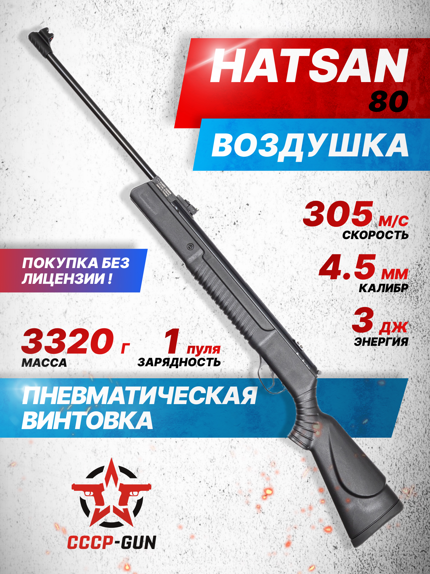 Пневматические винтовки Hatsan 80 ввозятся на территорию России соблюдая законодательство, поэтому дульная энергия моделей составляет 3 Джоуля. Эта характеристика дает право свободно приобретать обозреваемое изделие без получения специализированных разрешений на владение оружием. Таким образом представленная пневматика становится правильным вариантом для начинающих пользователей.