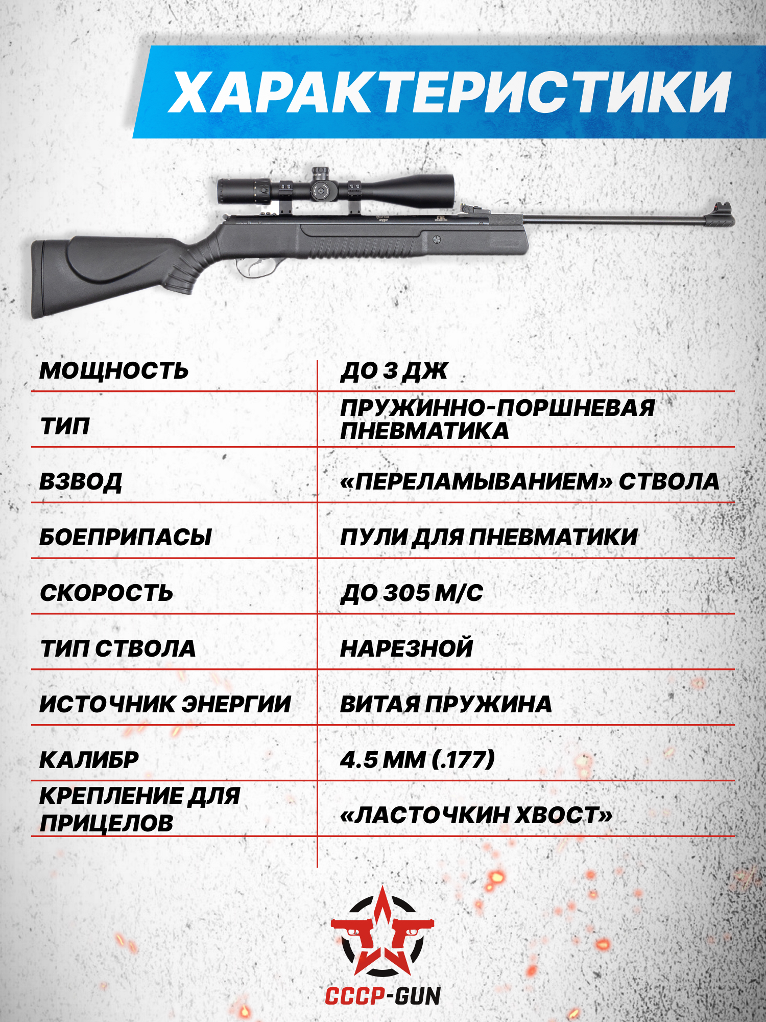 Стреляет винтовка свинцовыми боеприпасами с калибром 4.5 миллиметров, а для повышения стабильности производитель рекомендует использовать легкие снаряды Диаболо в форме воланчика. Усиленный вариант оружия разгоняет такие пули до скорости, превышающей 305 метров в секунду. Благодаря этому пневматика потенциально обладает серьезными показателями мощности, несмотря на простоту механизма.