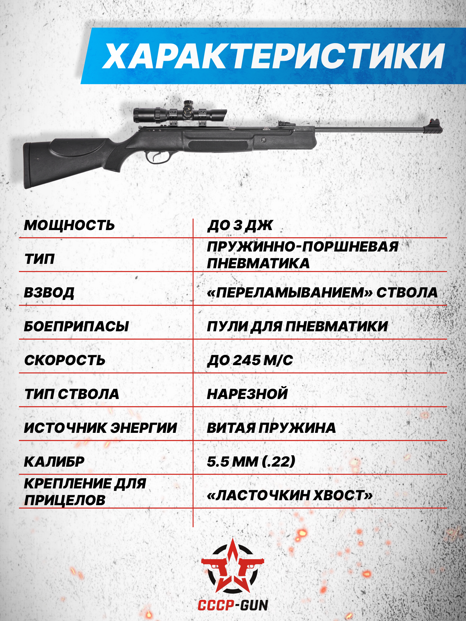 Конструкция рассчитана под однозарядную стрельбу снарядами из свинца калибра 5.5 мм. В базовой версии винтовка ограничена по мощности до 3 Джоулей, это позволяет приобрести ее без оформления разрешений. Однако при технической доработке изделие развивает скорость "воланчика" до 245 метров в секунду.
