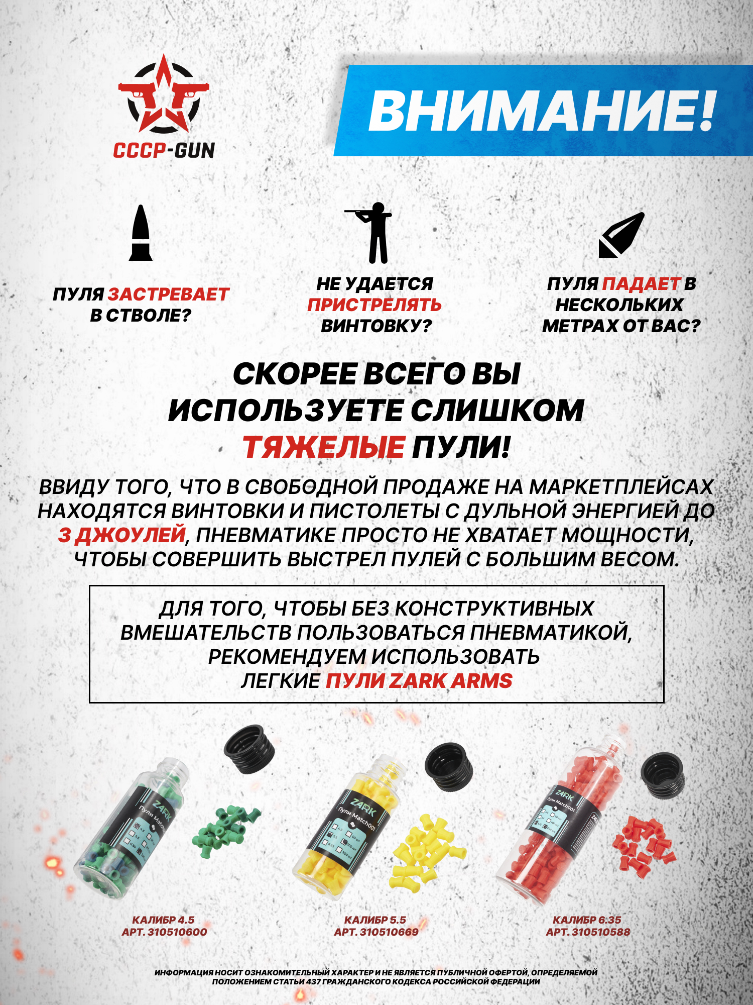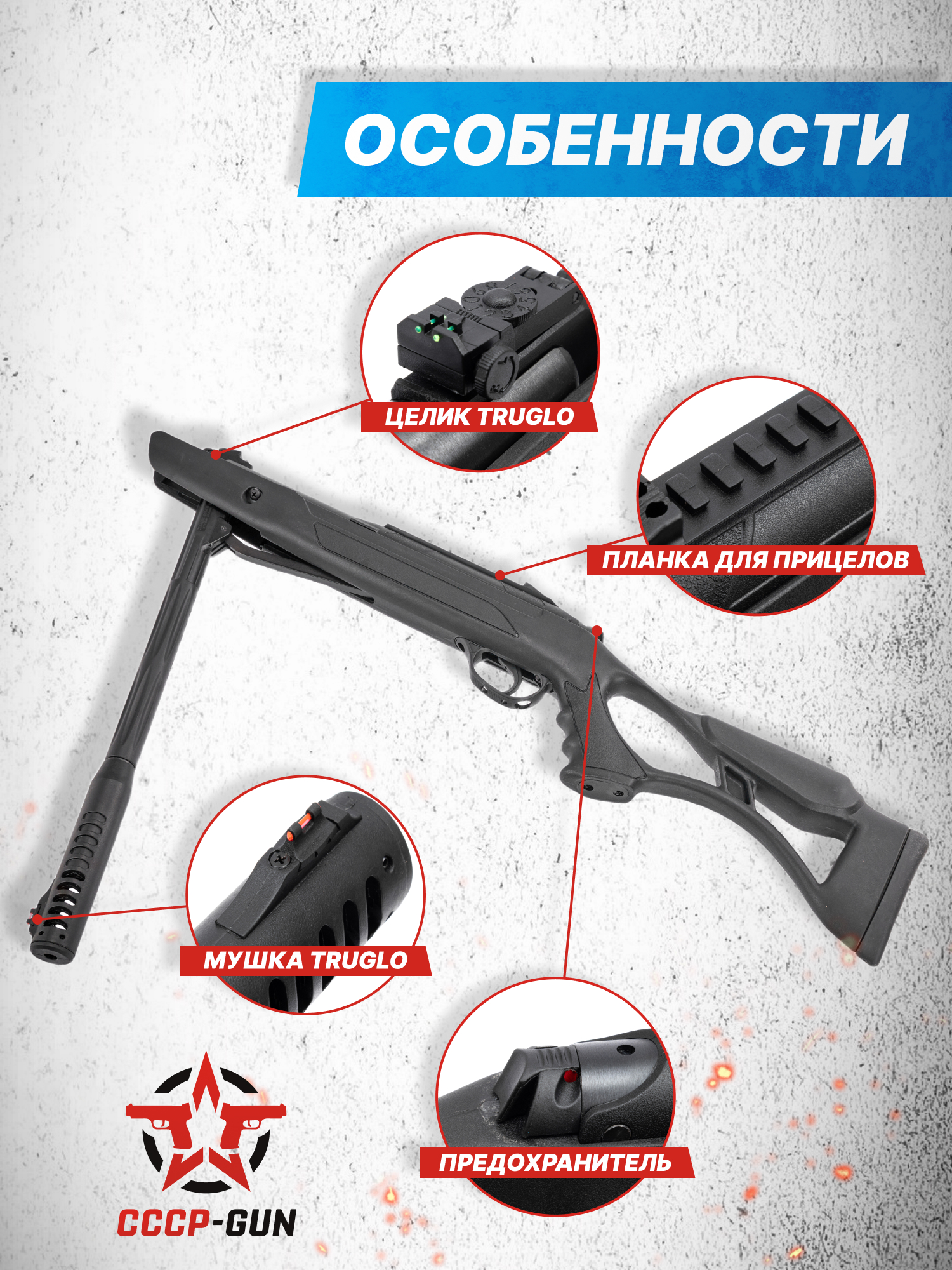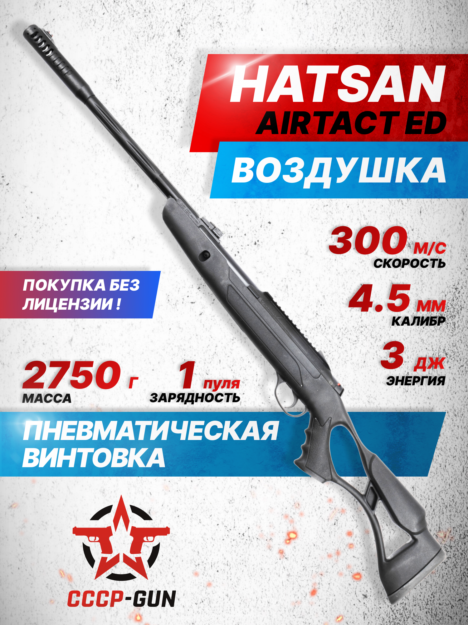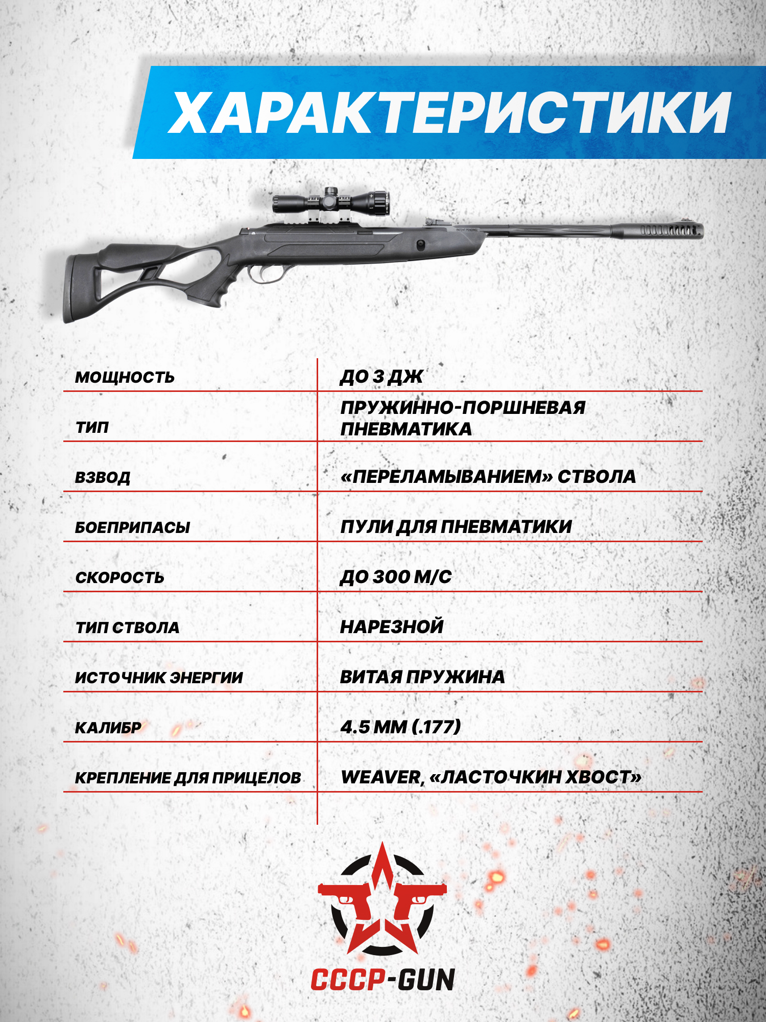 Внимание! Данная модель поставляется в разрешенной мощности для свободного приобретения на территории Российской Федерации. При этом в модели имеется возможность увеличения мощности путем замены части деталей или настройки конструкции, однако не стоит забывать о Федеральном законе «Об оружии» № 150 - ФЗ. В случае необходимости, опираясь на данный закон и руководствуясь им, возможно, потребуется получить разрешение от ЛЛР ГУ МВД России после вмешательства в конструкцию.