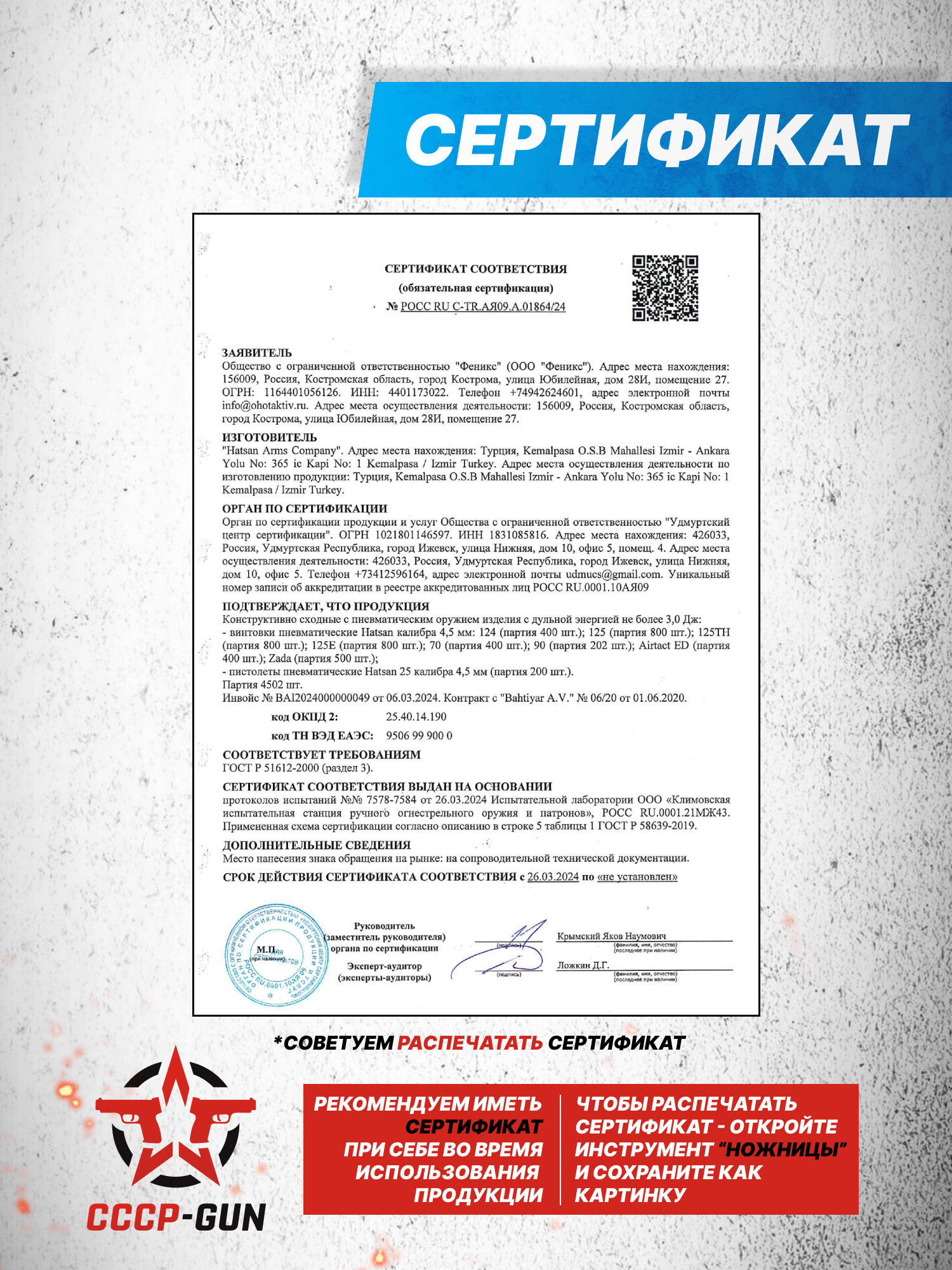 Описываемое изделие может свободно продаваться на территории РФ, так как его дульная энергия составляет 3 Джоуля, что указано в сертификате. При модернизации винтовки, скорость полета пули может достигать 300 метров в секунду. Такое решение позволяет покупать эту модель без лицензии, но при этом остается возможность доработки оружия под конкретные задачи, которые необходимы, например, спортсменам.