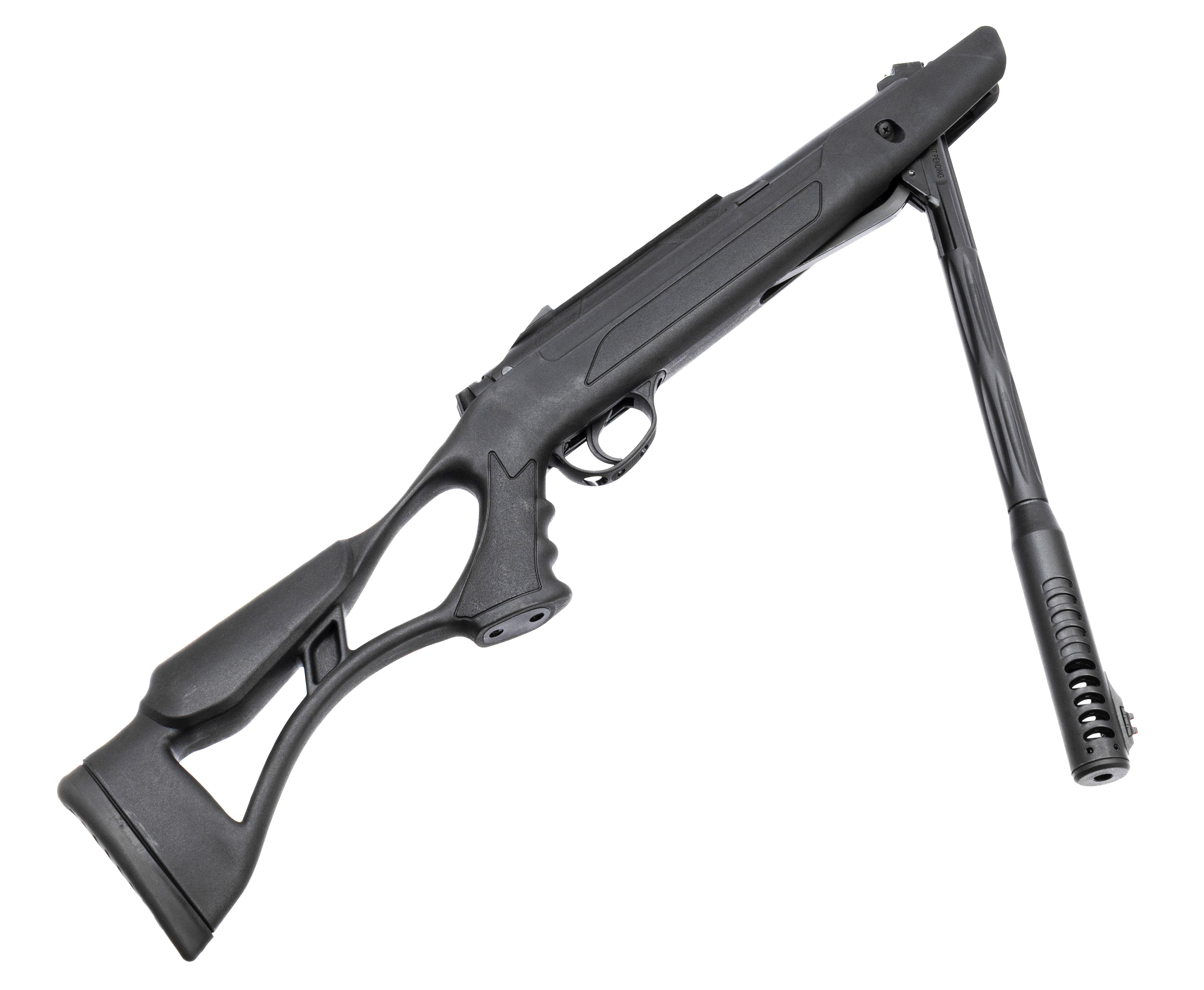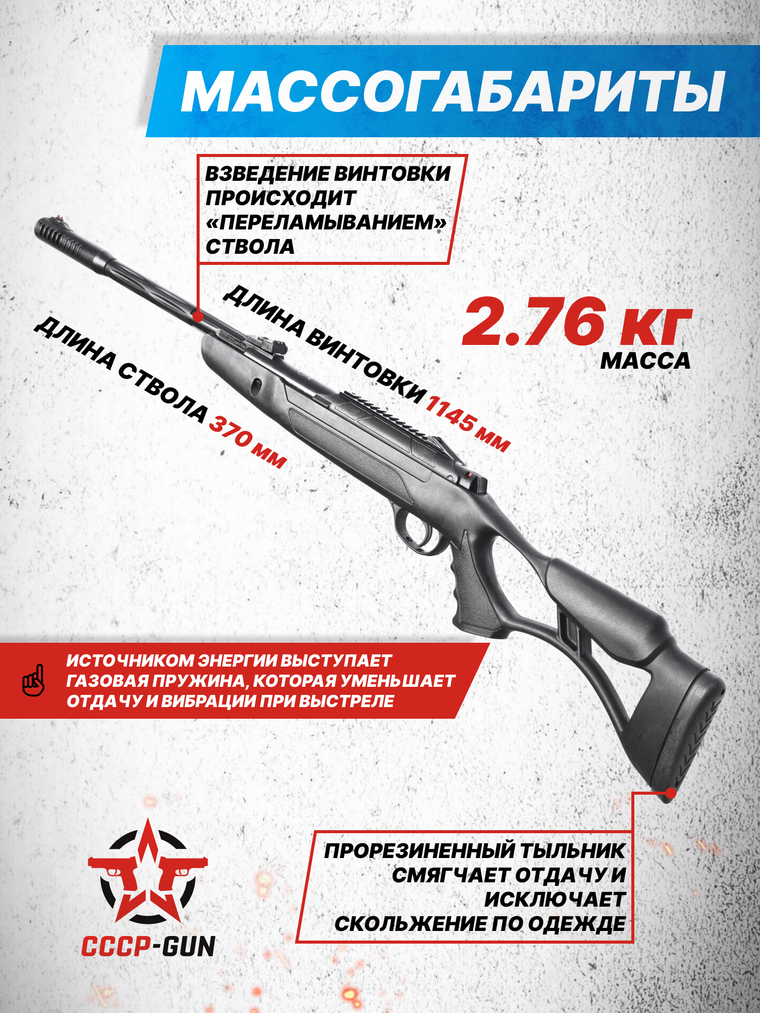 Также представленный образец пневматики выделяется наличием газовой пружины, за счет которой лучше раскрывается мощностной потенциал винтовки, а также снижается импульс отдачи, что положительно сказывается на показателях точности стрельбы. Взвод описанного механизма необходимо производить перед каждым выстрелом, путем складывания ствола до упора при помощи соответствующего узла.